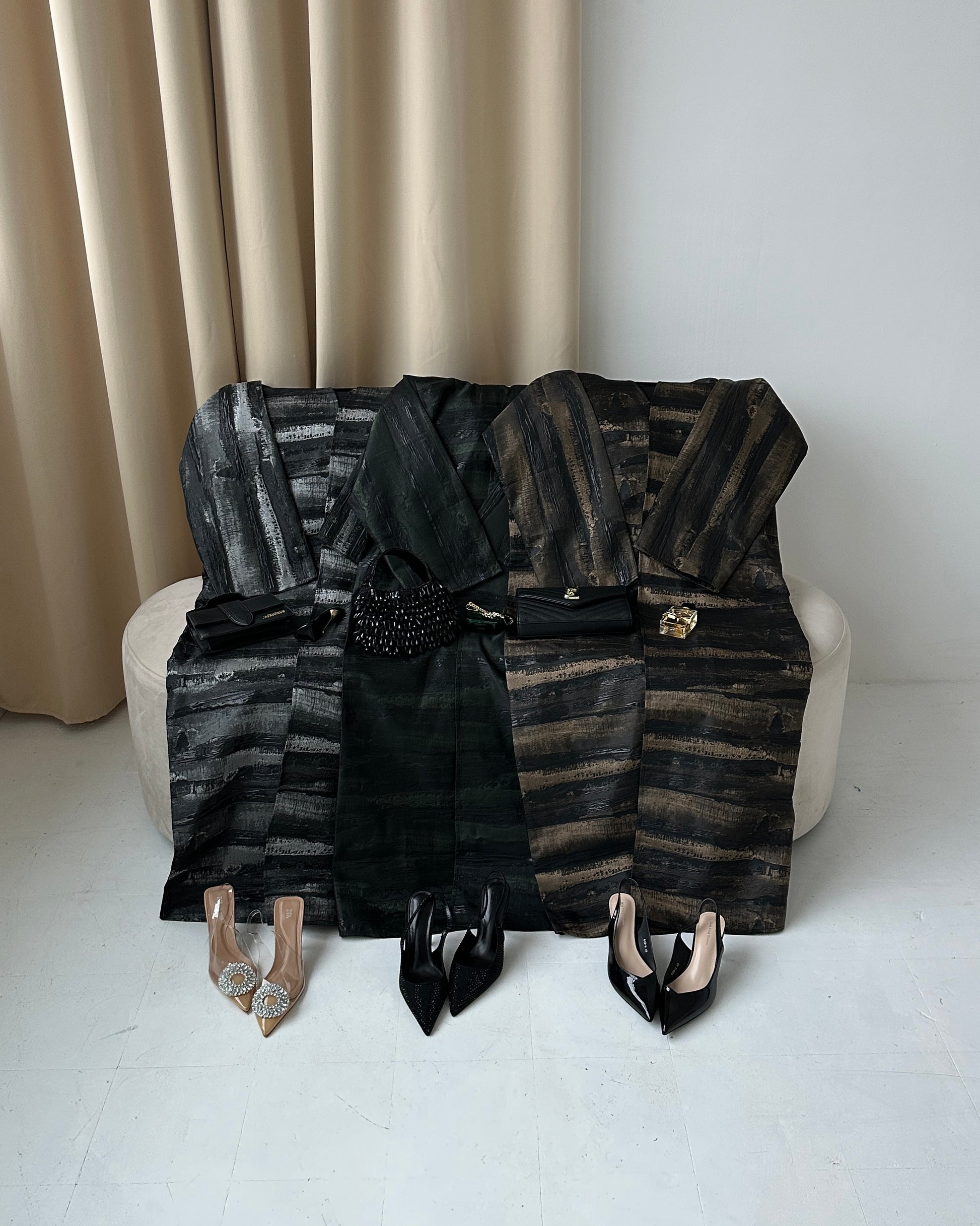 Elevate your wardrobe with this luxurious jacquard abaya, designed for timeless elegance and effortless sophistication. This exquisite design seamlessly blends textures for a refined and contemporary look. The front is crafted from luxurious jacquard fabric, showcasing intricate detailing and elegance, while the back is made from smooth, high-quality black fabric for added comfort and sophistication.