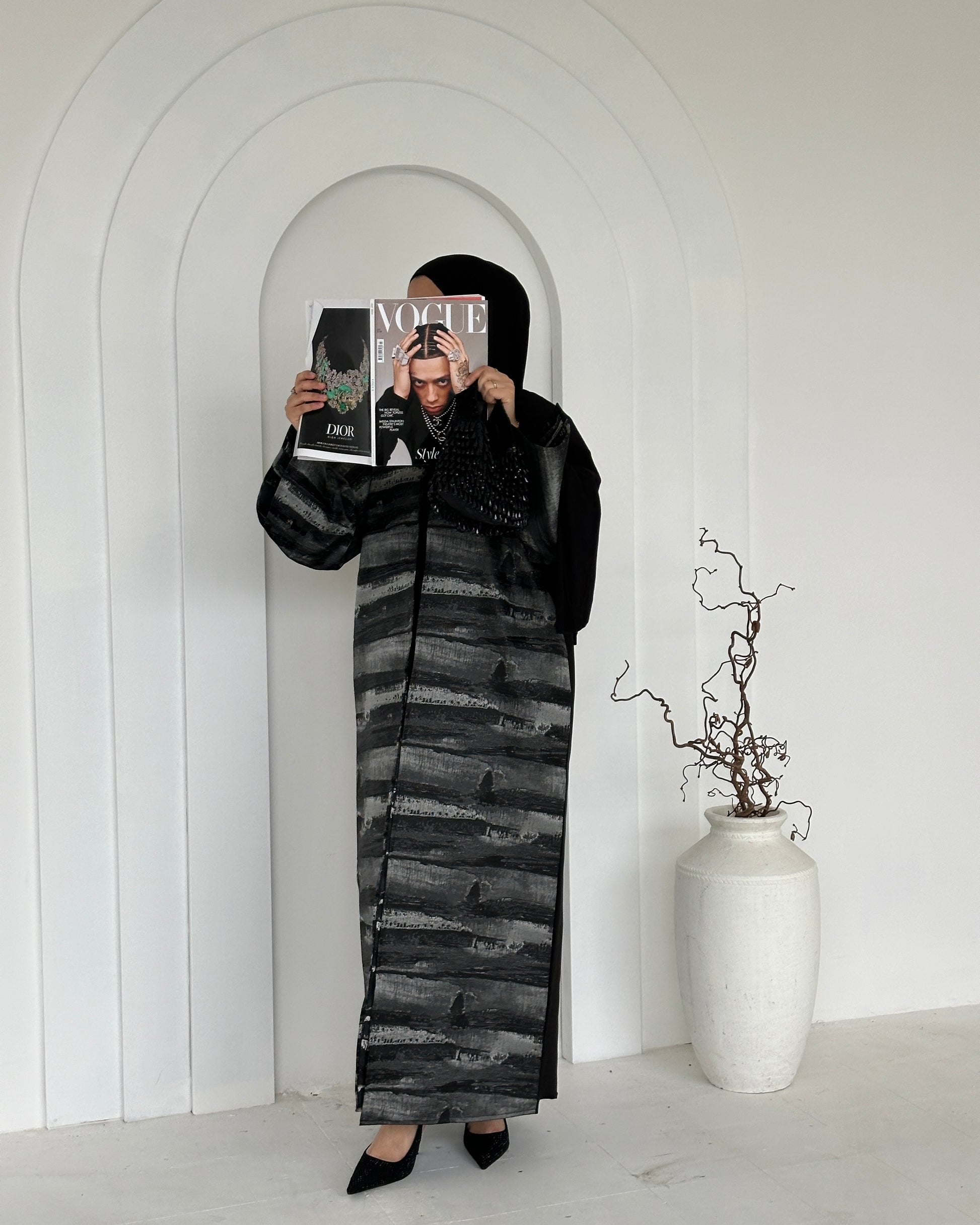 Designed with an open-front silhouette, this abaya offers versatility and effortless grace. The structured fabric provides a chic oversized look. Split sleeves for added flair. It comes with a complimentary premium Korean chiffon hijab, making it the perfect choice for any elegant occasion.