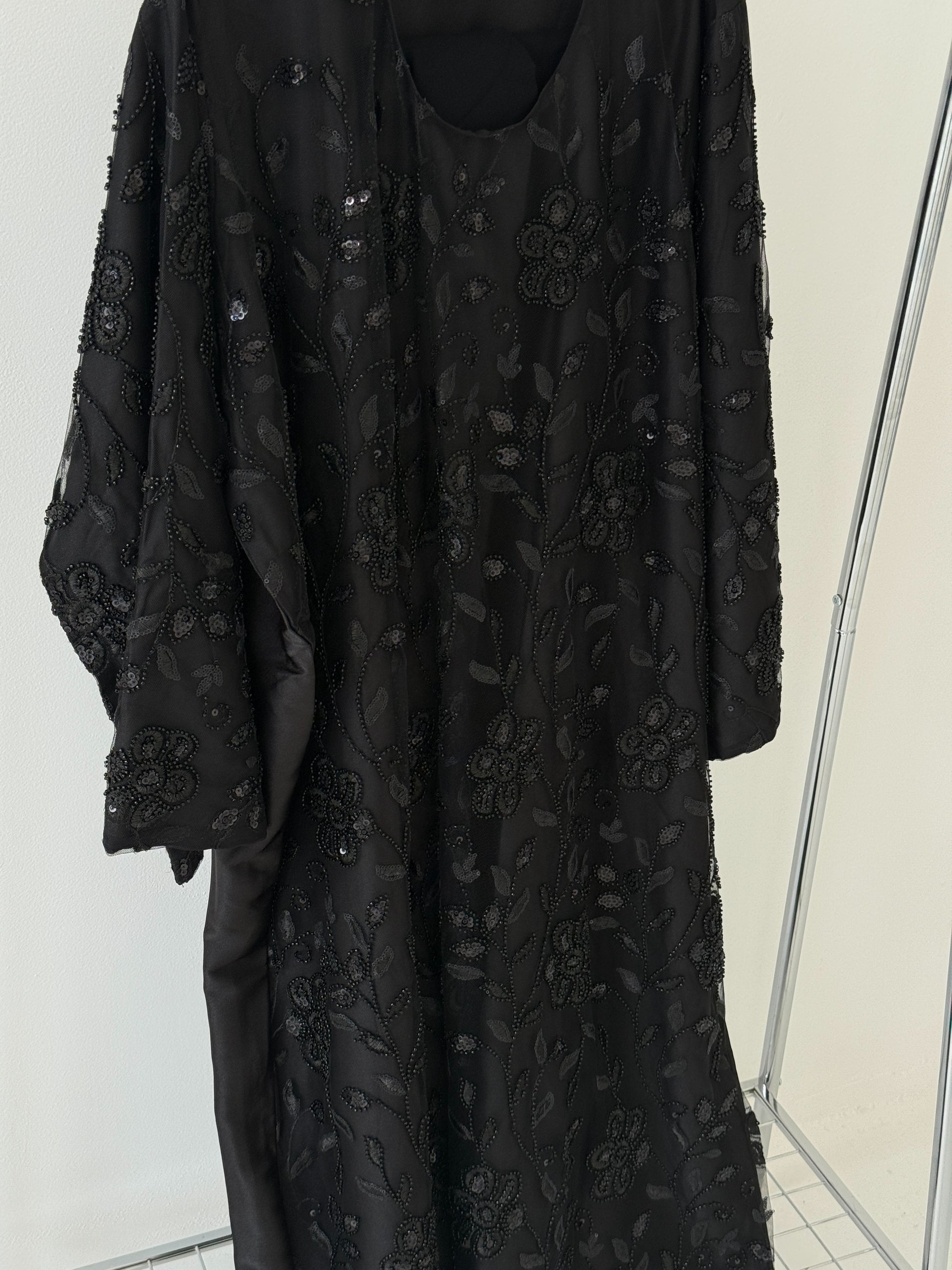Turn heads this season with our beautifully crafted ‘Raani’ Abaya. Designed with both style and comfort in mind, it’s fully lined with high quality candy crepe fabric - known for its lightweight feel and silky smooth texture. This closed style abaya features an intricate beaded and sequin net design that adorns the front panel and sleeves, adding a delicate sparkle with every movement. Whether you're dressing for Eid or a special occasion, this abaya promises timeless sophistication and effortless modesty. Comes with a complimentary premium chiffon hijab.
