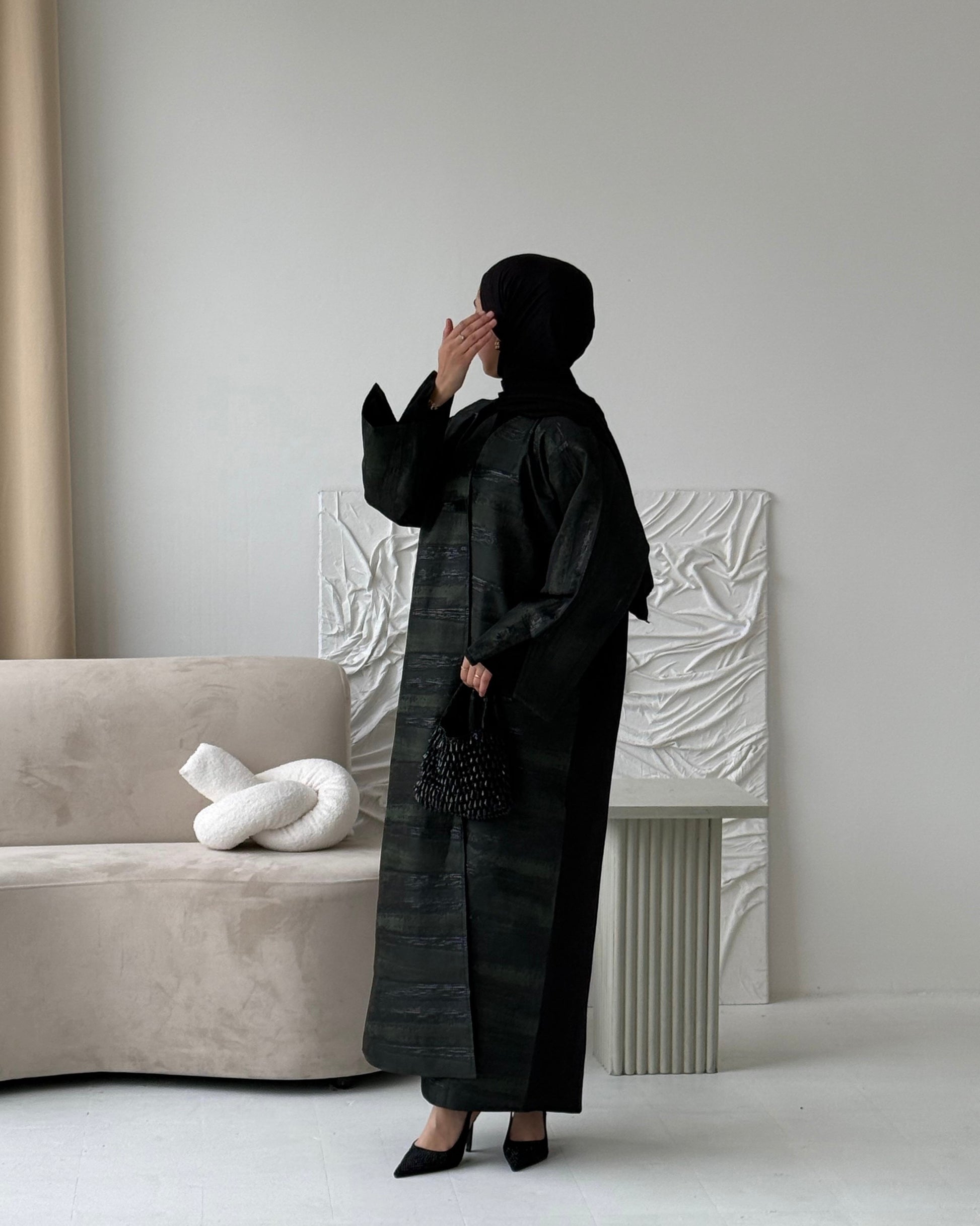 Elevate your wardrobe with this luxurious jacquard abaya, designed for timeless elegance and effortless sophistication. This exquisite design seamlessly blends textures for a refined and contemporary look. The front is crafted from luxurious jacquard fabric, showcasing intricate detailing and elegance, while the back is made from smooth, high-quality black fabric for added comfort and sophistication.