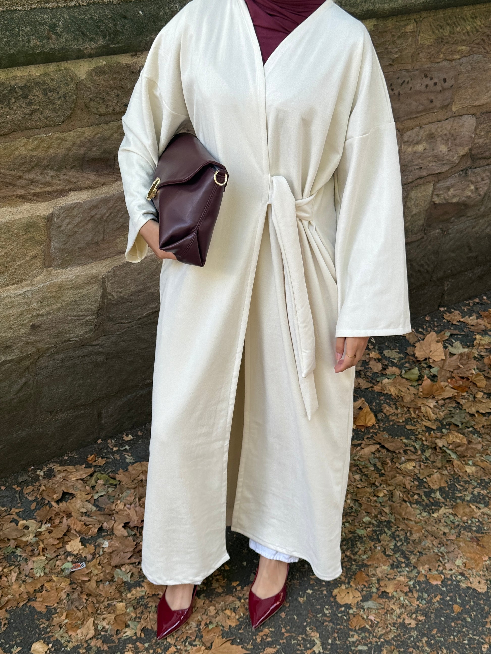 Elevate your autumn wardrobe with our open suede belted abaya, designed for both comfort and elegance. Featuring a relaxed open style with a flowy belt, dropped shoulders, and side pockets for practicality. Finished with a matching complimentary chiffon hijab for a complete look.