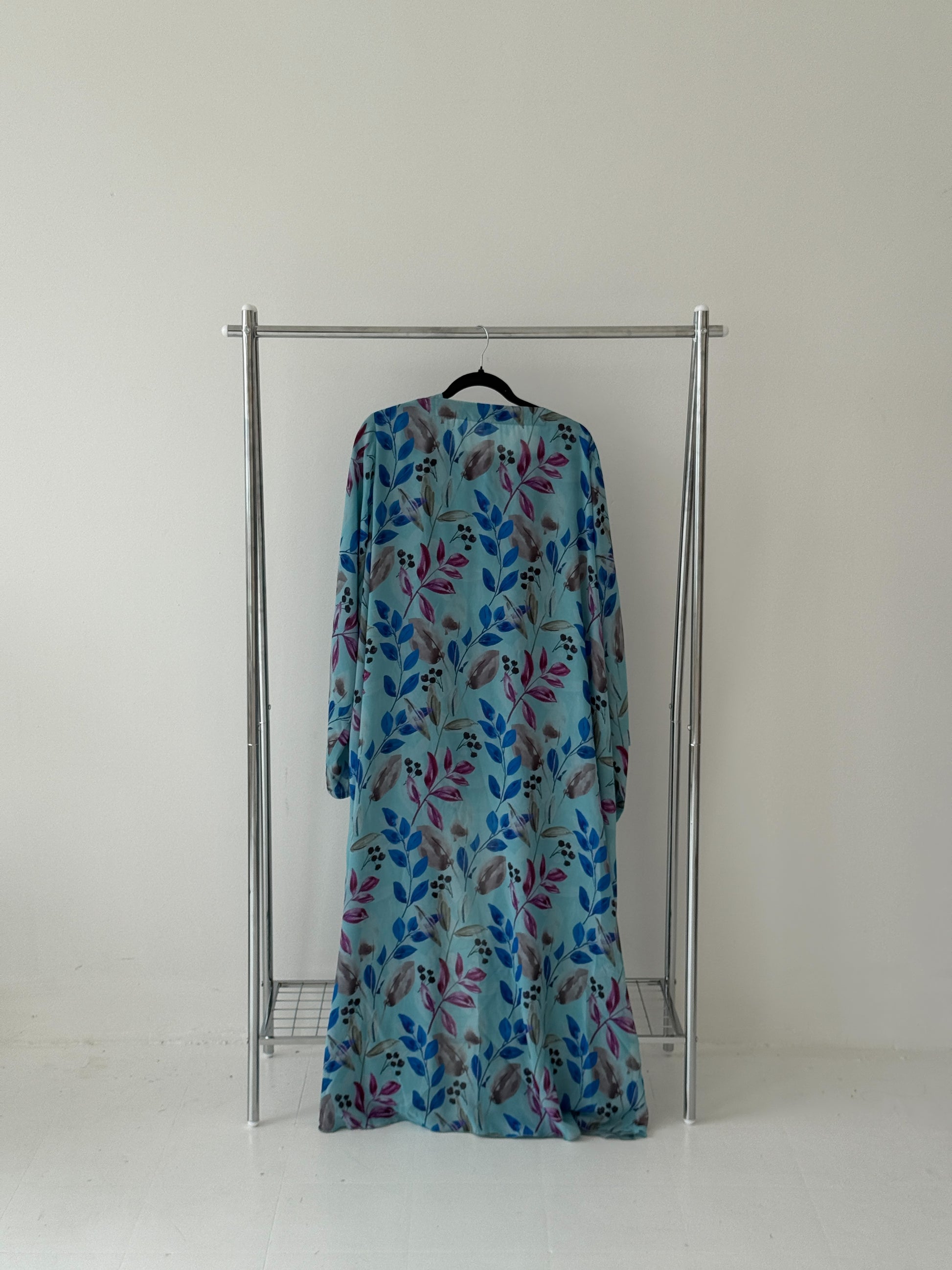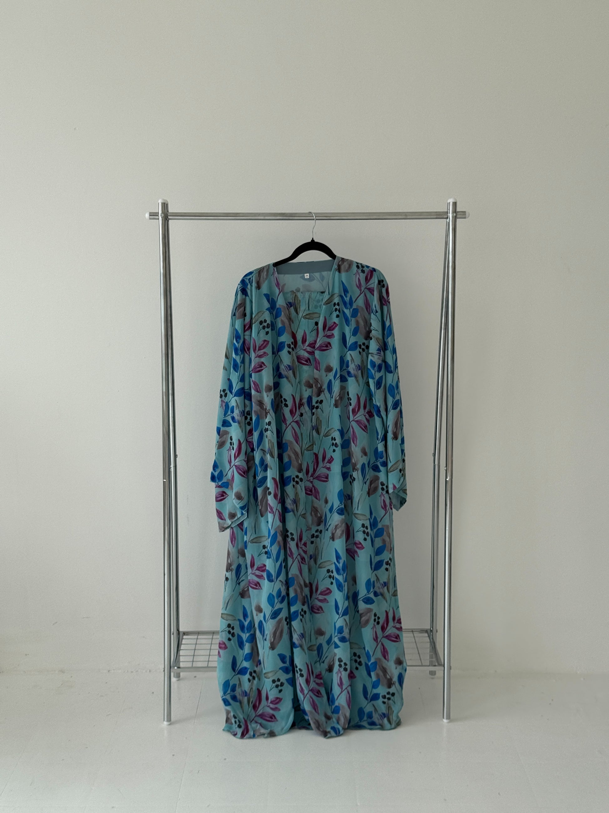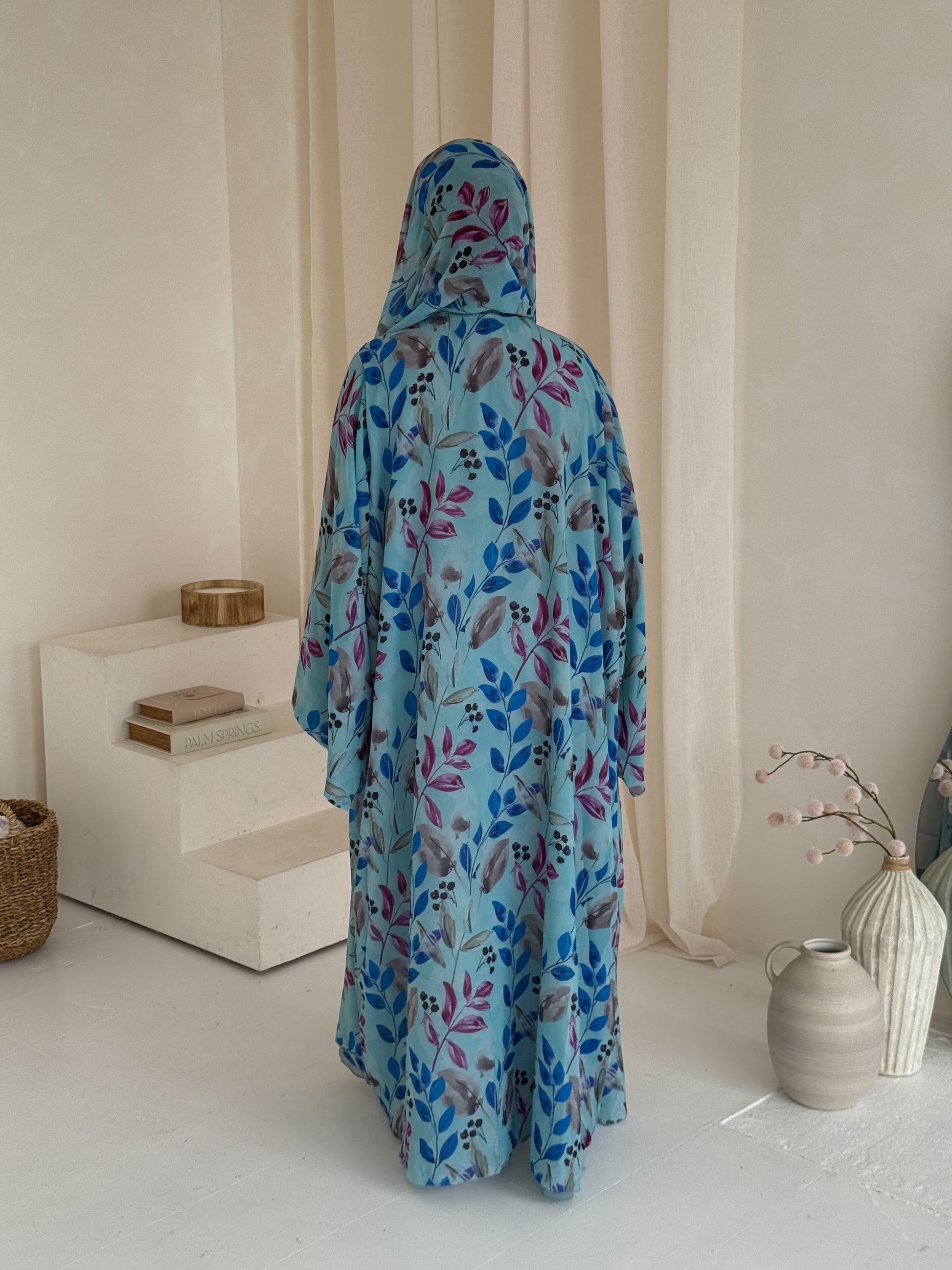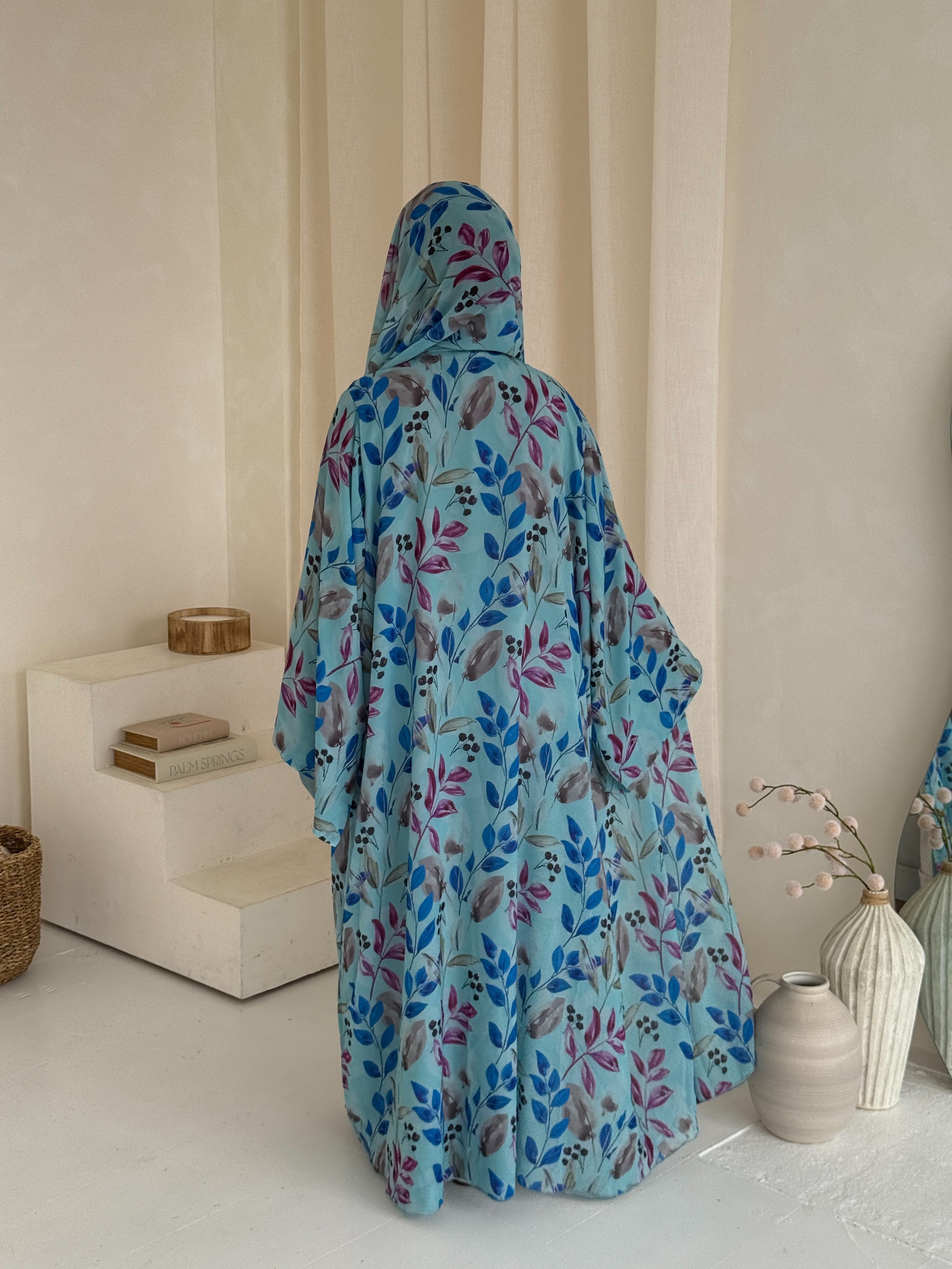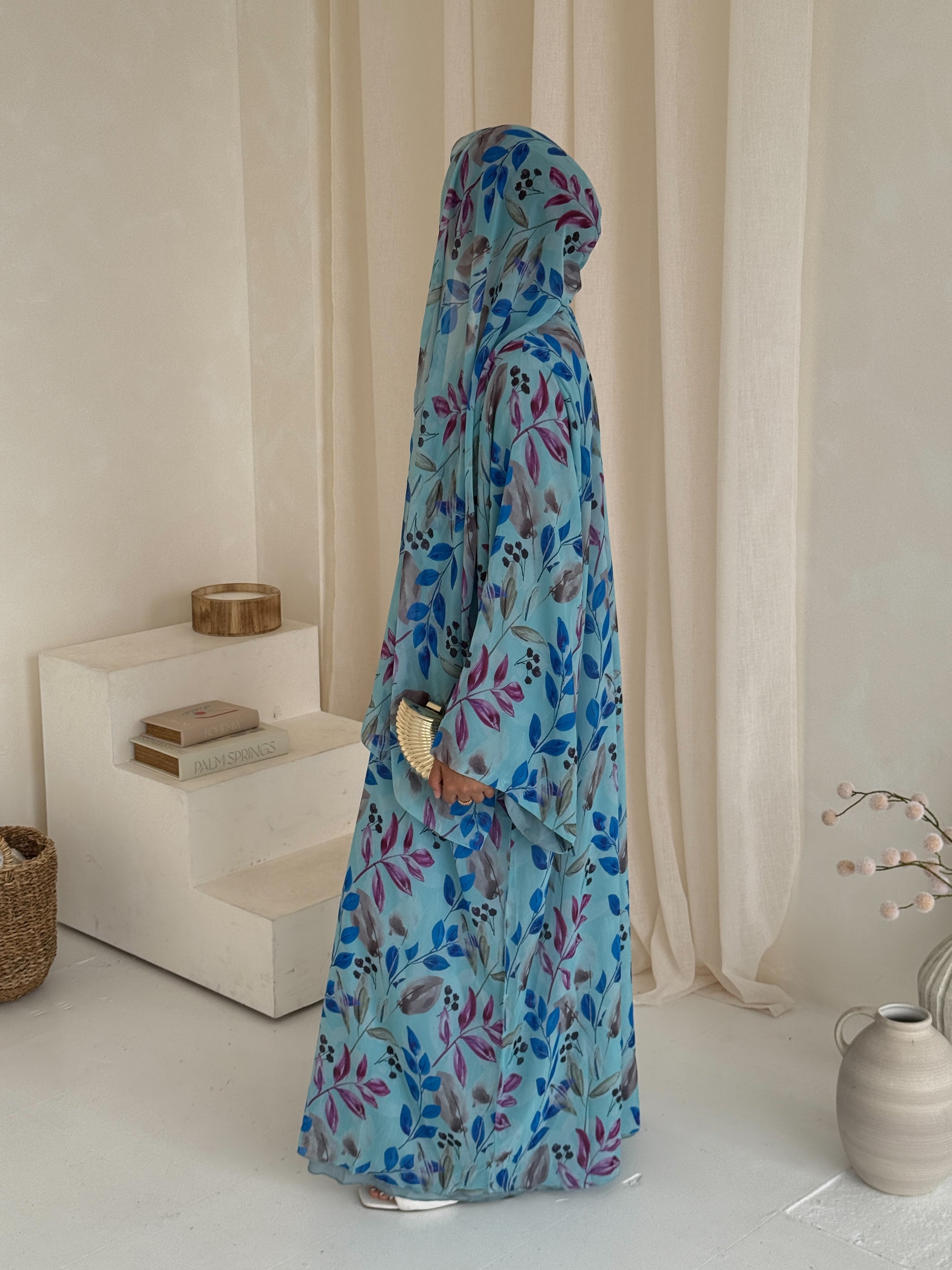 Effortlessly chic and perfect for summer days, this abaya is crafted from lightweight premium chiffon and double-lined to ensure full modesty while keeping you cool and comfortable. Designed with wide, airy sleeves and a beautifully fluid drape, it flows gracefully with every step. Evokes a summery, nature-inspired charm. It comes with a complimentary matching printed chiffon hijab.
