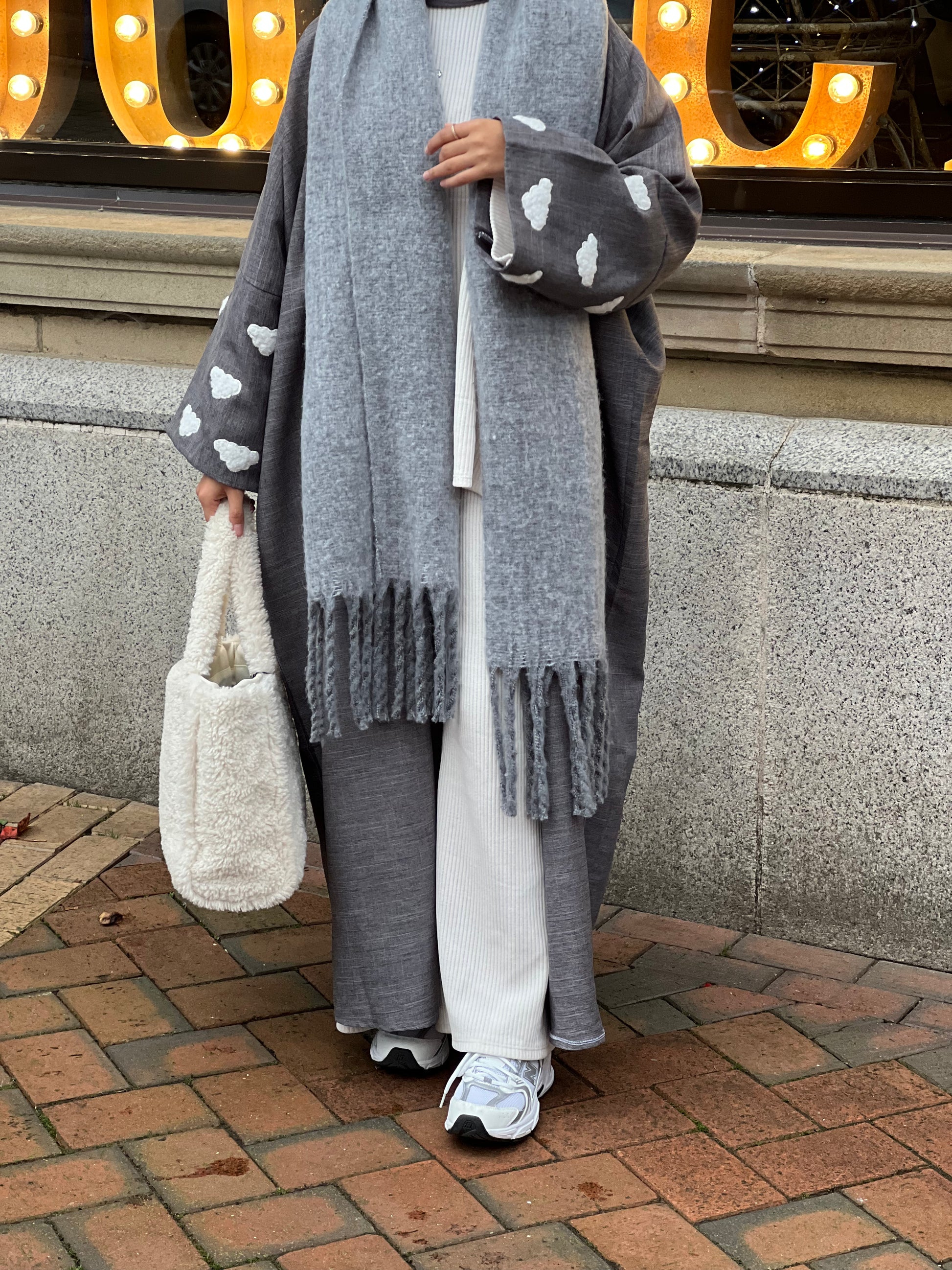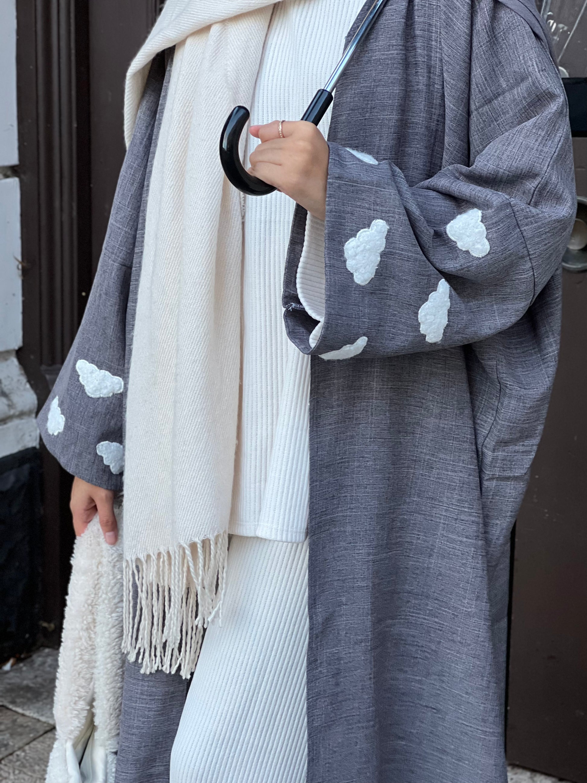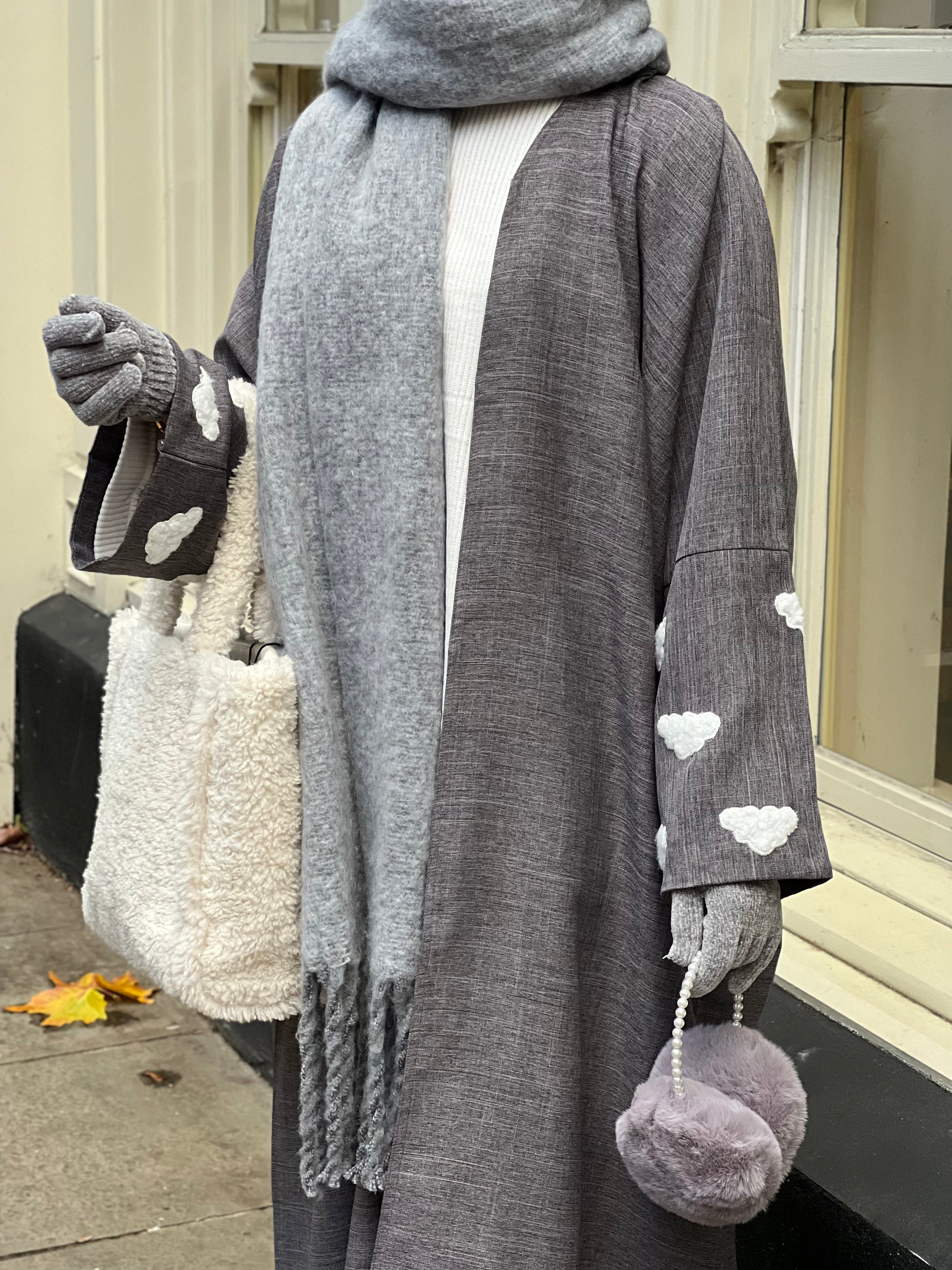 Made from a premium hard linen. Each cloud has been hand cut to precision - made from a fleece material giving the abaya a cute & stylish appearance. Step into your soft girl era with this gorgeous piece. Comes with a complimentary matching Korean chiffon hijab. Hijab has matching fleece clouds on it. Buttons 2/3 of the way down so can be worn open or closed. Oversized fitting so is perfect for layering over knit wear, co ords or even tracksuits to keep extra warm.