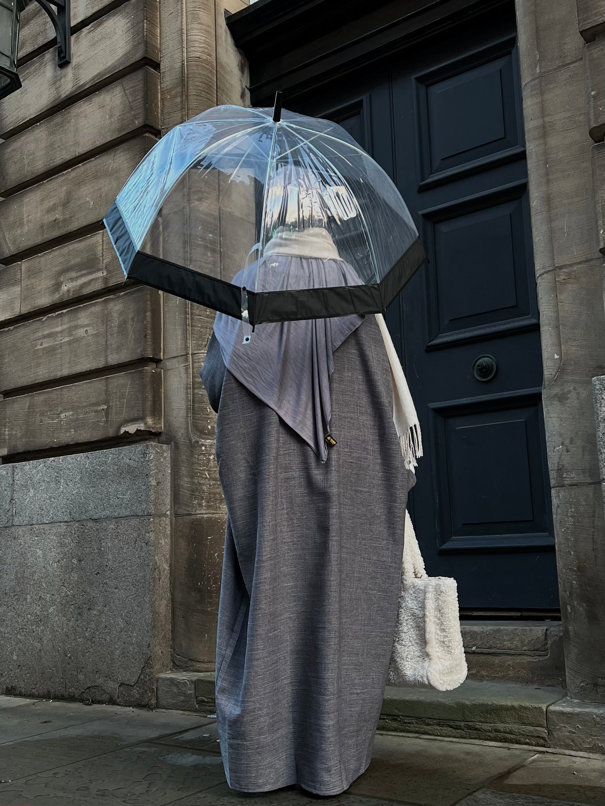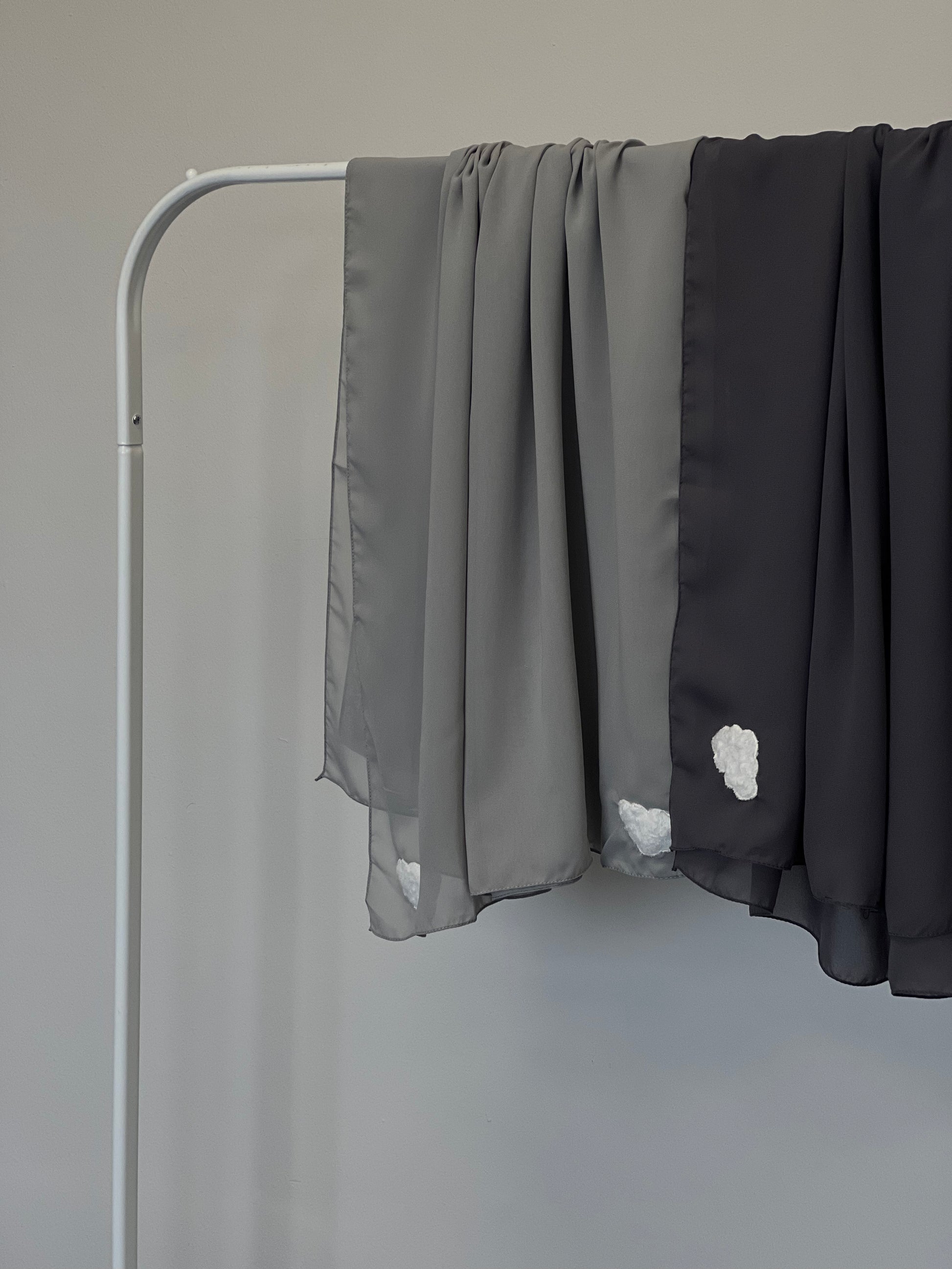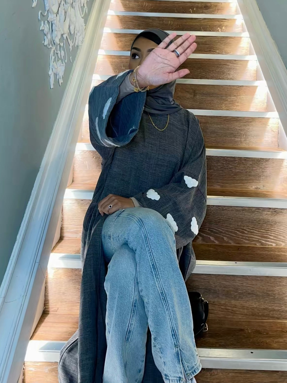 Made from a premium hard linen. Each cloud has been hand cut to precision - made from a fleece material giving the abaya a cute & stylish appearance. Step into your soft girl era with this gorgeous piece. Comes with a complimentary matching Korean chiffon hijab. Hijab has matching fleece clouds on it. Buttons 2/3 of the way down so can be worn open or closed. Oversized fitting so is perfect for layering over knit wear, co ords or even tracksuits to keep extra warm.