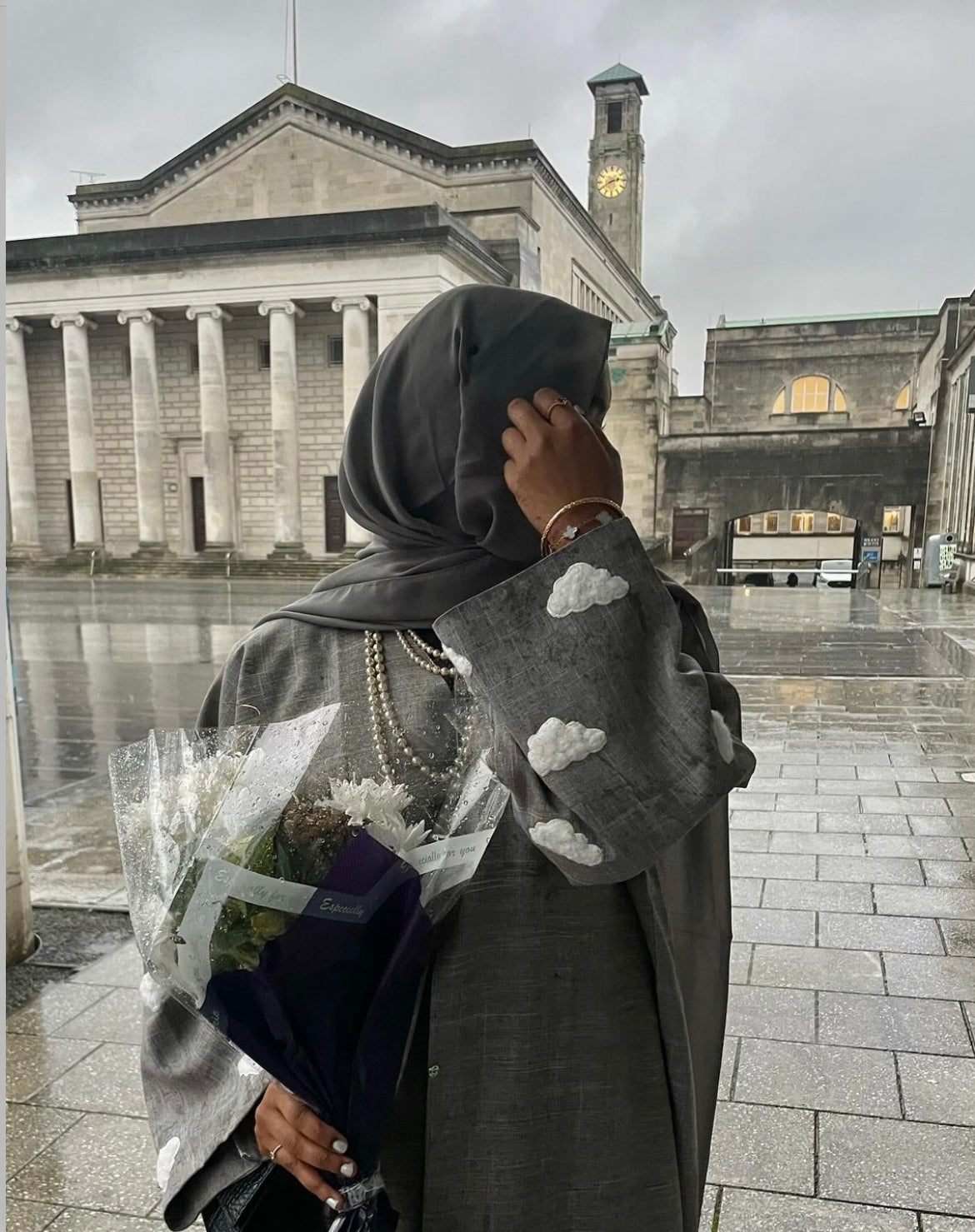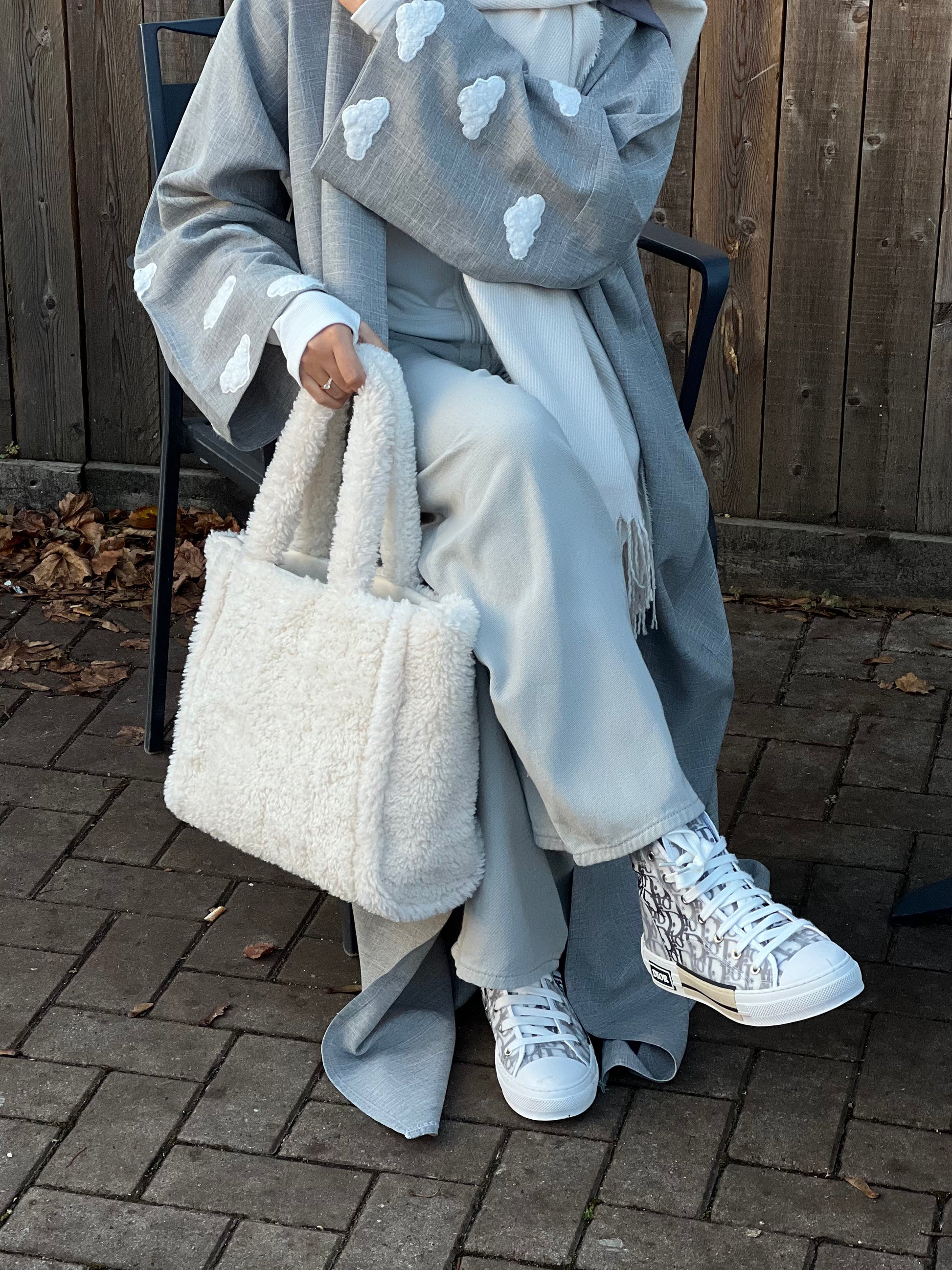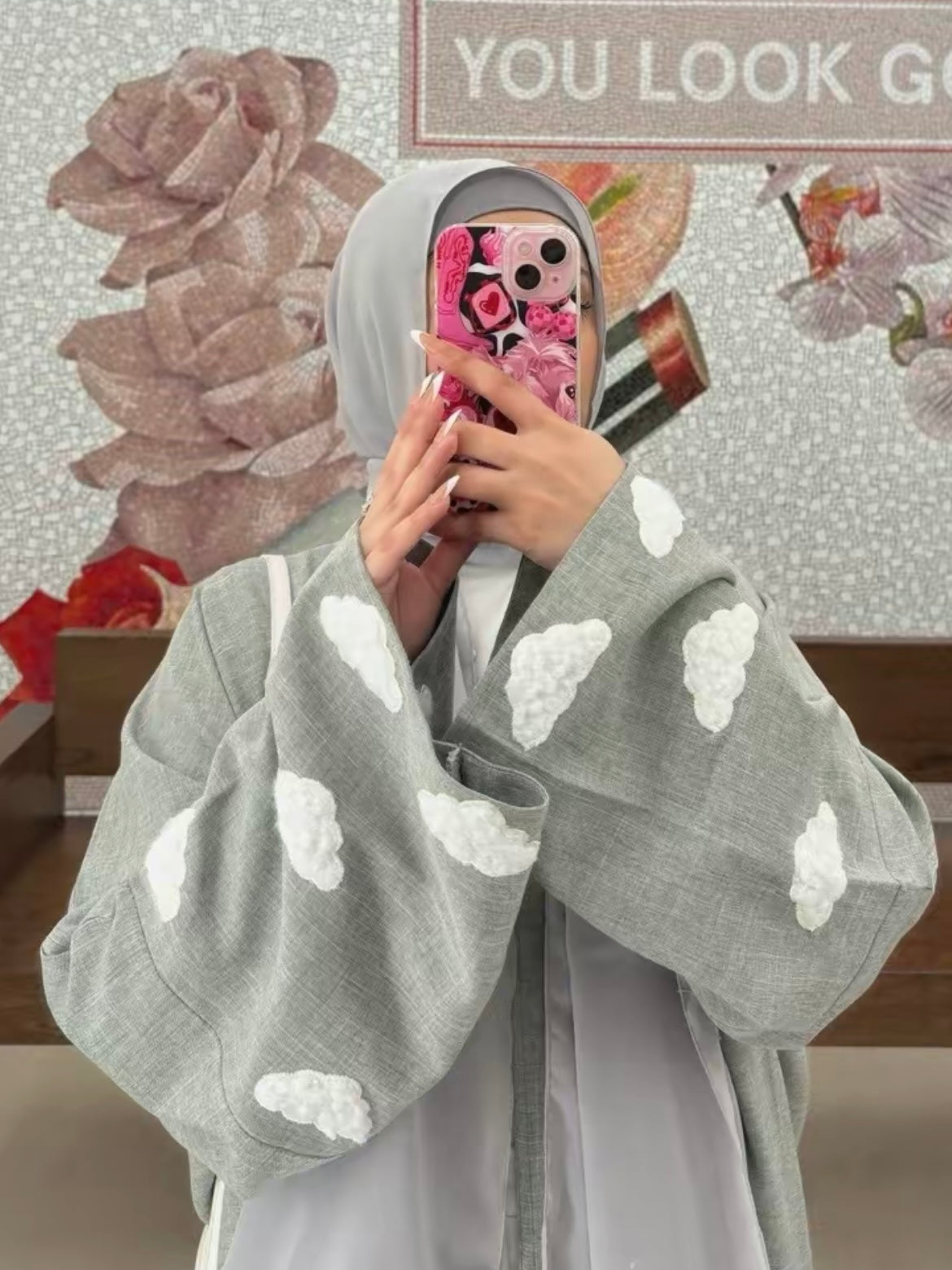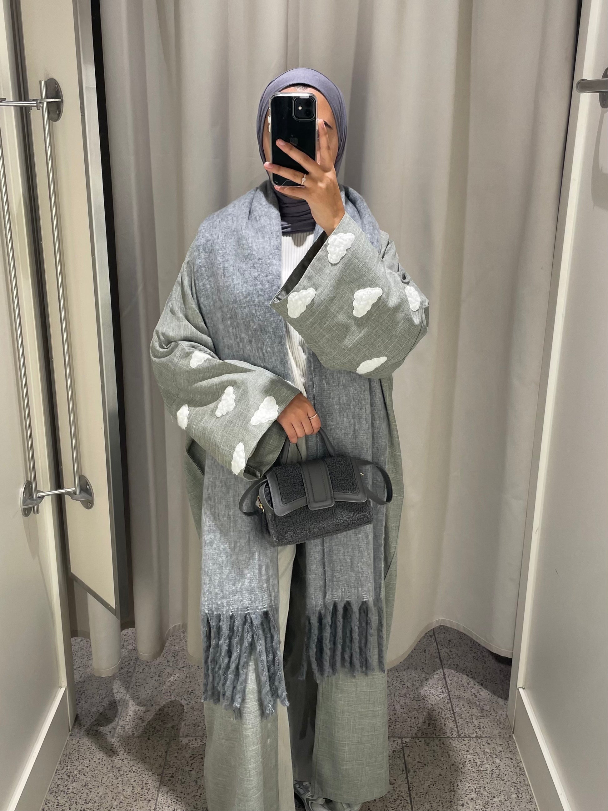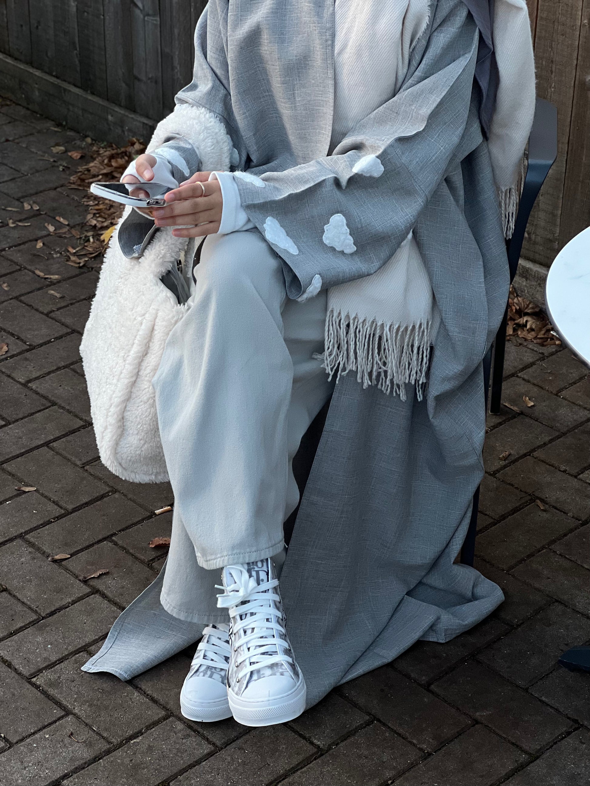 Made from a premium hard linen. Each cloud has been hand cut to precision - made from a fleece material giving the abaya a cute & stylish appearance. Step into your soft girl era with this gorgeous piece. Comes with a complimentary matching Korean chiffon hijab. Hijab has matching fleece clouds on it. Buttons 2/3 of the way down so can be worn open or closed. Oversized fitting so is perfect for layering over knit wear, co ords or even tracksuits to keep extra warm.