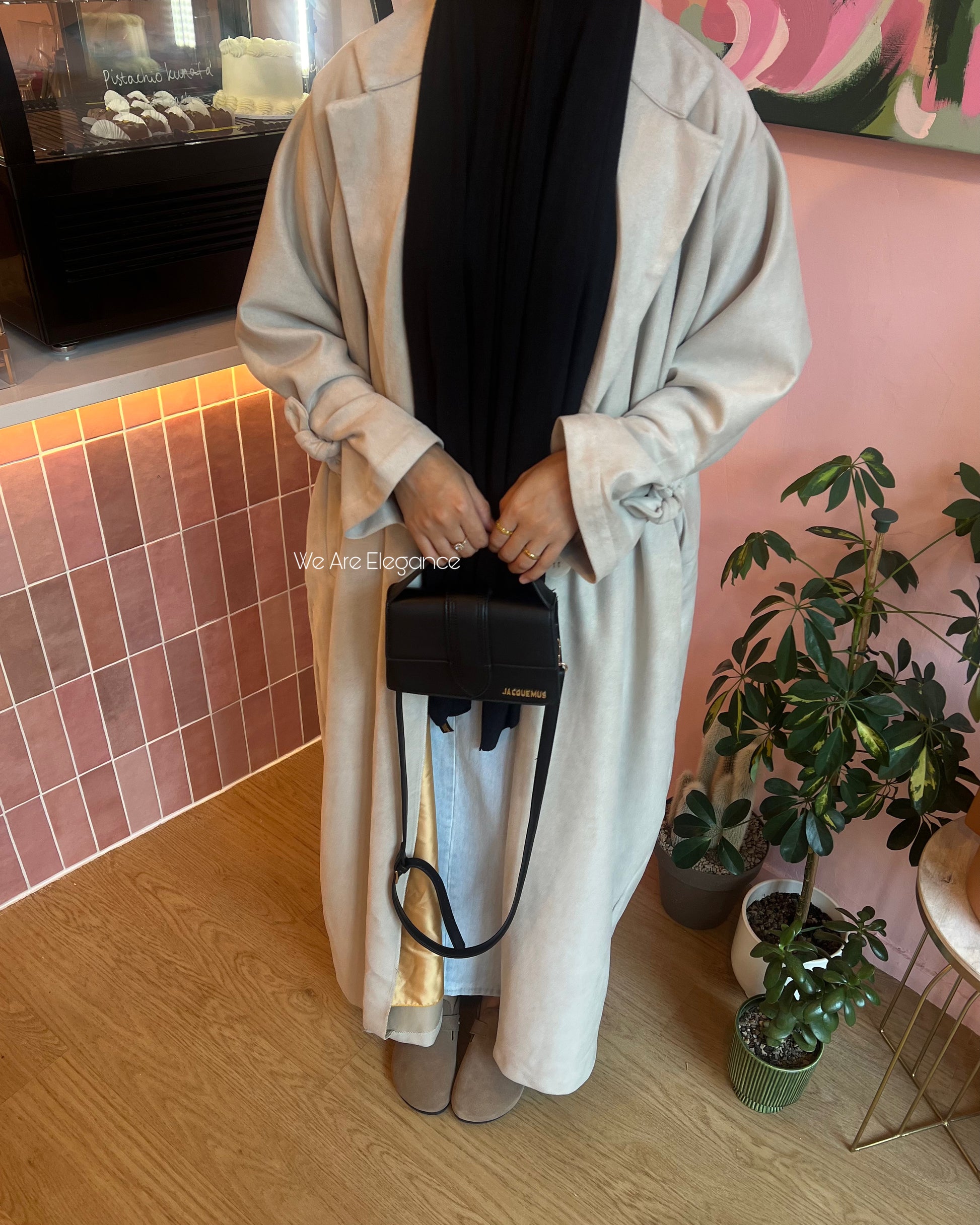 Made from a soft, light beige suede material. The relaxed fit offers a comfortable and casual vibe, while maintaining elegance and sophistication. It features a beautiful gold satin lining inside for an elevated, premium feel. The standout feature is the tie up sleeve detail at the cuffs adding a fashionable twist to the classic trench coat design. The coat comes with functional pockets either side. Elevate your winter fits with this understated yet stylish piece.