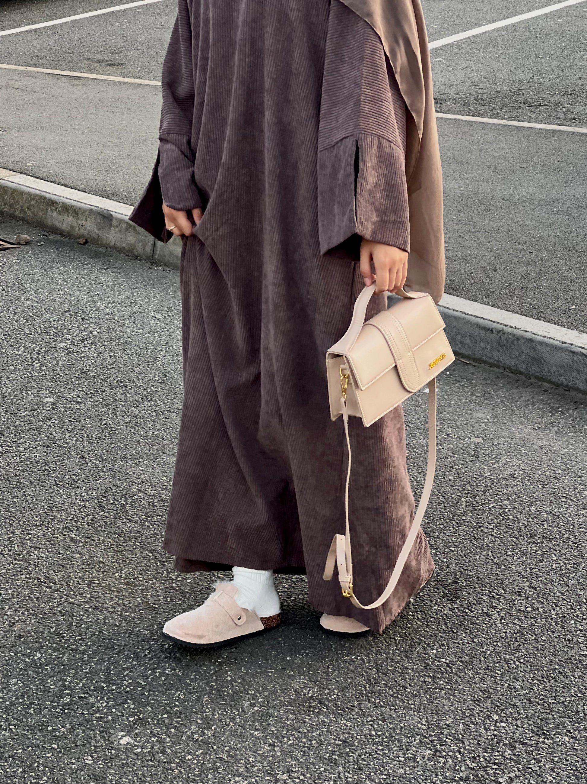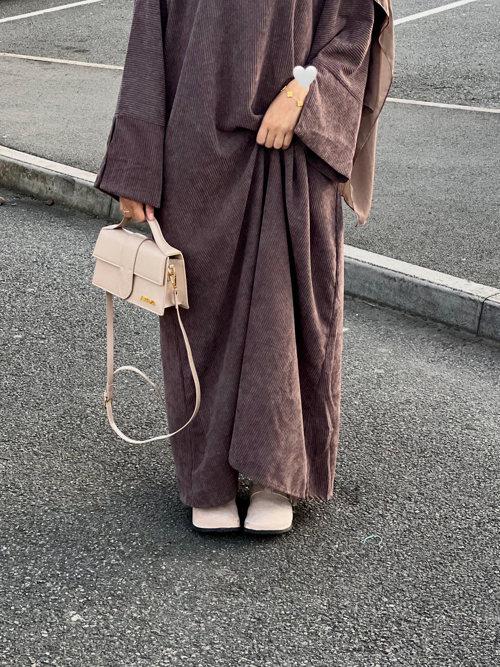 Introducing our new winter abayas. A closed version of our OG corduroy abayas with split sleeves. Comes with pockets either side and a complimentary matching chiffon hijab. Single split at the front of the sleeves. Loose fitting so perfect to wear over thick jumpers or joggers to stay warm this season. The ultimate staple abaya every girl NEEDS in her modest wardrobe this autumn/ winter!