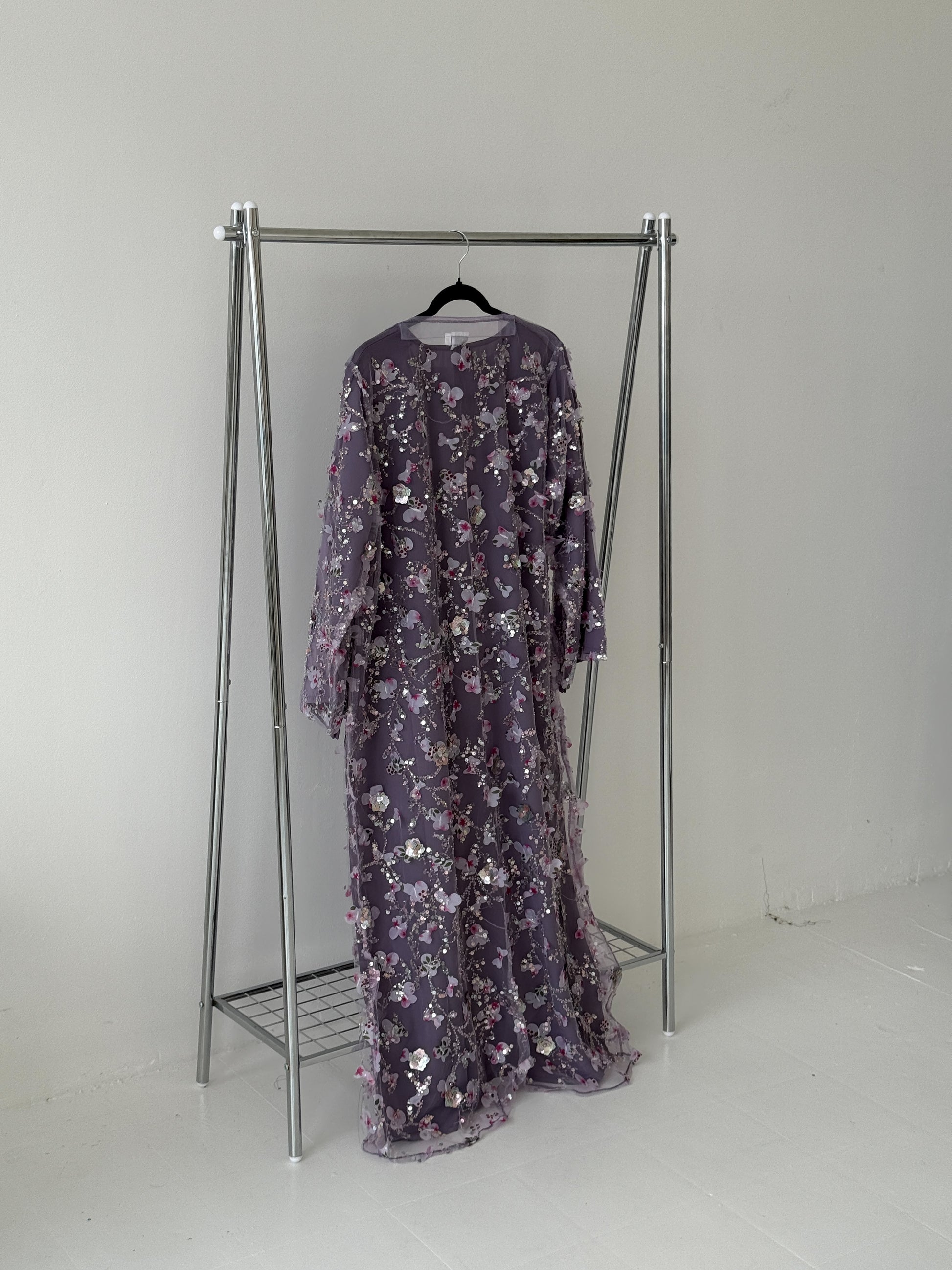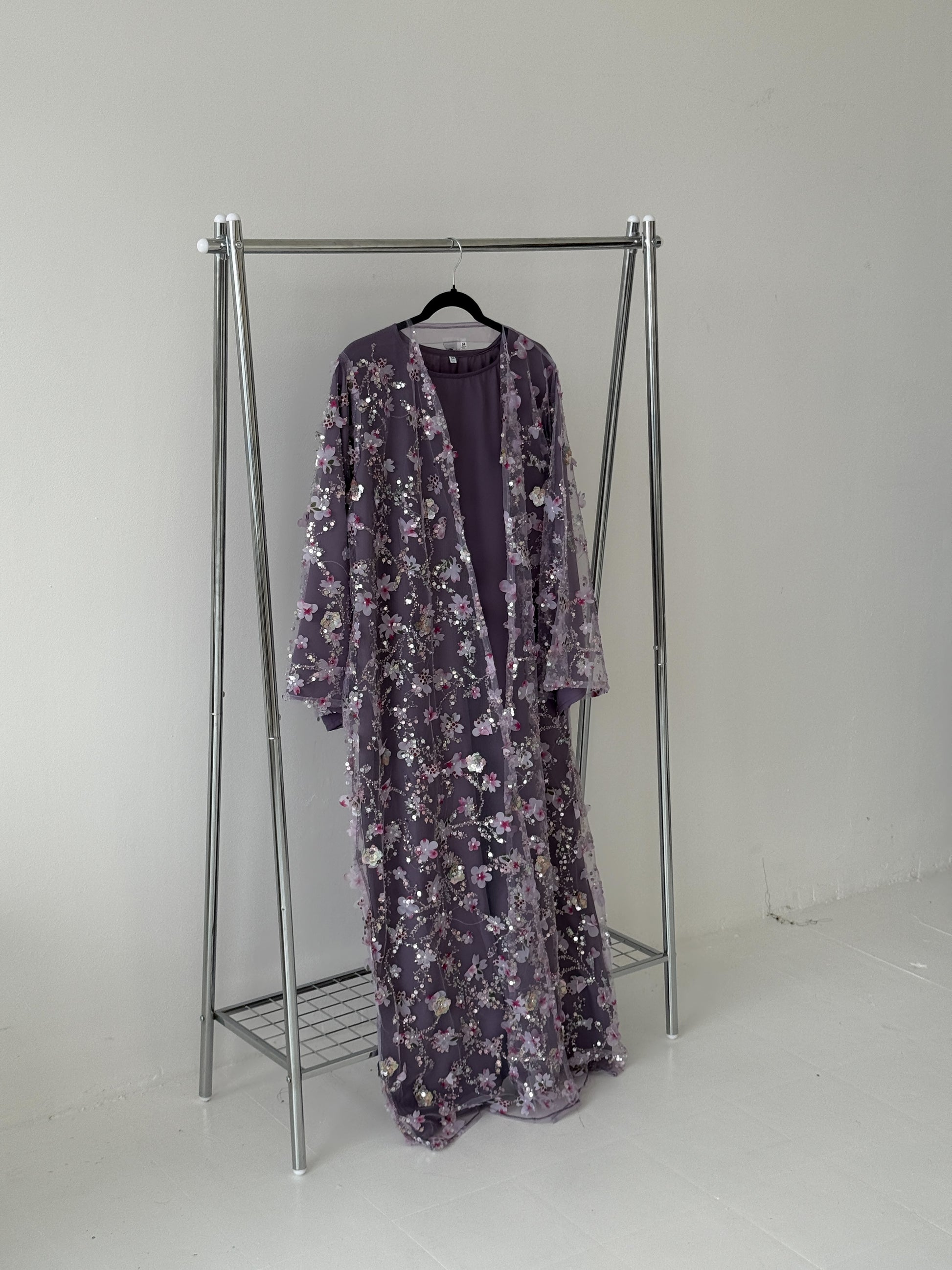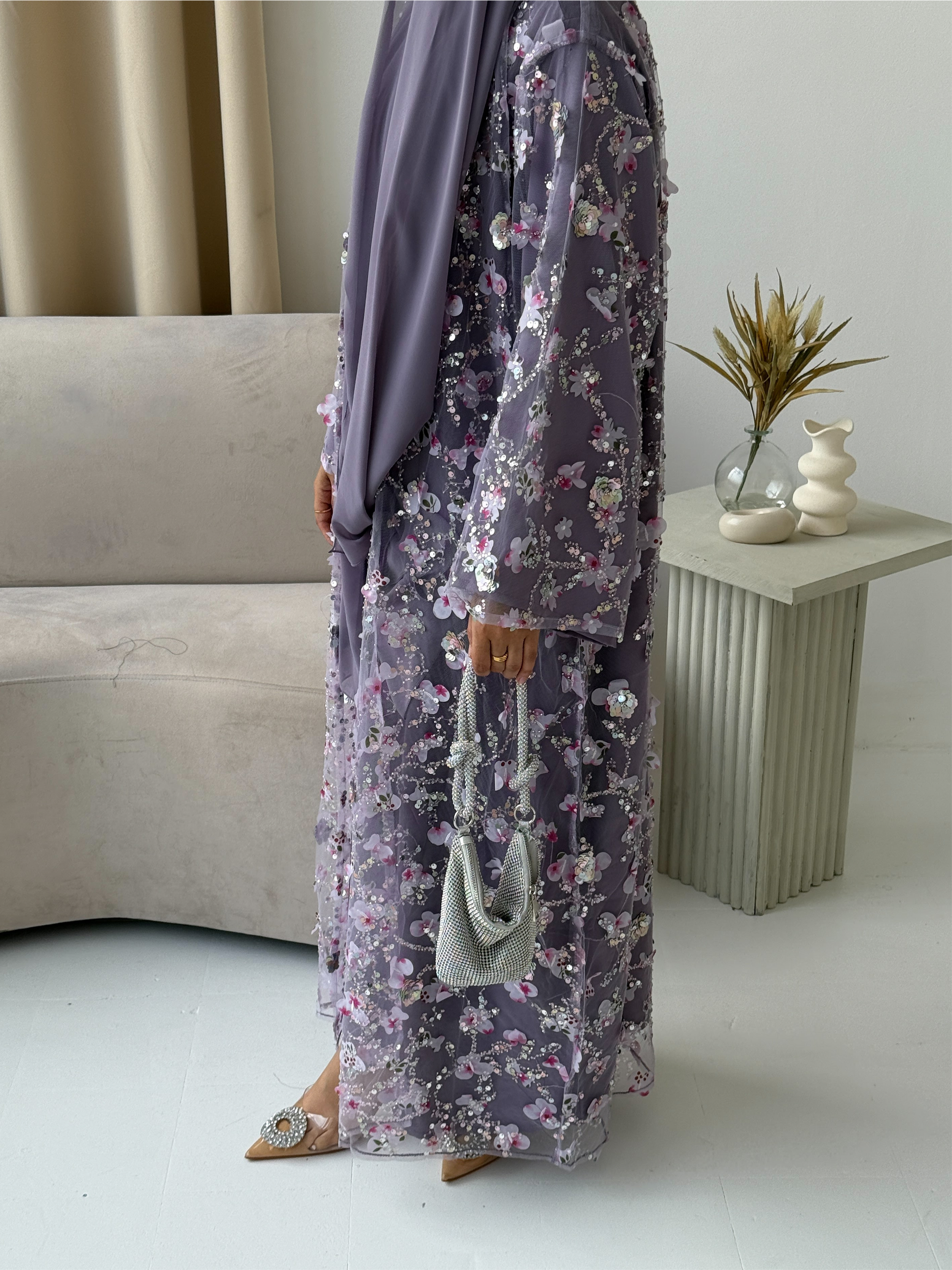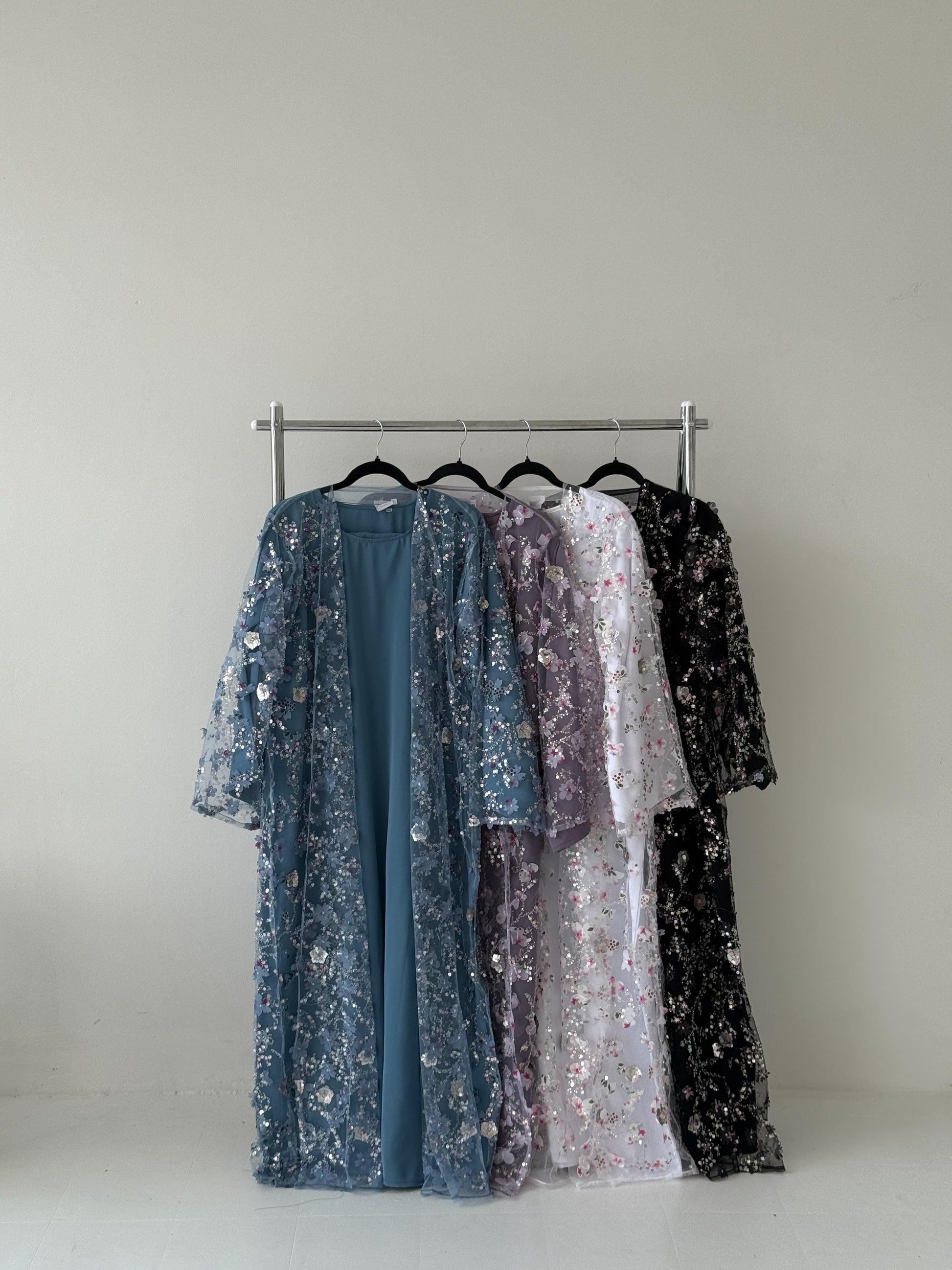 Radiate elegance in our dreamy Enchanted abaya, true statement of grace and glamour. Featuring a shimmering 3D floral sequin overlay, Giving you that effortlessly magical aura. Full sleeve Korean nida slip dress, and complimentary matching chiffon hijab. Perfect for Eid, weddings, or any moment you want to feel magical. Available in four stunning shades.