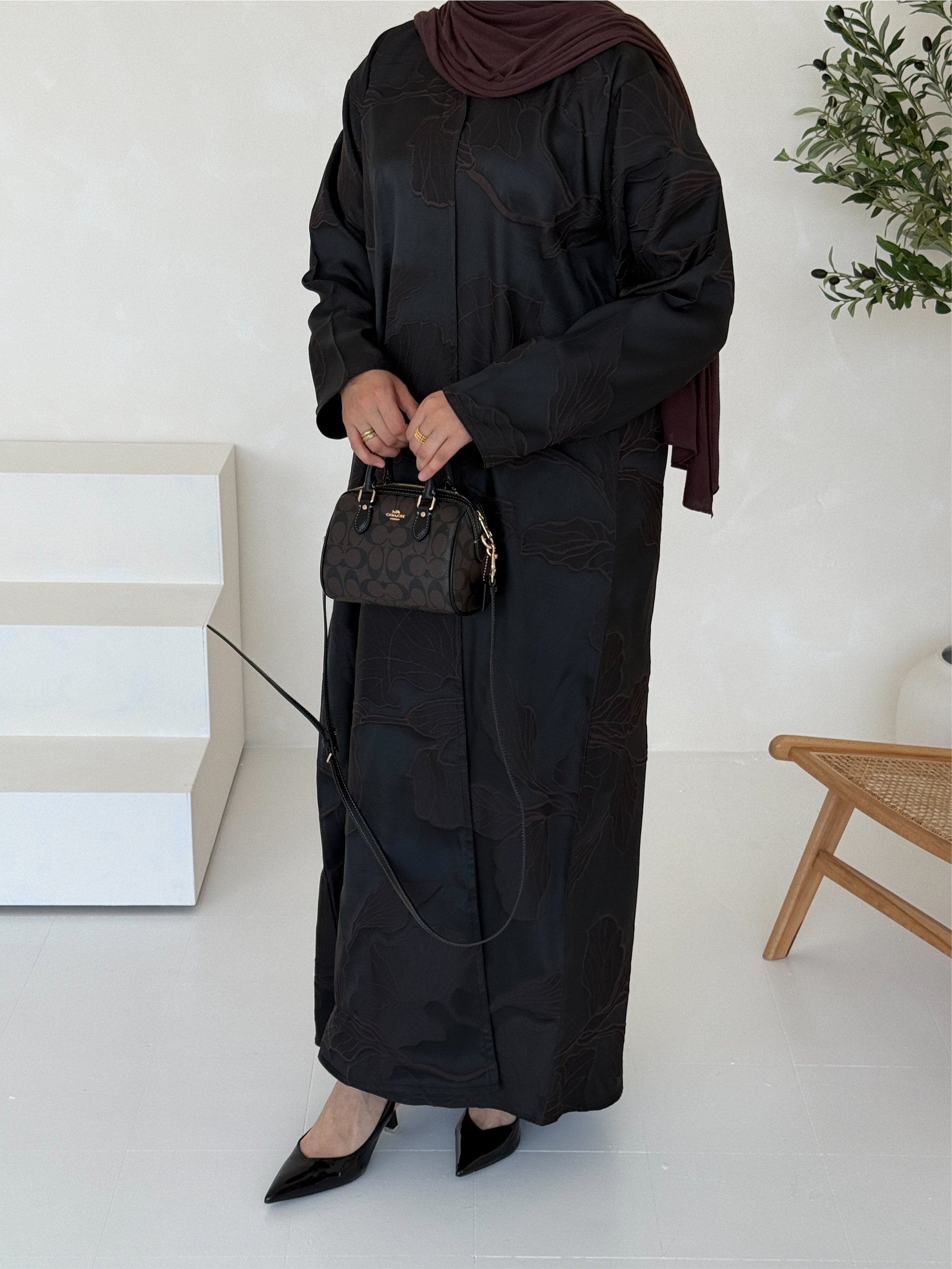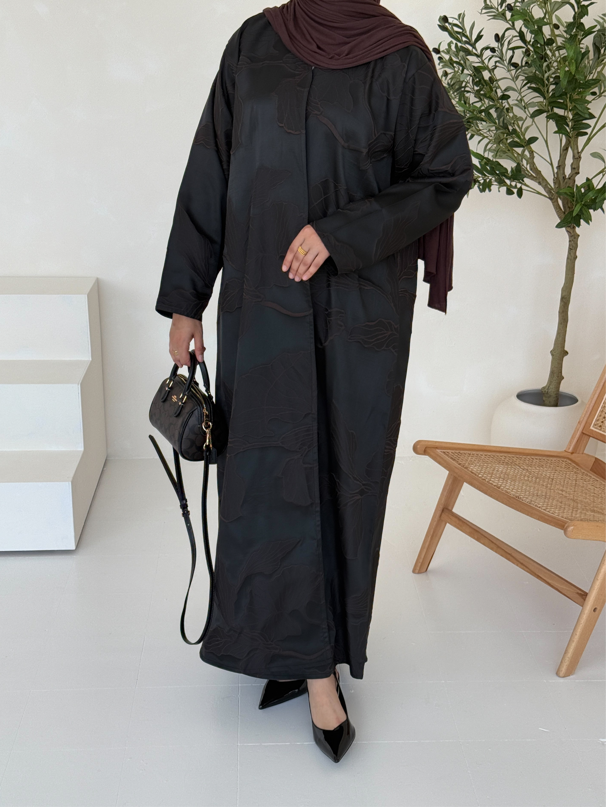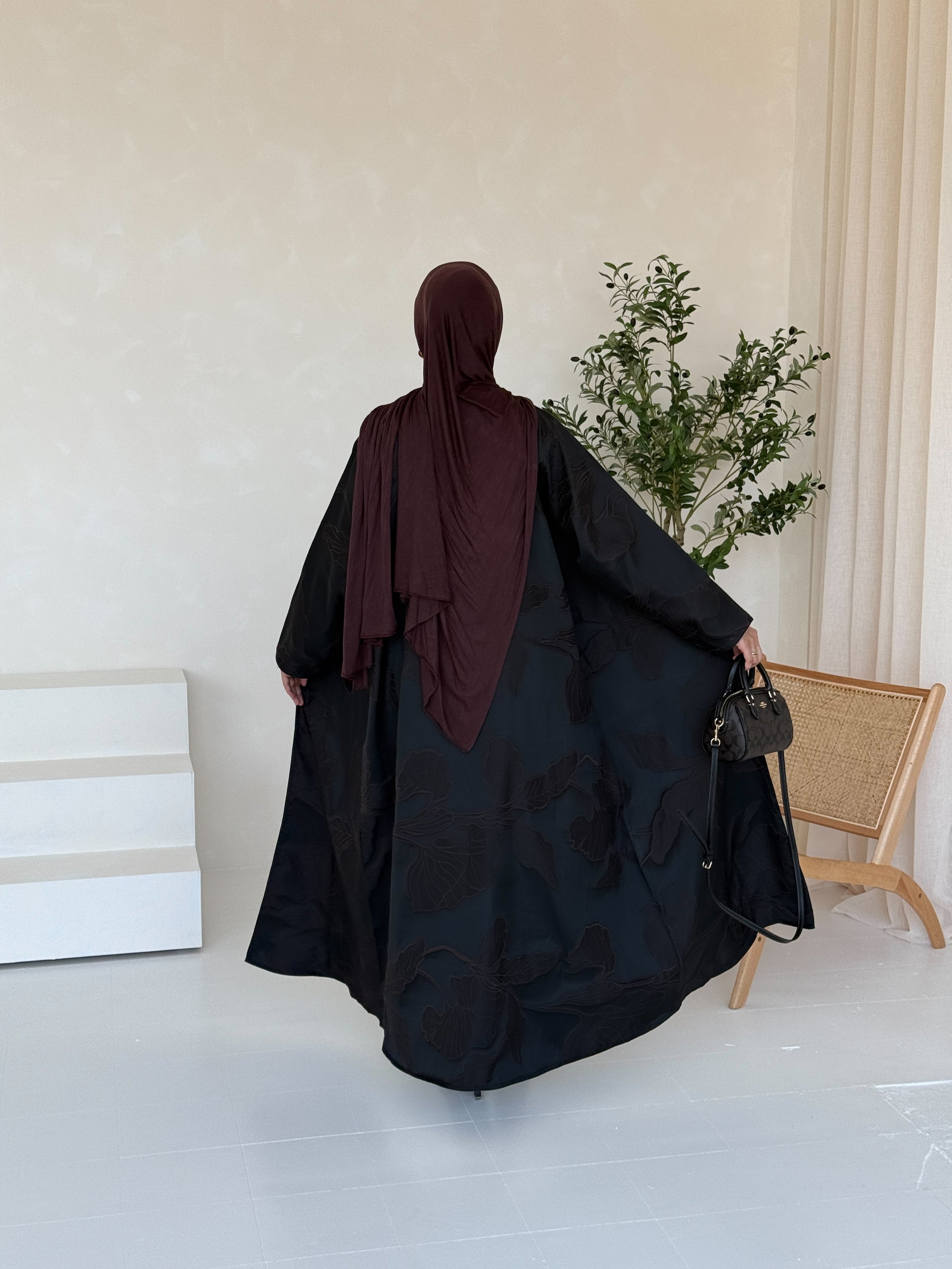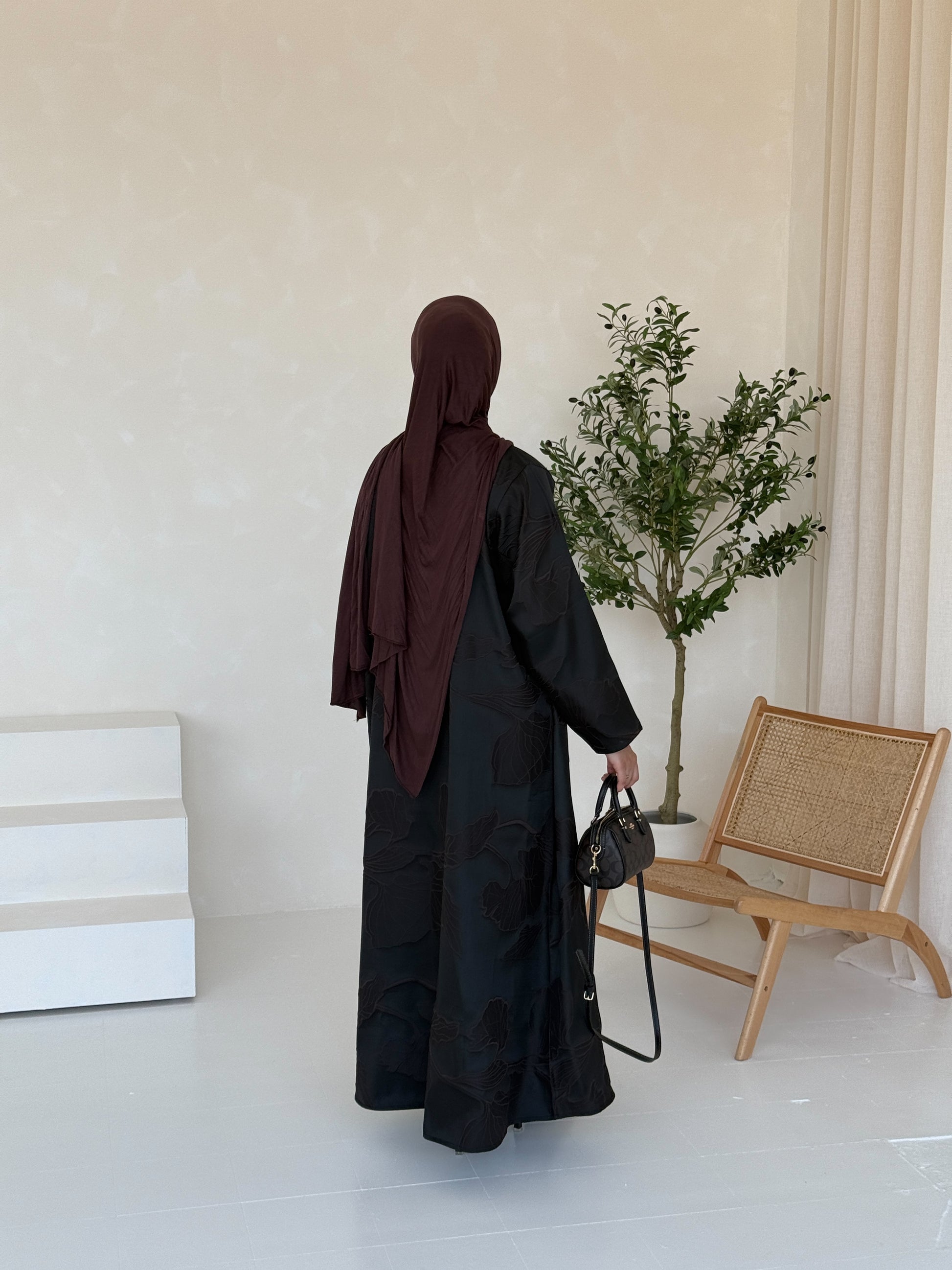 Elevate your modest wardrobe with our timeless black abaya, featuring an all-over leafy texture that adds depth and elegance to the design. Crafted from high-quality, thick fabric, it offers structure and durability while maintaining comfort. The slim, tapered sleeves lend a smart and flattering silhouette, perfect for both everyday wear and occasions. Designed as an open-front style, it comes complete with a complimentary chiffon hijab for a graceful look.