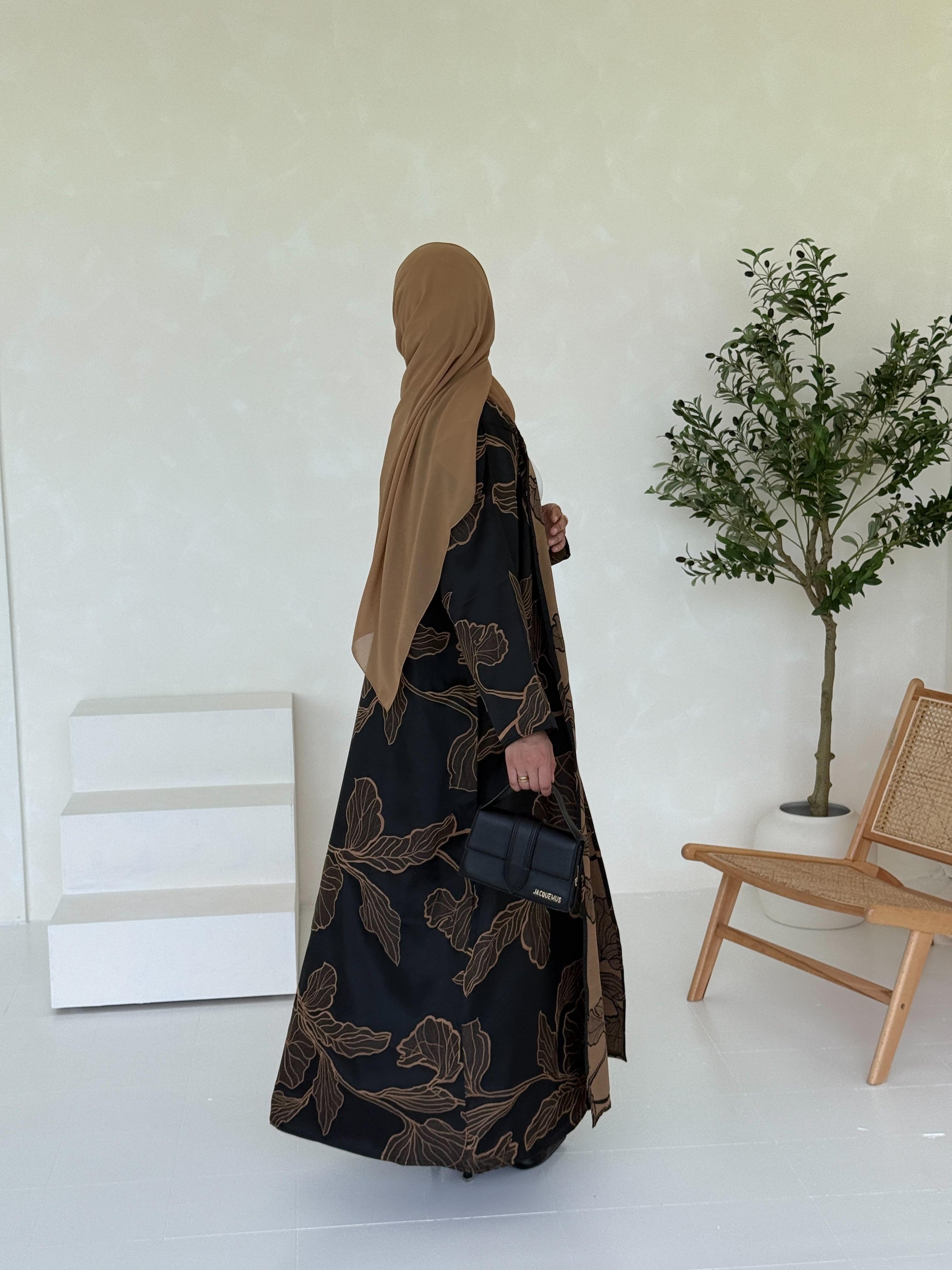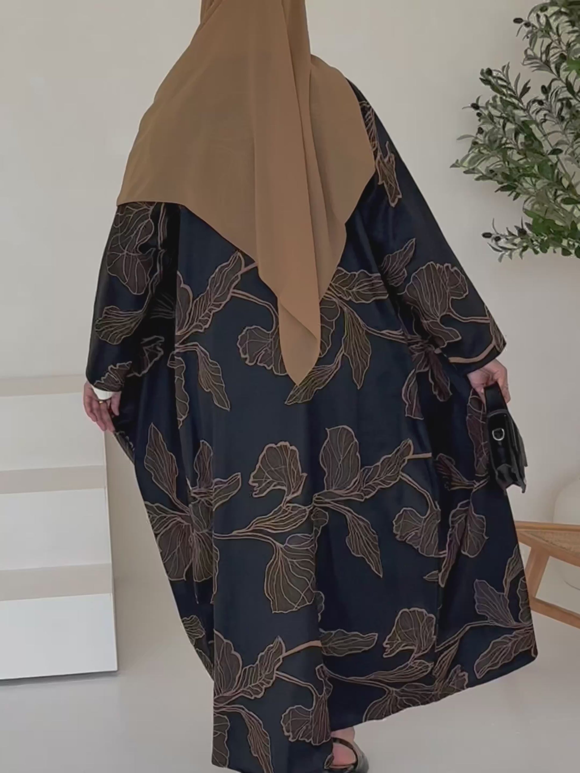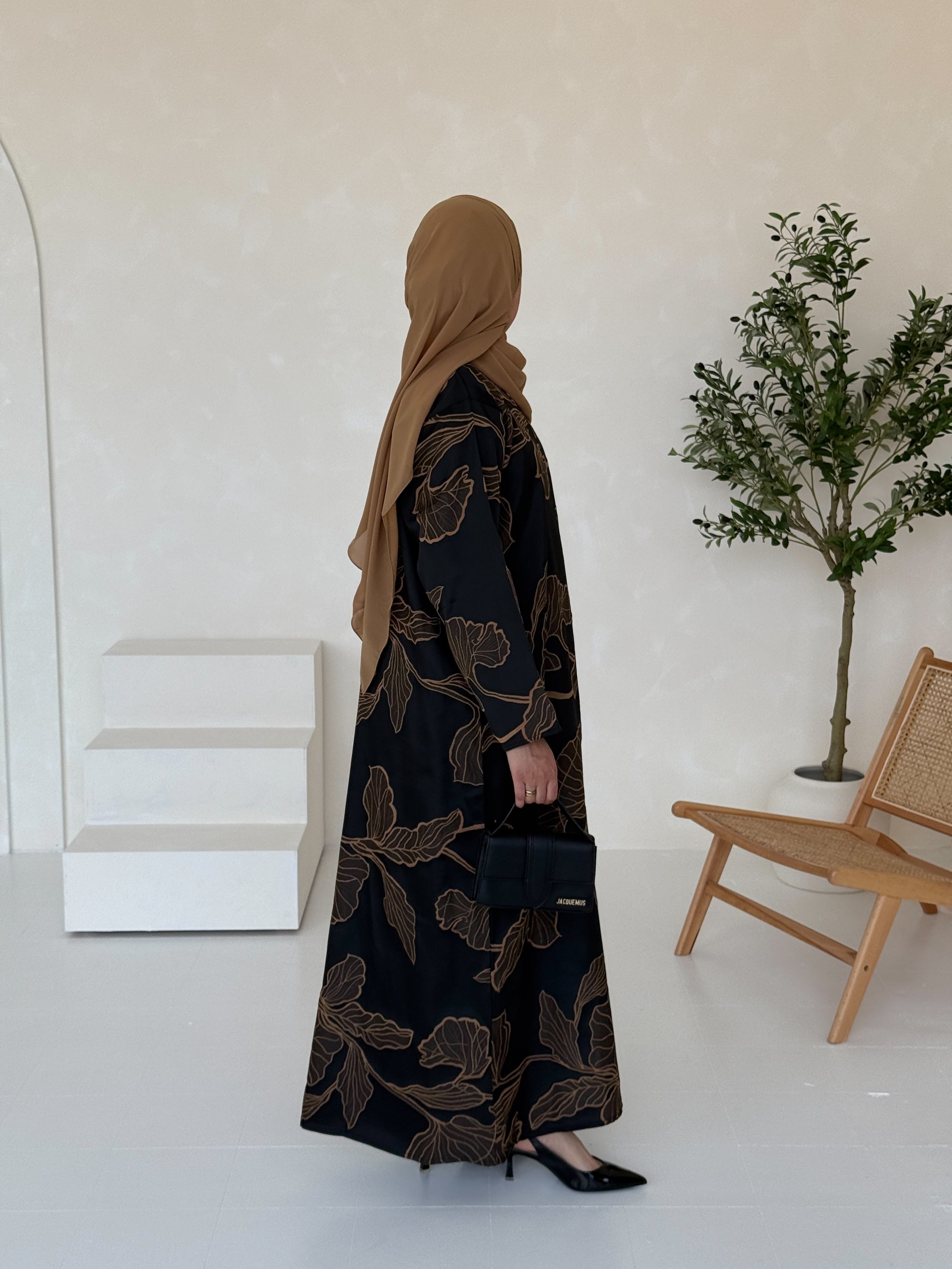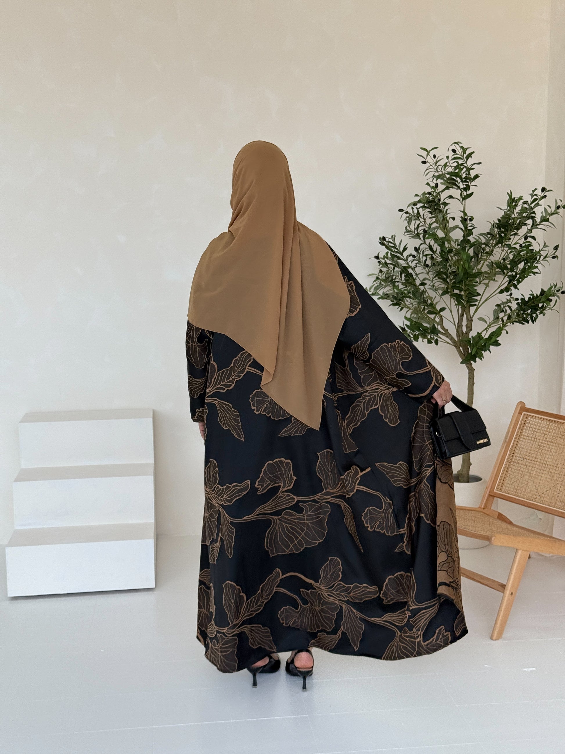 Elevate your modest wardrobe with our timeless black abaya, featuring an all-over leafy texture that adds depth and elegance to the design. Crafted from high-quality, thick fabric, it offers structure and durability while maintaining comfort. The slim, tapered sleeves lend a smart and flattering silhouette, perfect for both everyday wear and occasions. Designed as an open-front style, it comes complete with a complimentary chiffon hijab for a graceful look.