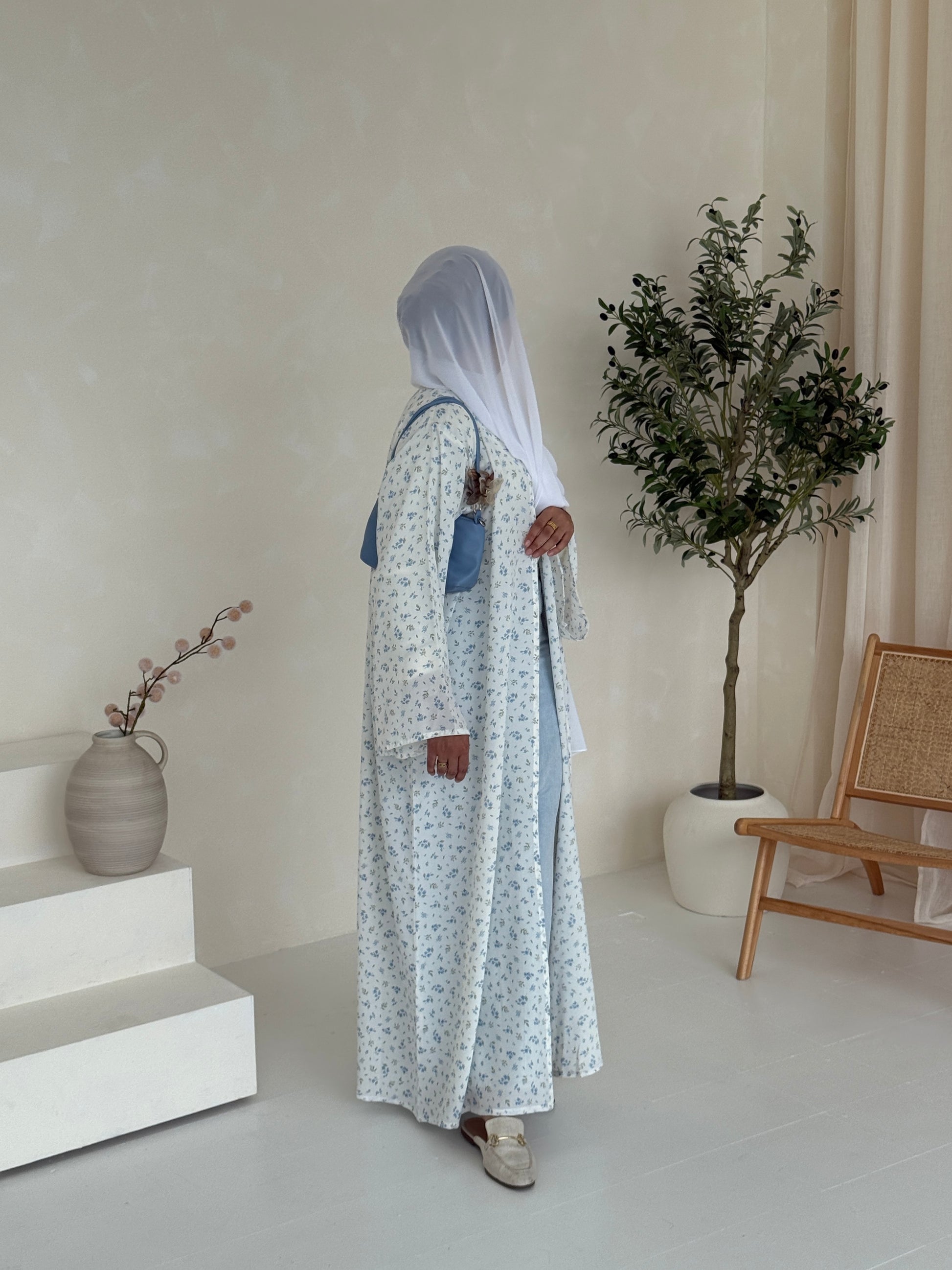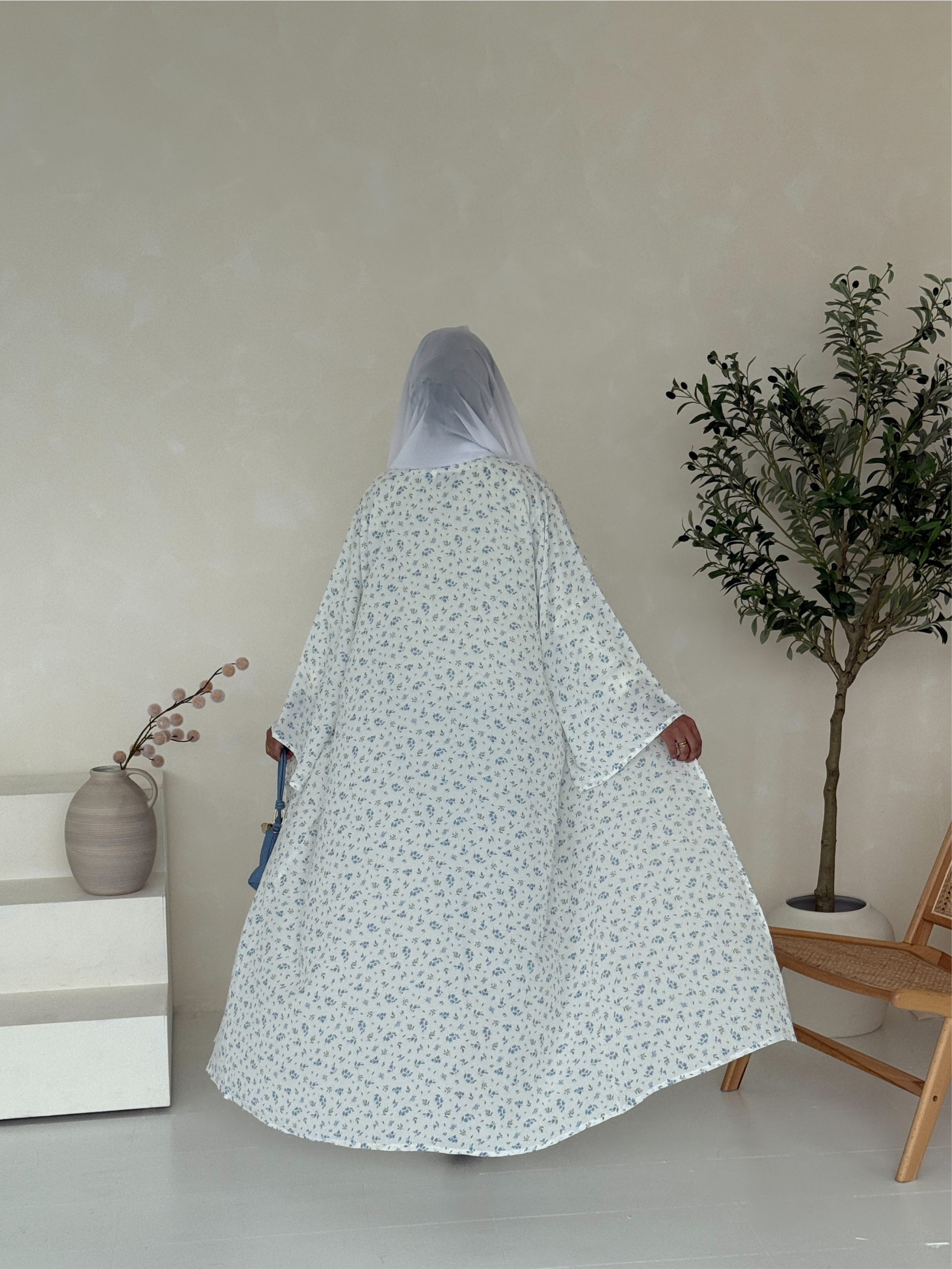Embrace effortless summer elegance with our lightweight floral kimono, designed in a soft white base adorned with delicate blue blooms. This breezy piece captures the dreamy essence of cottagecore and coquette aesthetics—perfect for sunny strolls, garden brunches, or layering over your everyday fits. It comes with a complimentary matching hijab for a seamless. Whether you’re dressing it up or keeping it casual, this kimono is your go-to for feminine charm and comfort.