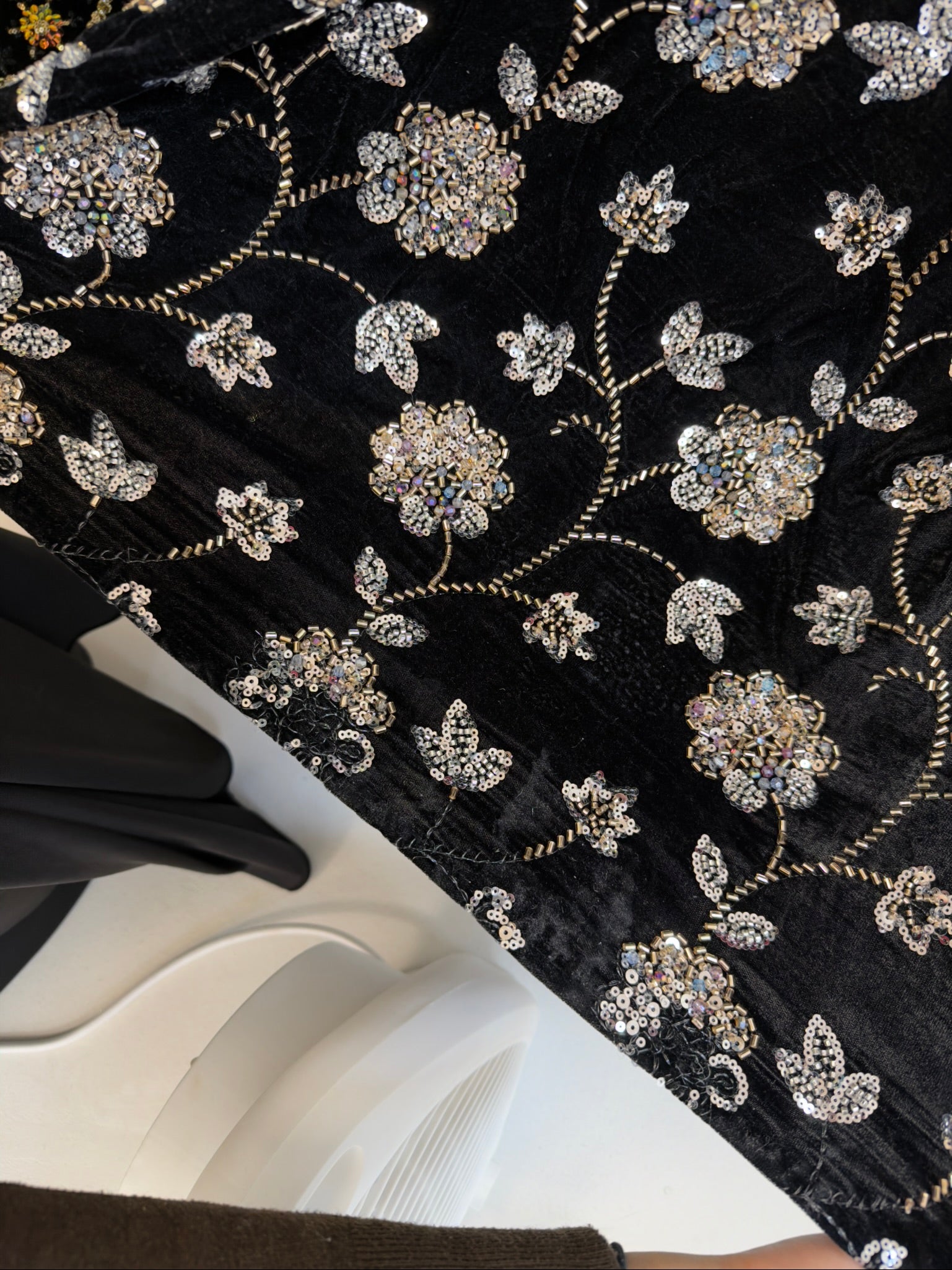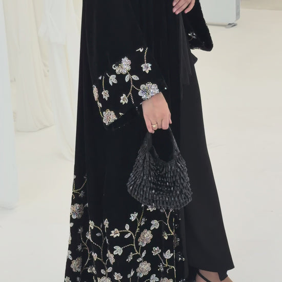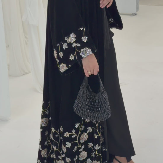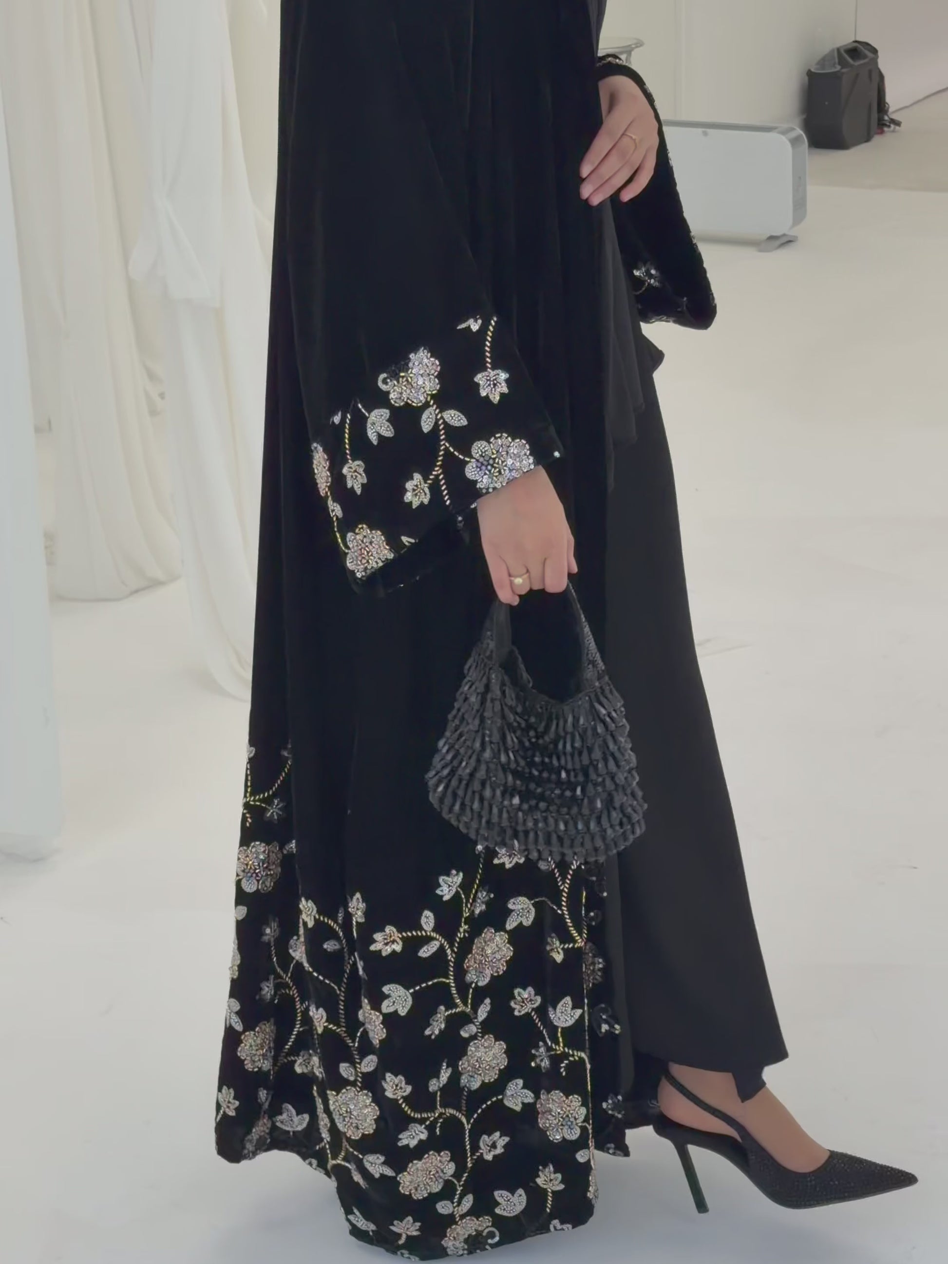 Crafted from sumptuous velvet, this open style abaya flows effortlessly with a commanding yet feminine silhouette. Designed without buttons for an uninterrupted drape. Delicate silver and light gold stonework adorns the hemline and wide sleeves, inspired by the floral gardens and architectural artistry of South Asian heritage. The dual toned embellishment is meticulously placed to reflect light with a soft, refined shimmer. Luxurious yet understated.