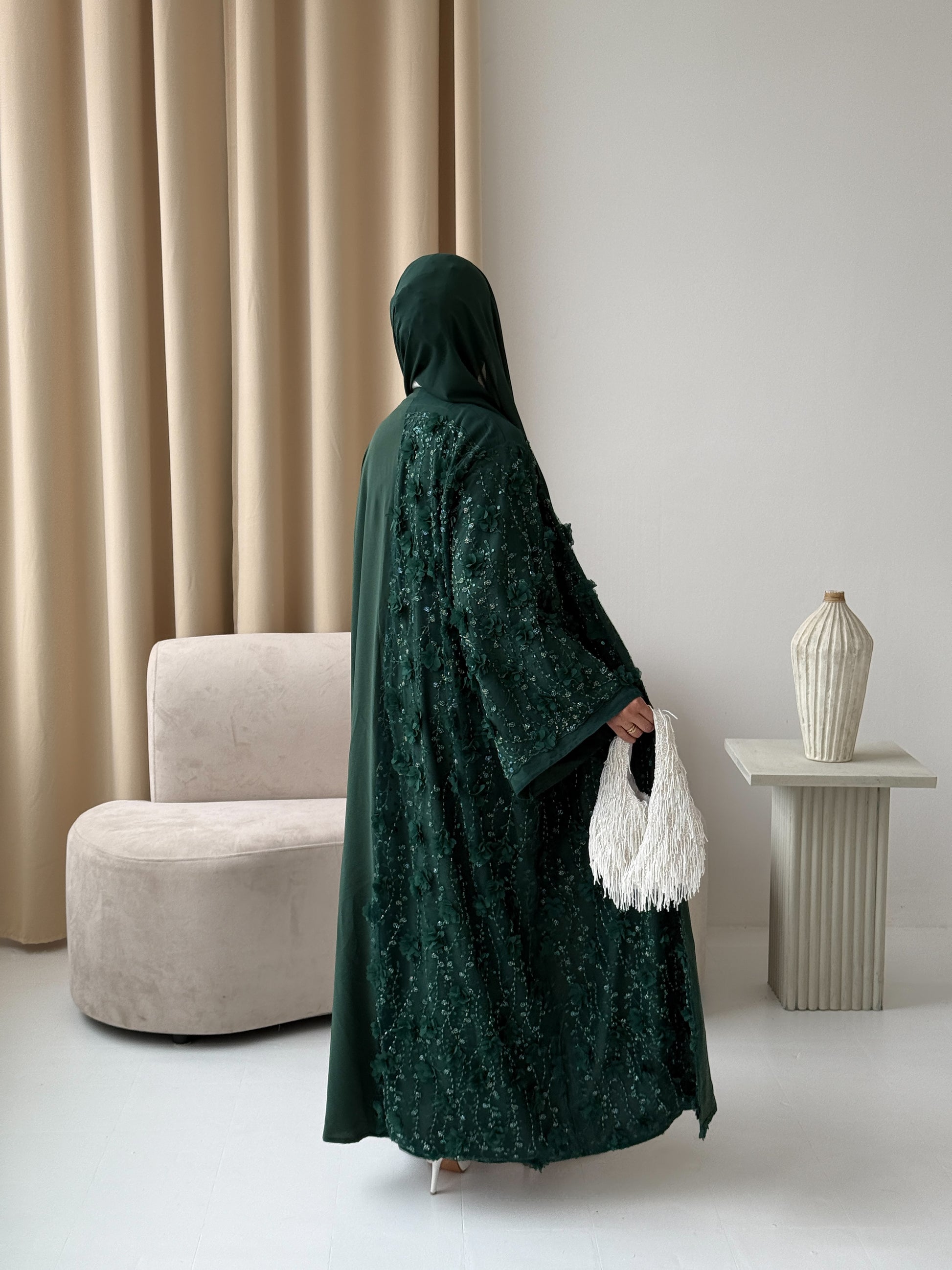 Designed in a graceful half-and-half style, one side features intricate 3D floral embroidery adorned with delicate beads and sequins on a soft net overlay. The buttonless silhouette offers a slight oversized fit for an effortless look. Finished with a complimentary matching chiffon hijab, this abaya is a true statement piece for any occasion.