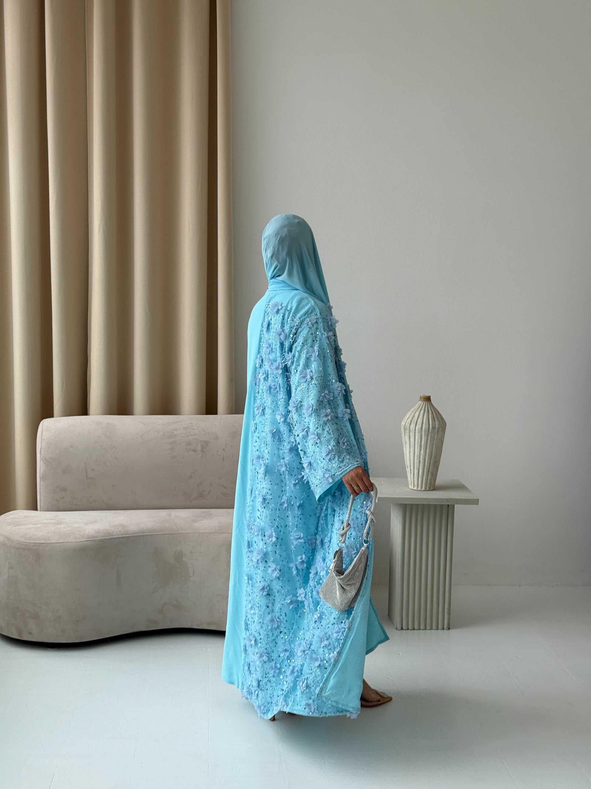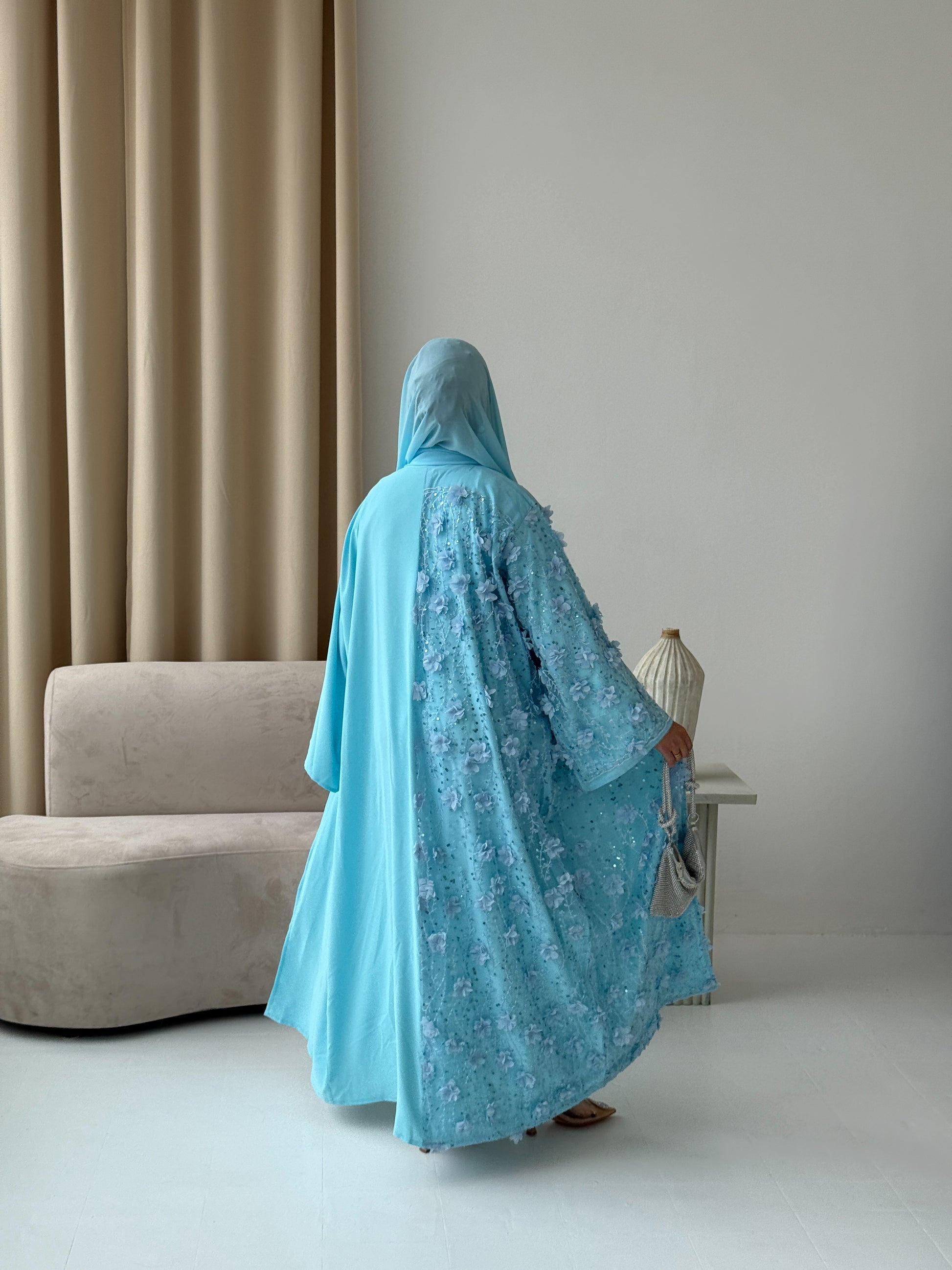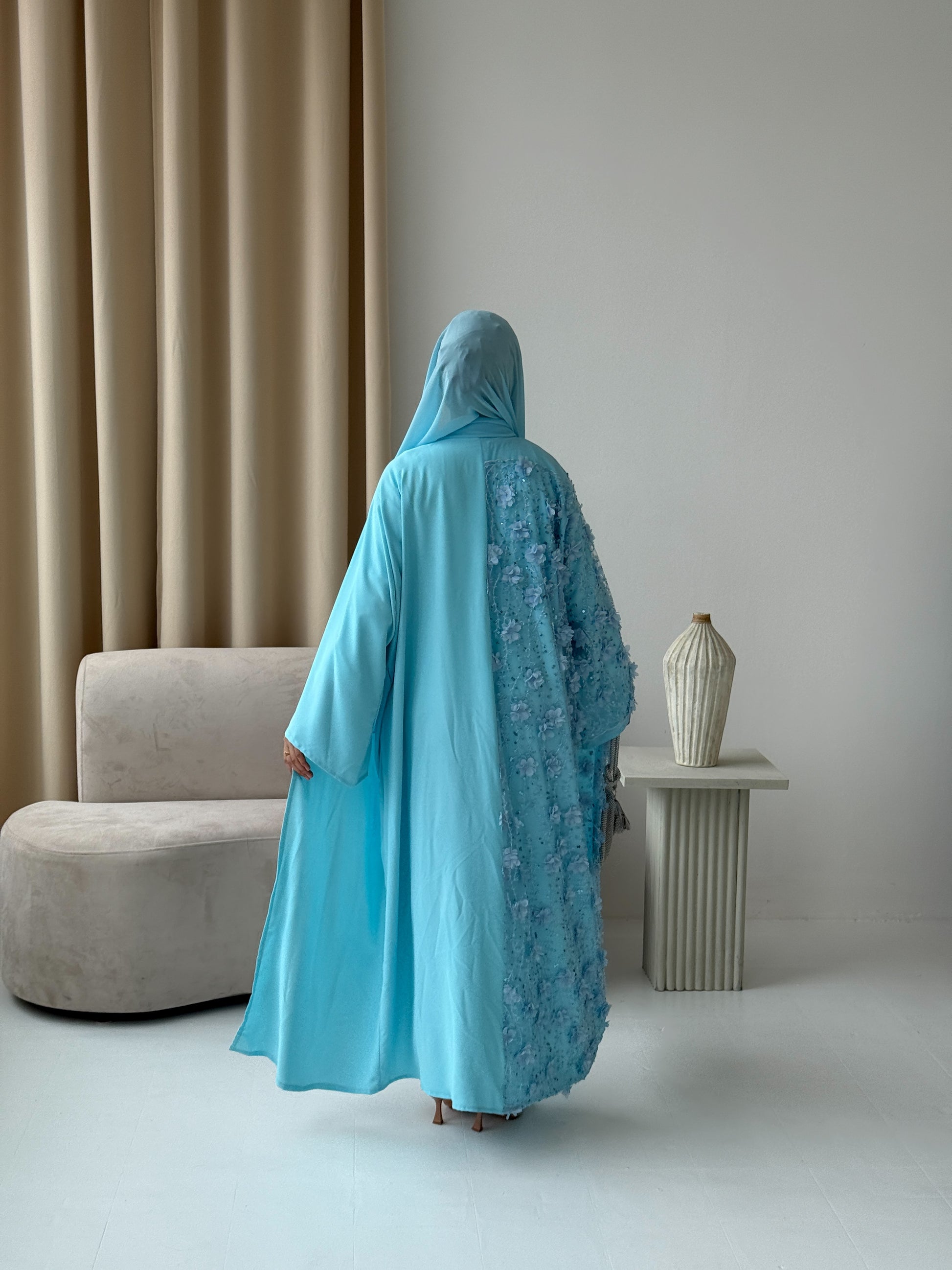 Designed in a graceful half-and-half style, one side features intricate 3D floral embroidery adorned with delicate beads and sequins on a soft net overlay. The buttonless silhouette offers a slight oversized fit for an effortless look. Finished with a complimentary matching chiffon hijab, this abaya is a true statement piece for any occasion.
