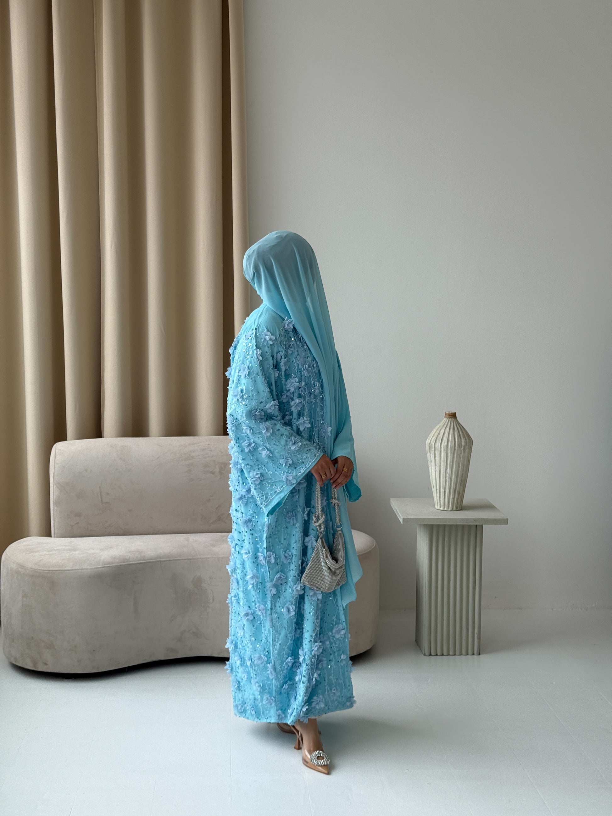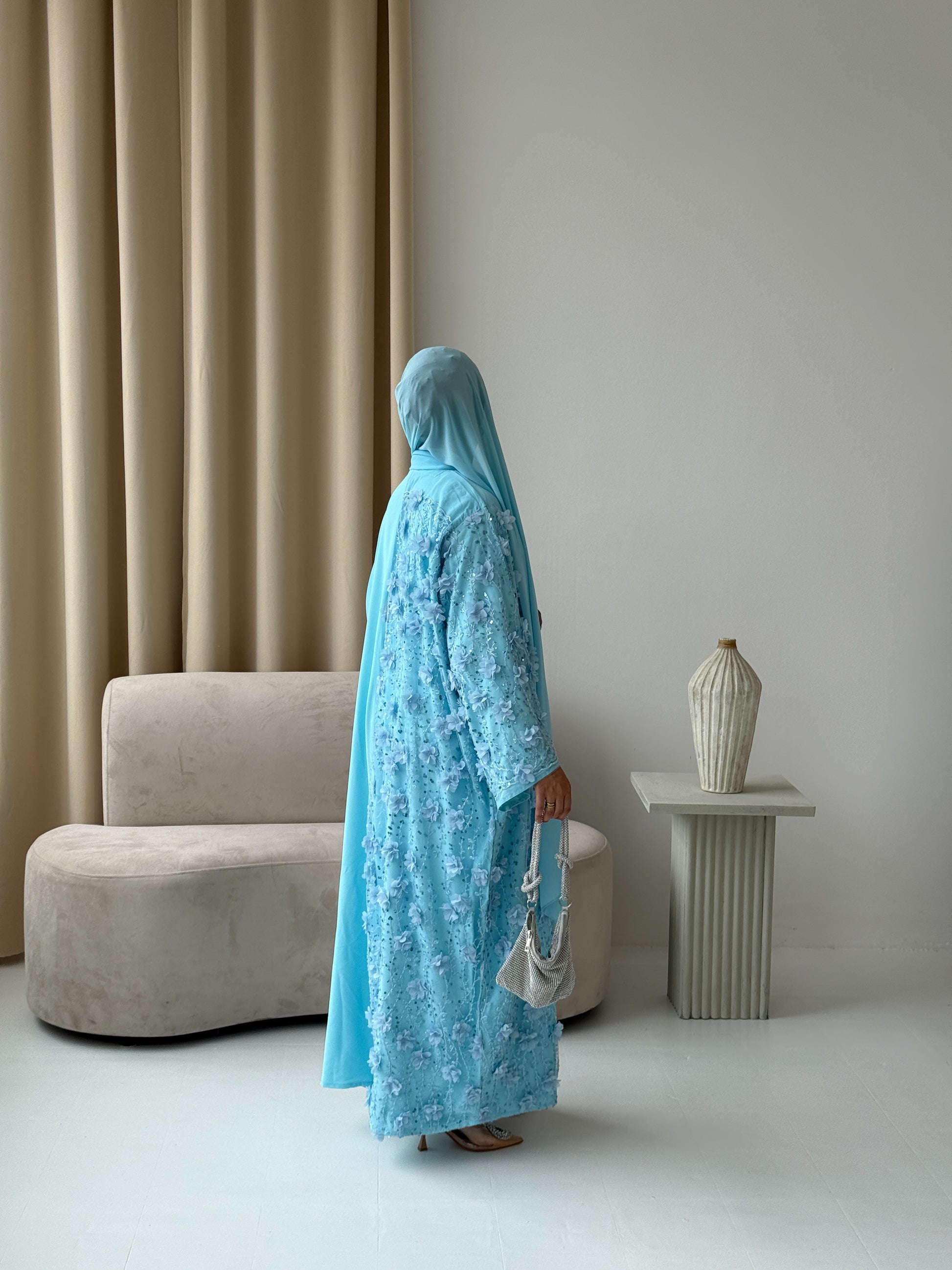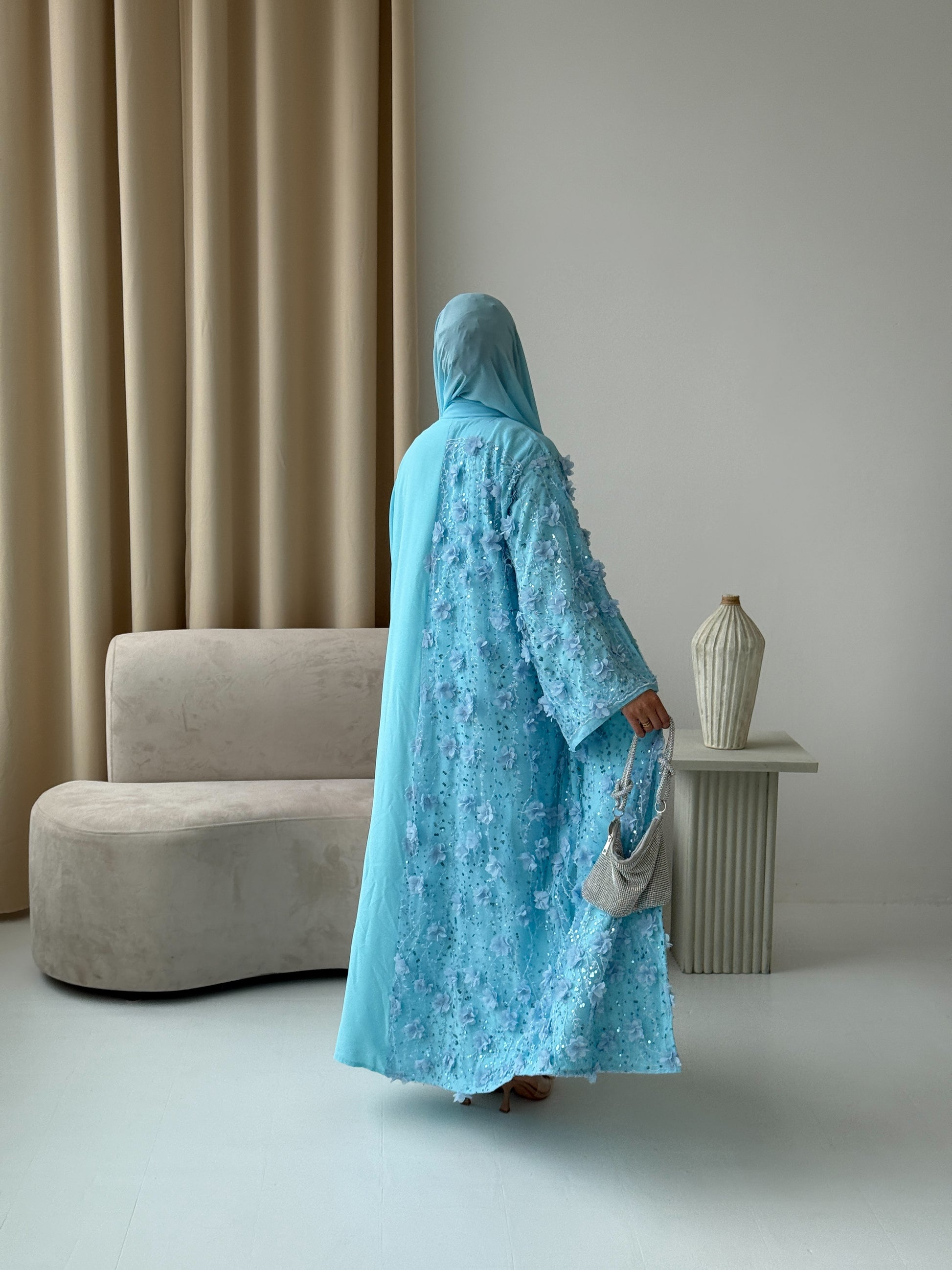 Designed in a graceful half-and-half style, one side features intricate 3D floral embroidery adorned with delicate beads and sequins on a soft net overlay. The buttonless silhouette offers a slight oversized fit for an effortless look. Finished with a complimentary matching chiffon hijab, this abaya is a true statement piece for any occasion.