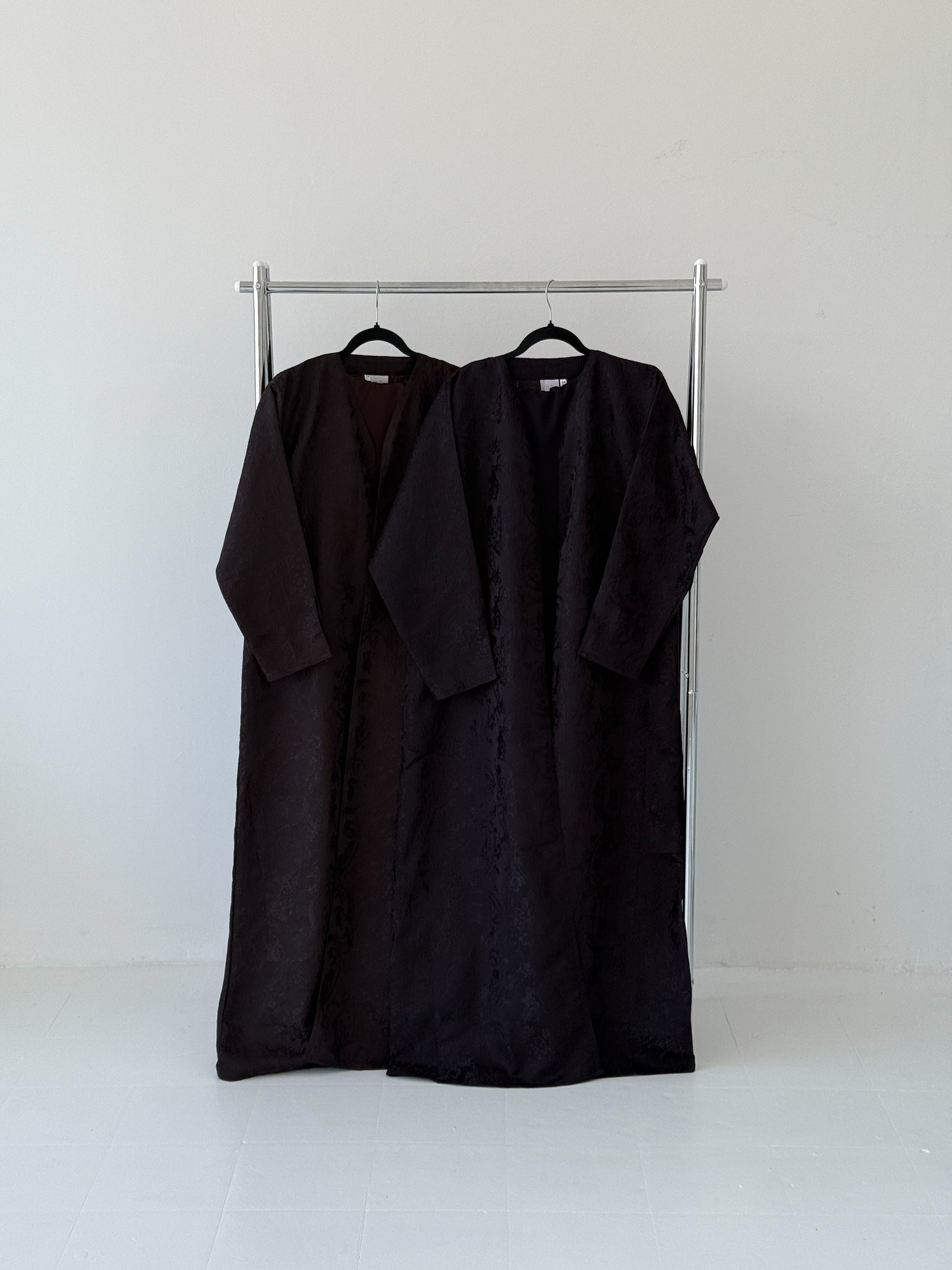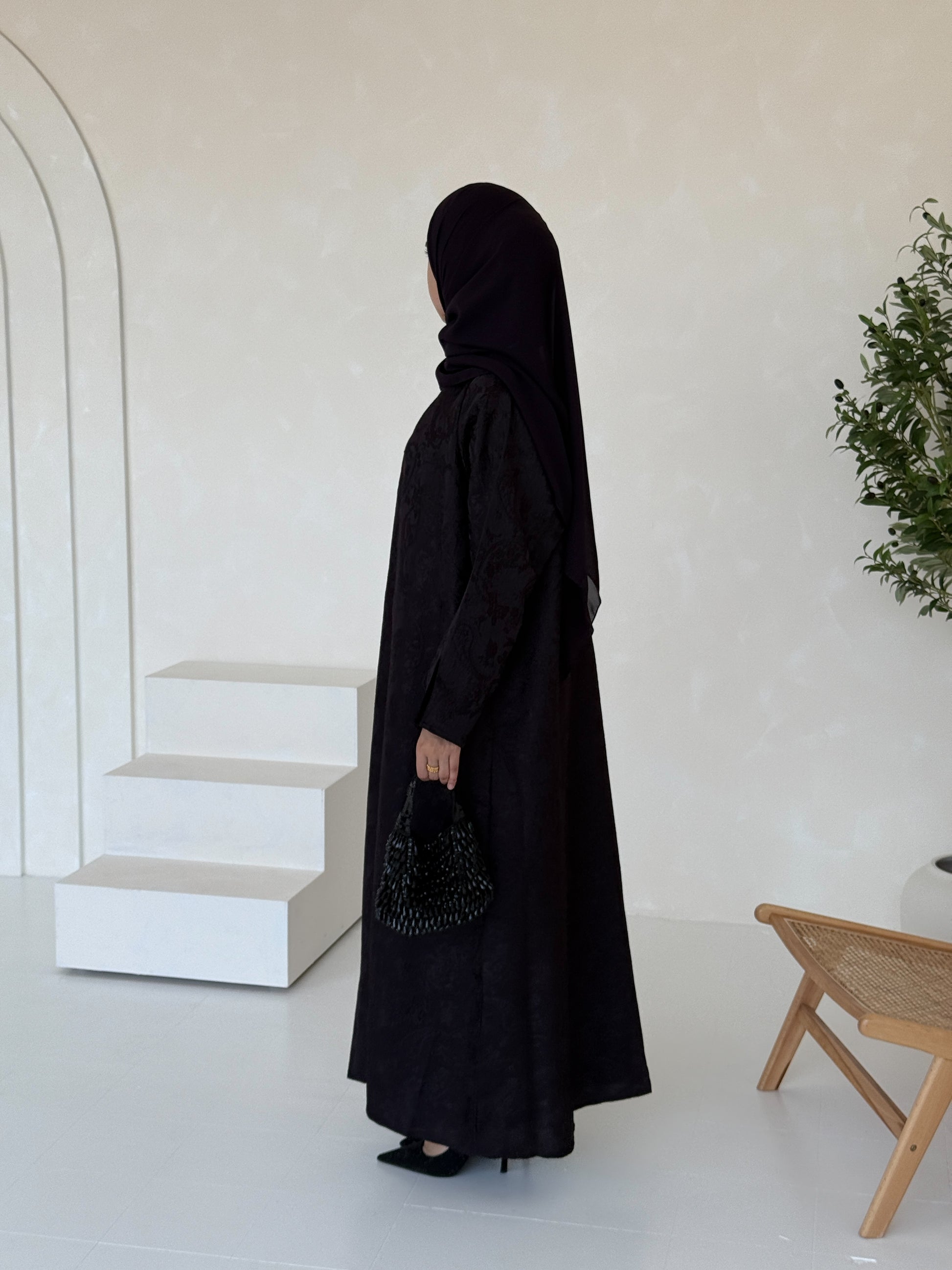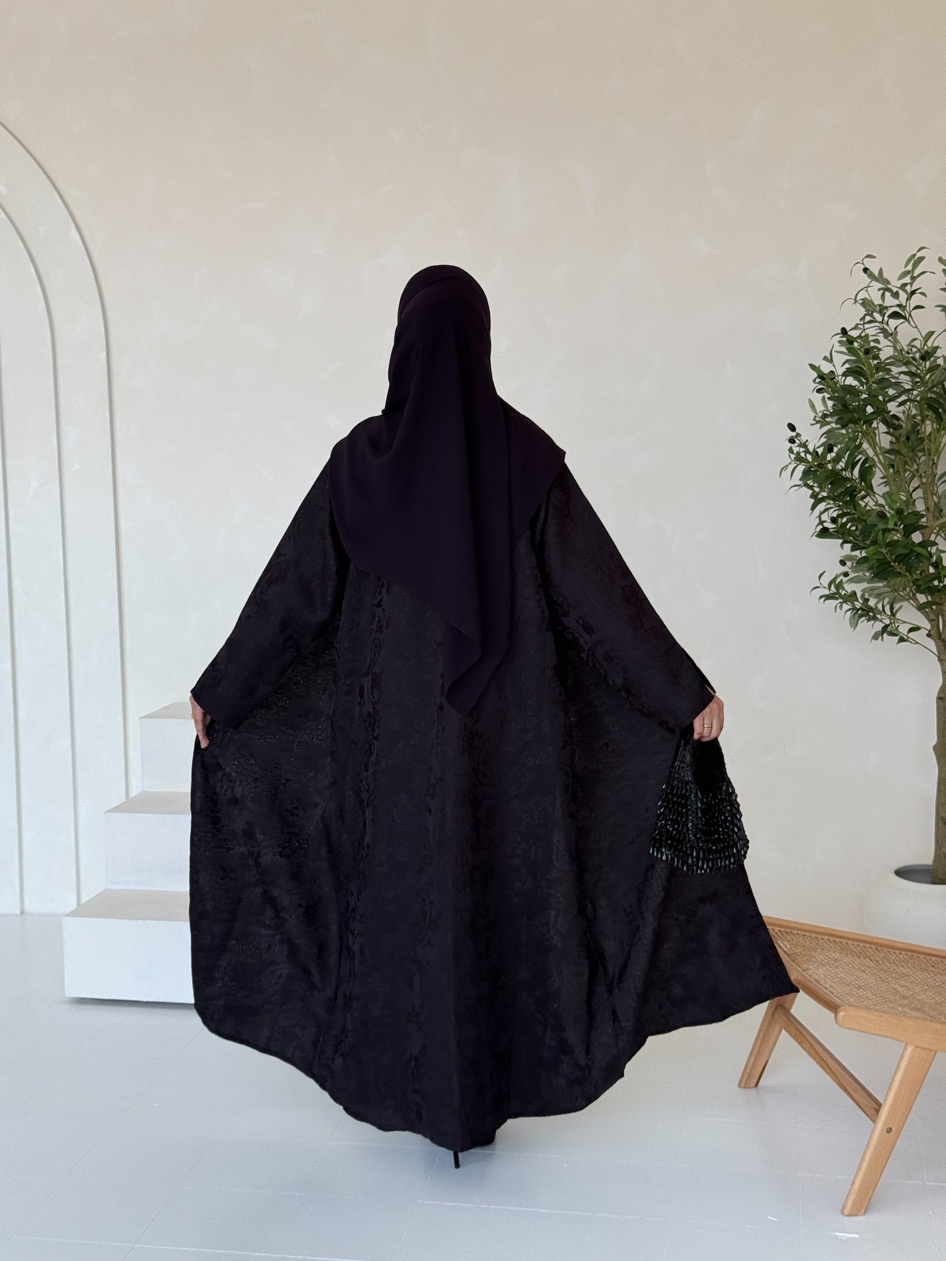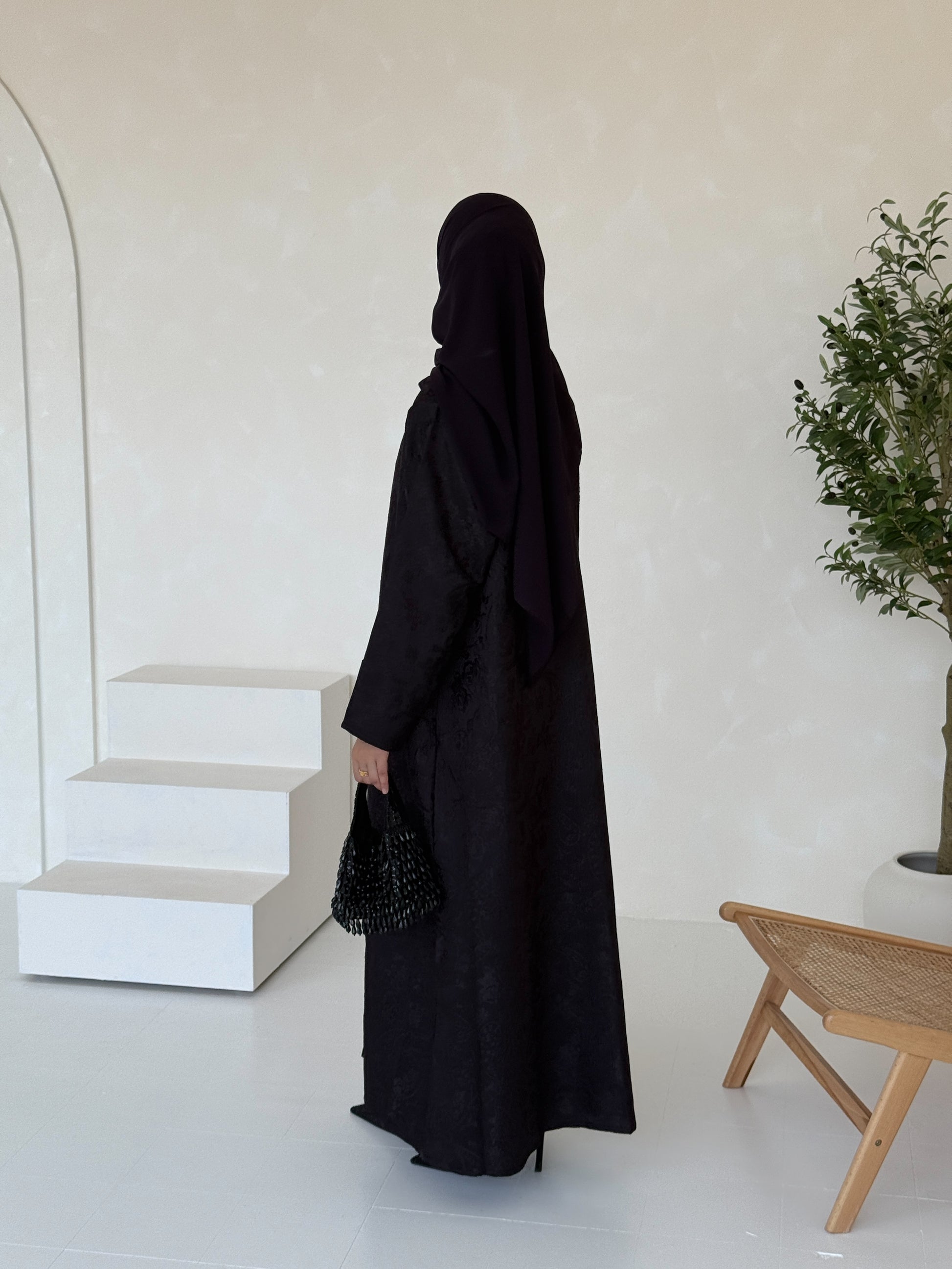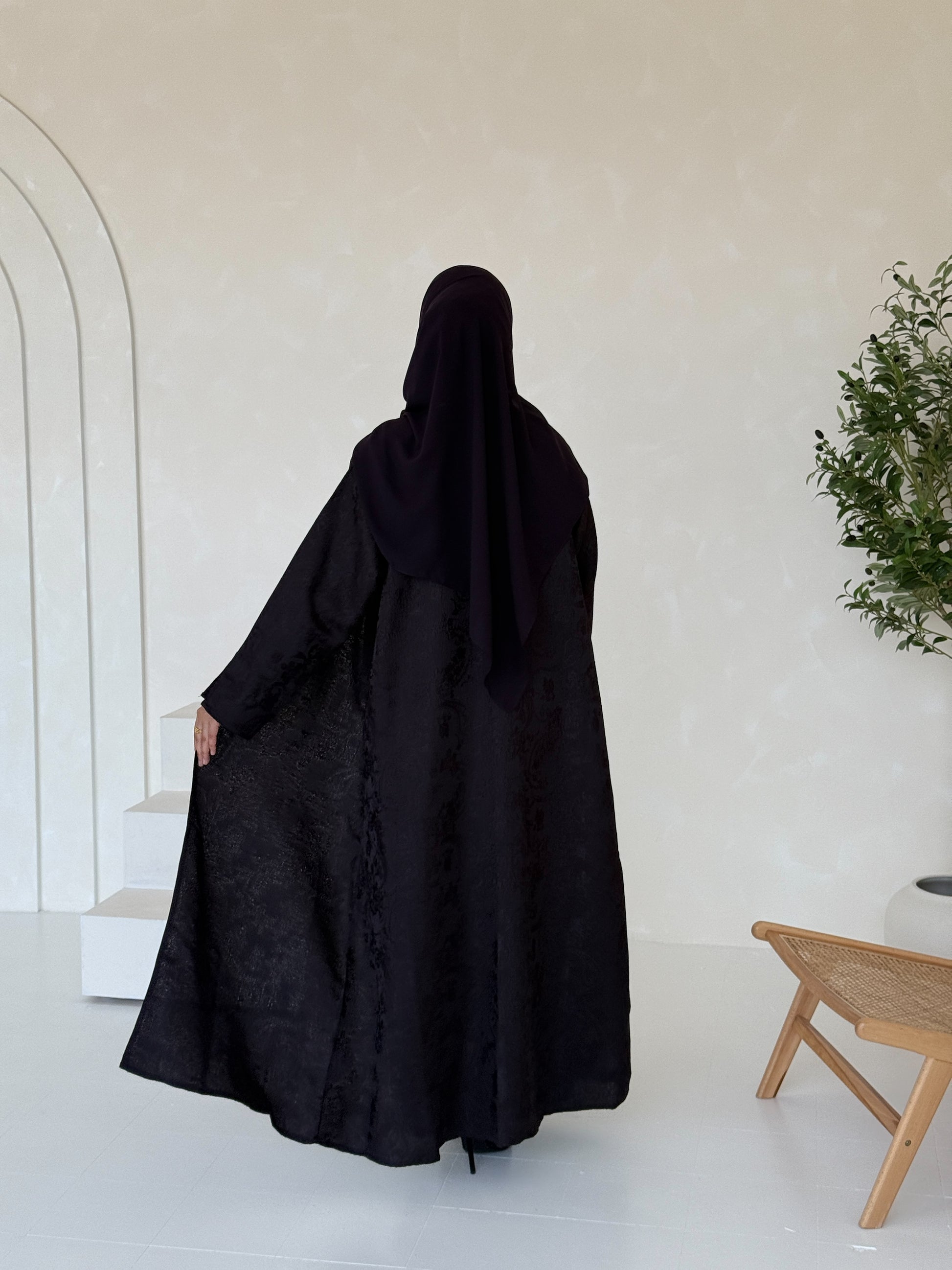 A timeless blend of structure and elegance, this three-piece set features an open abaya crafted in a rich, textured fabric with a subtle Henna-inspired print. The abaya is made from a high-quality, slightly structured fabric that holds its shape beautifully. It features a 4.5 inch split sleeve for a graceful silhouette. The set includes a matching Korean Nida slip dress for ultimate comfort and a complimentary chiffon hijab to complete the look.