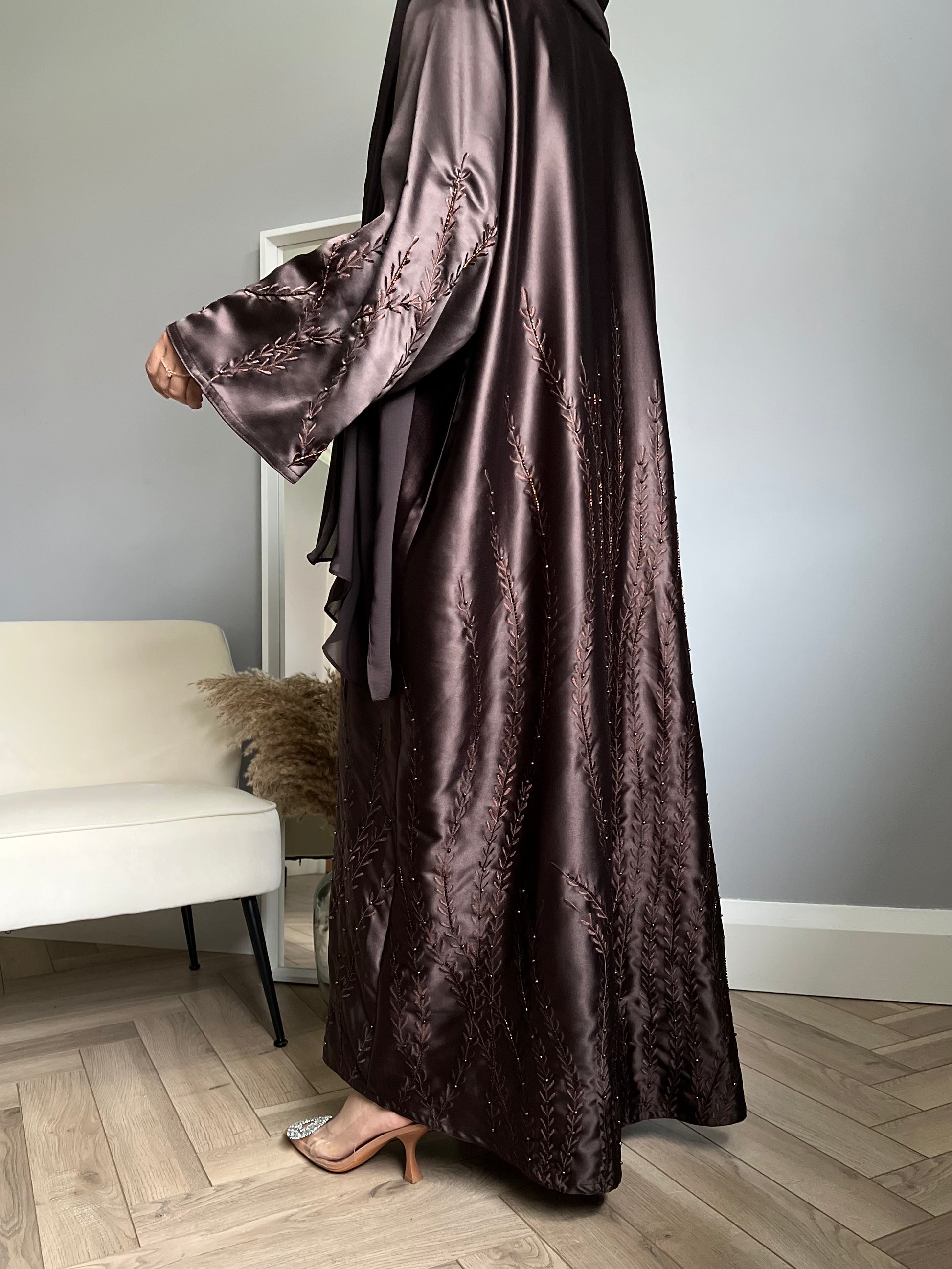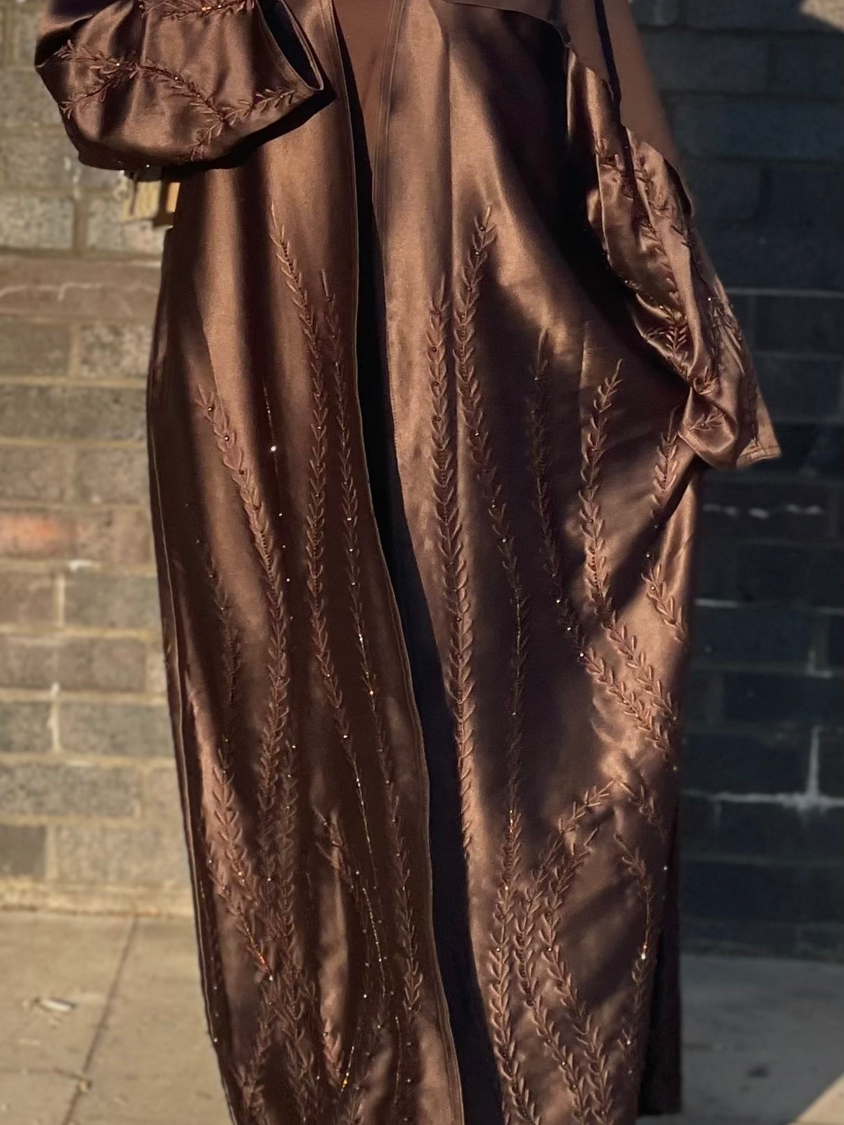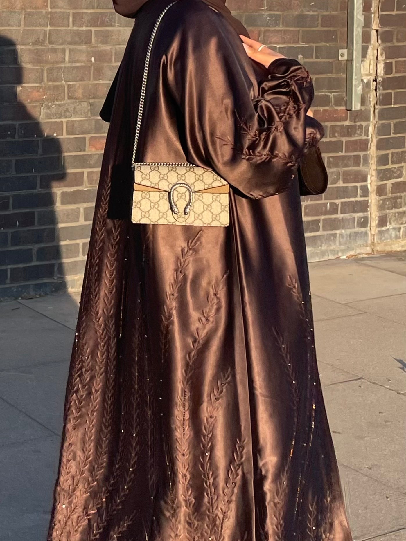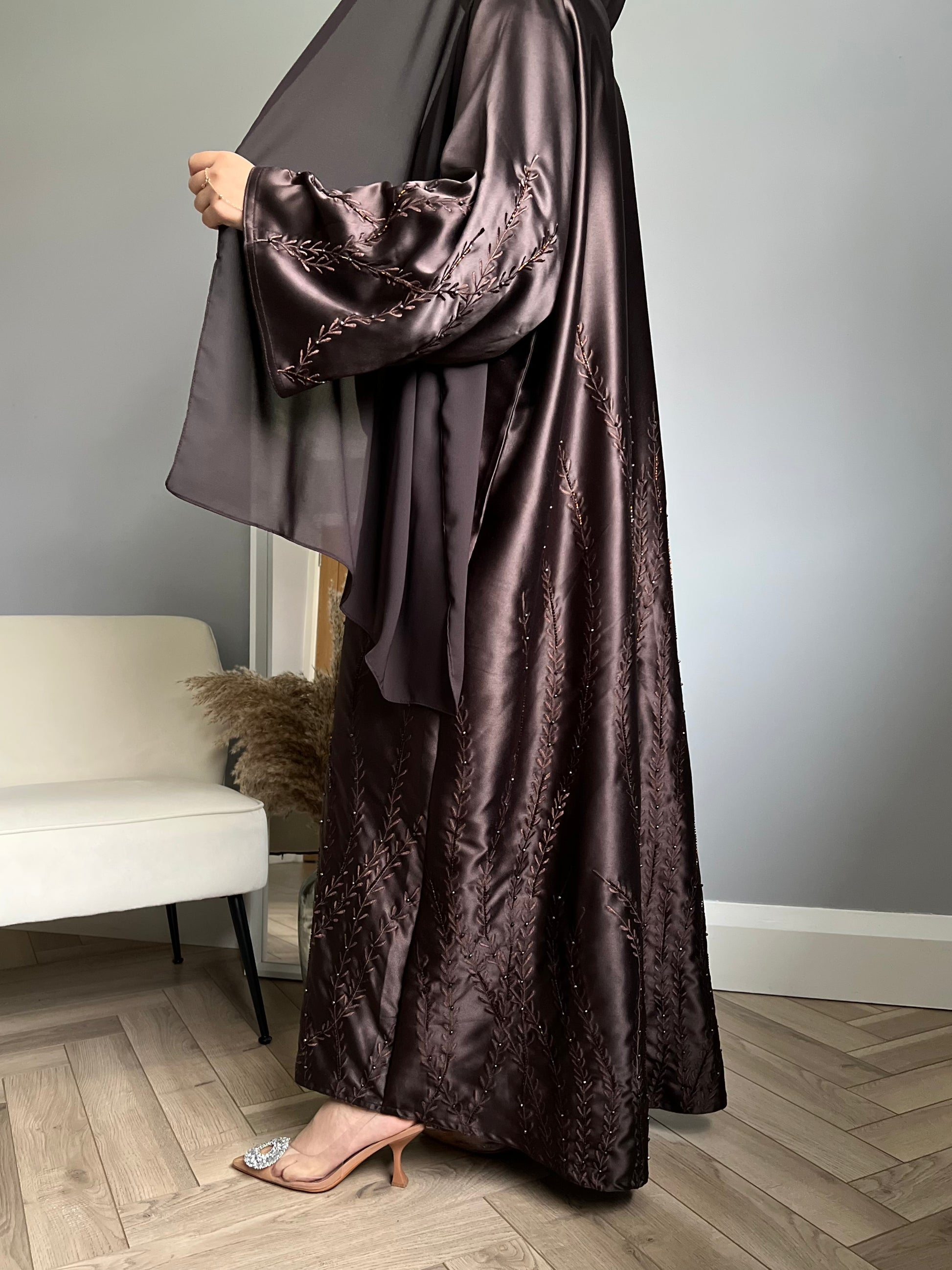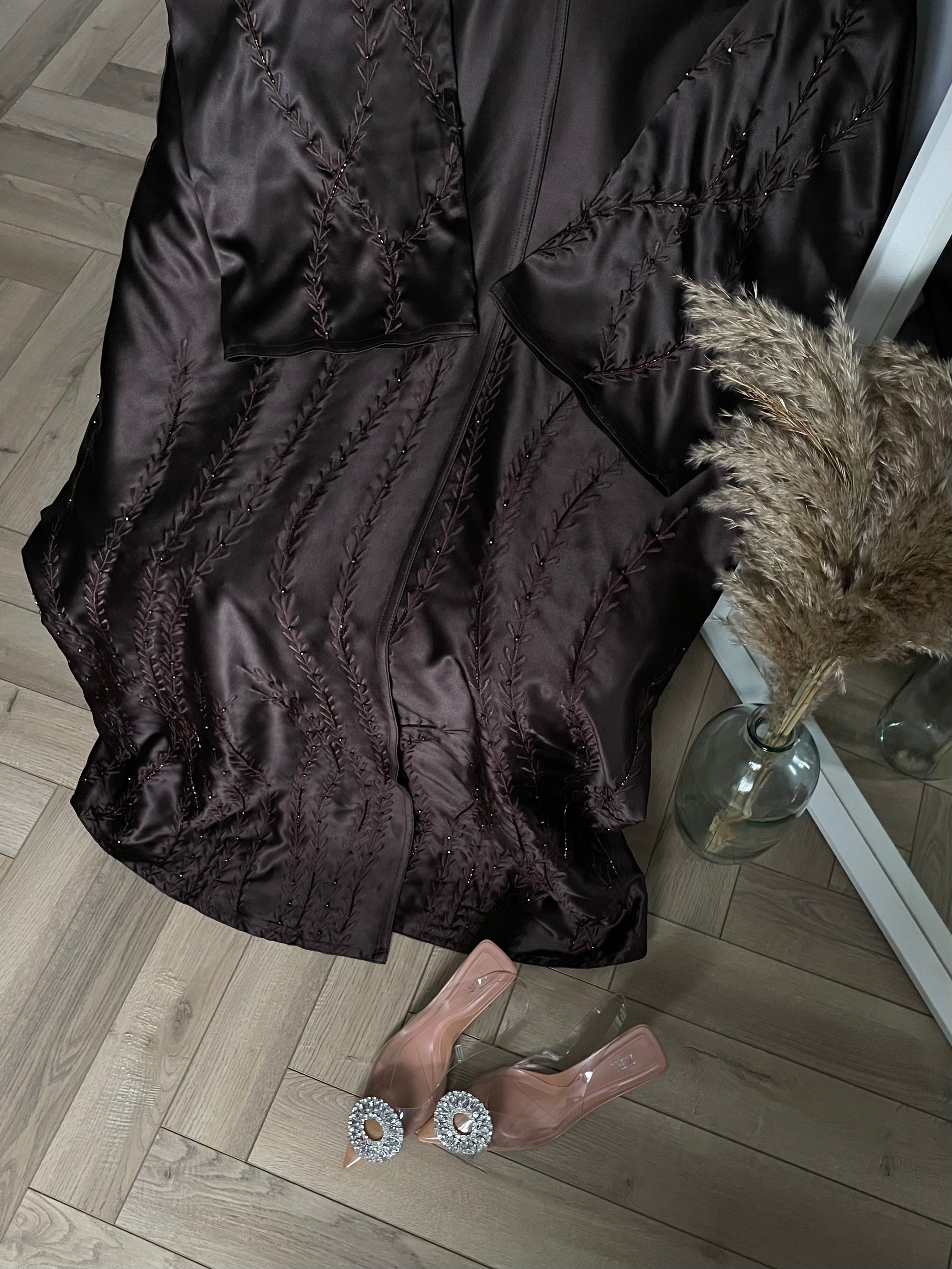This gorgeous chocolate brown open abaya has been hand crafted with intricate embellishment and thread work which cascades down the sleeves and all around the bottom of the abaya. Oversized fitting with a generous wrap and slight flare for a graceful look. Made with the finest luxury silk fabric, a weighted material. Comes with a matching premium chiffon hijab. Perfect for Eid, weddings or any special occasion where you want to look elegant, classy & sophisticated.