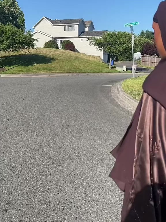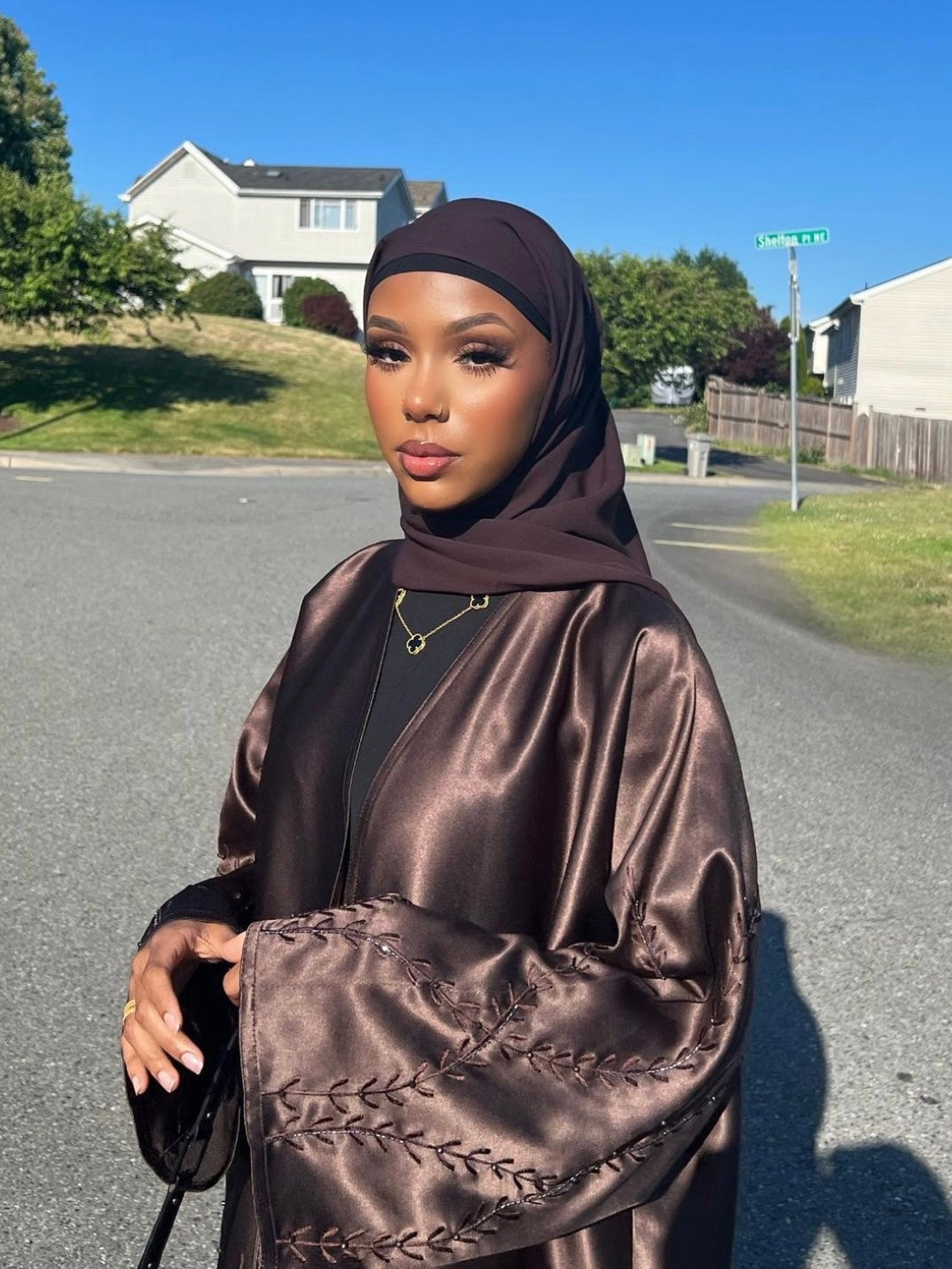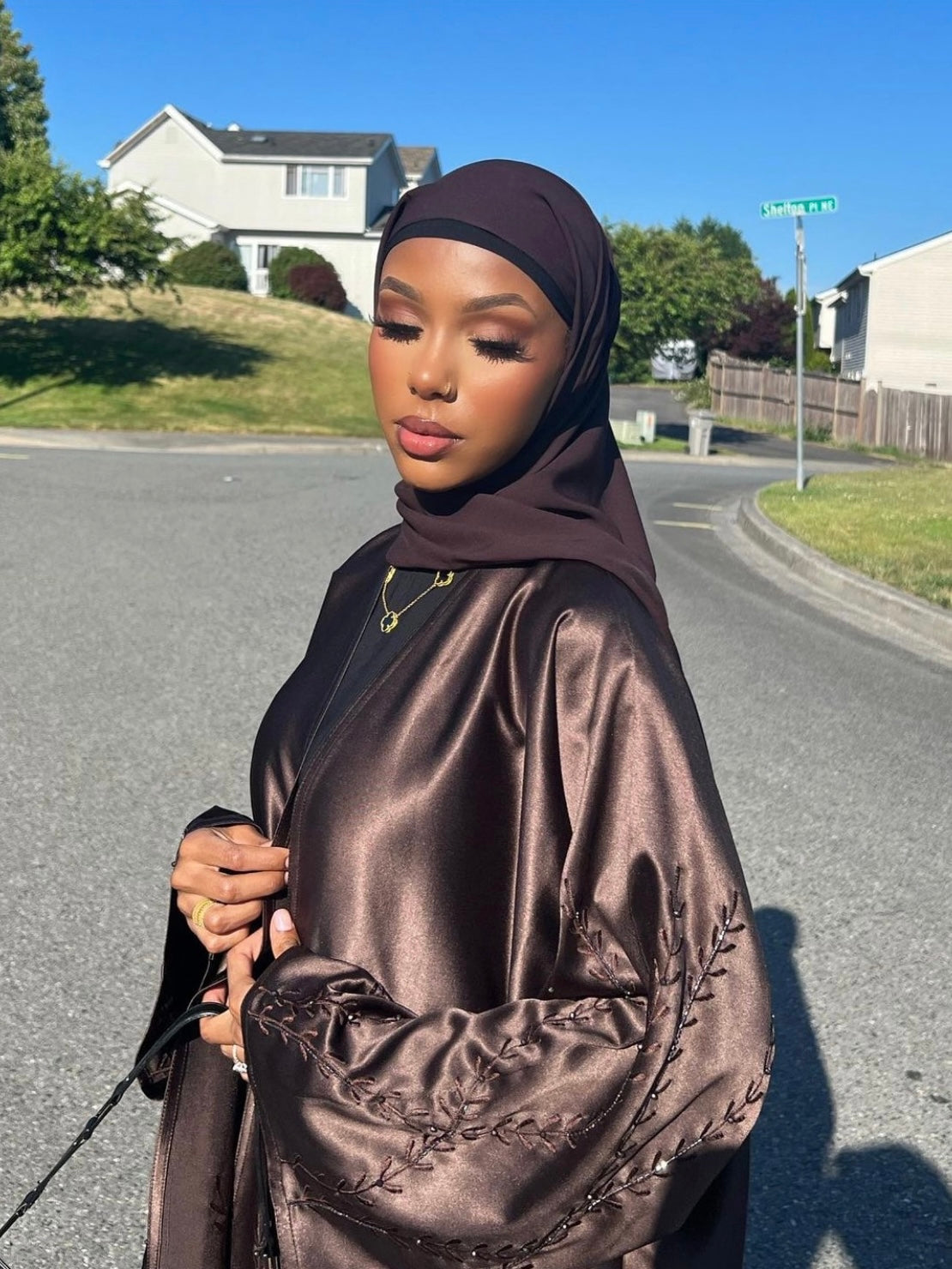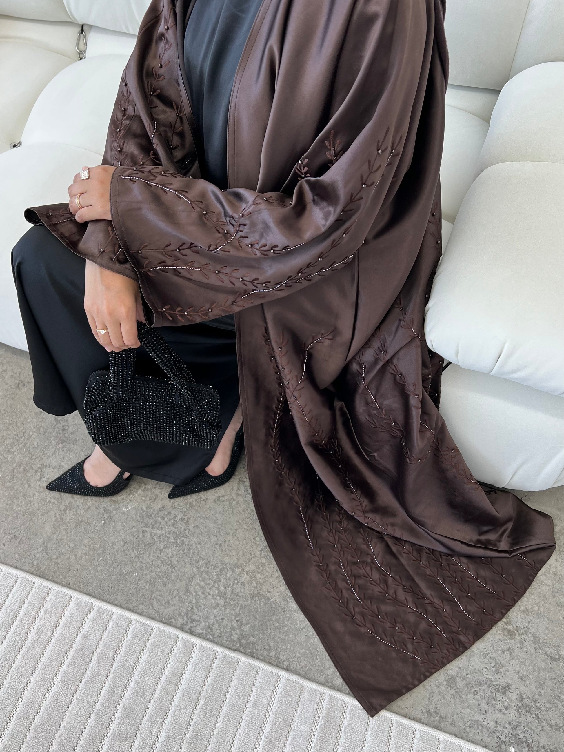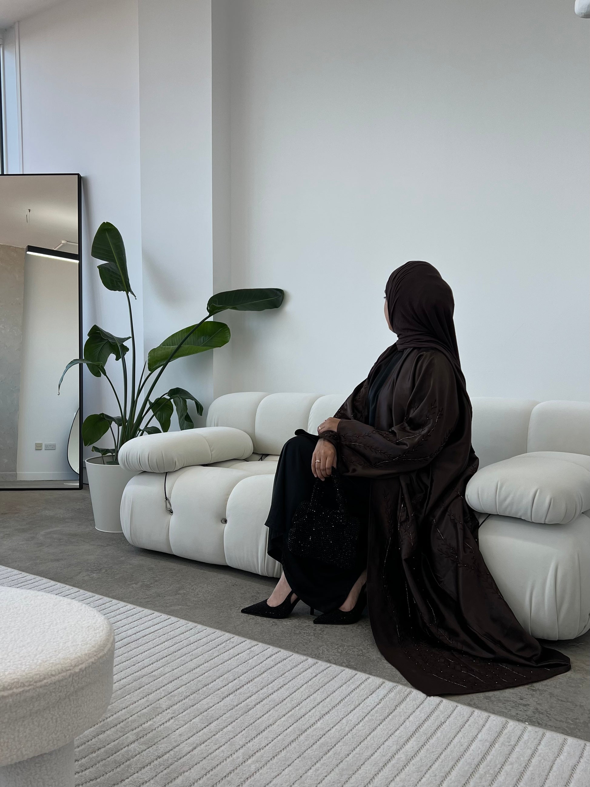 This gorgeous chocolate brown open abaya has been hand crafted with intricate embellishment and thread work which cascades down the sleeves and all around the bottom of the abaya. Oversized fitting with a generous wrap and slight flare for a graceful look. Made with the finest luxury silk fabric, a weighted material. Comes with a matching premium chiffon hijab. Perfect for Eid, weddings or any special occasion where you want to look elegant, classy & sophisticated.