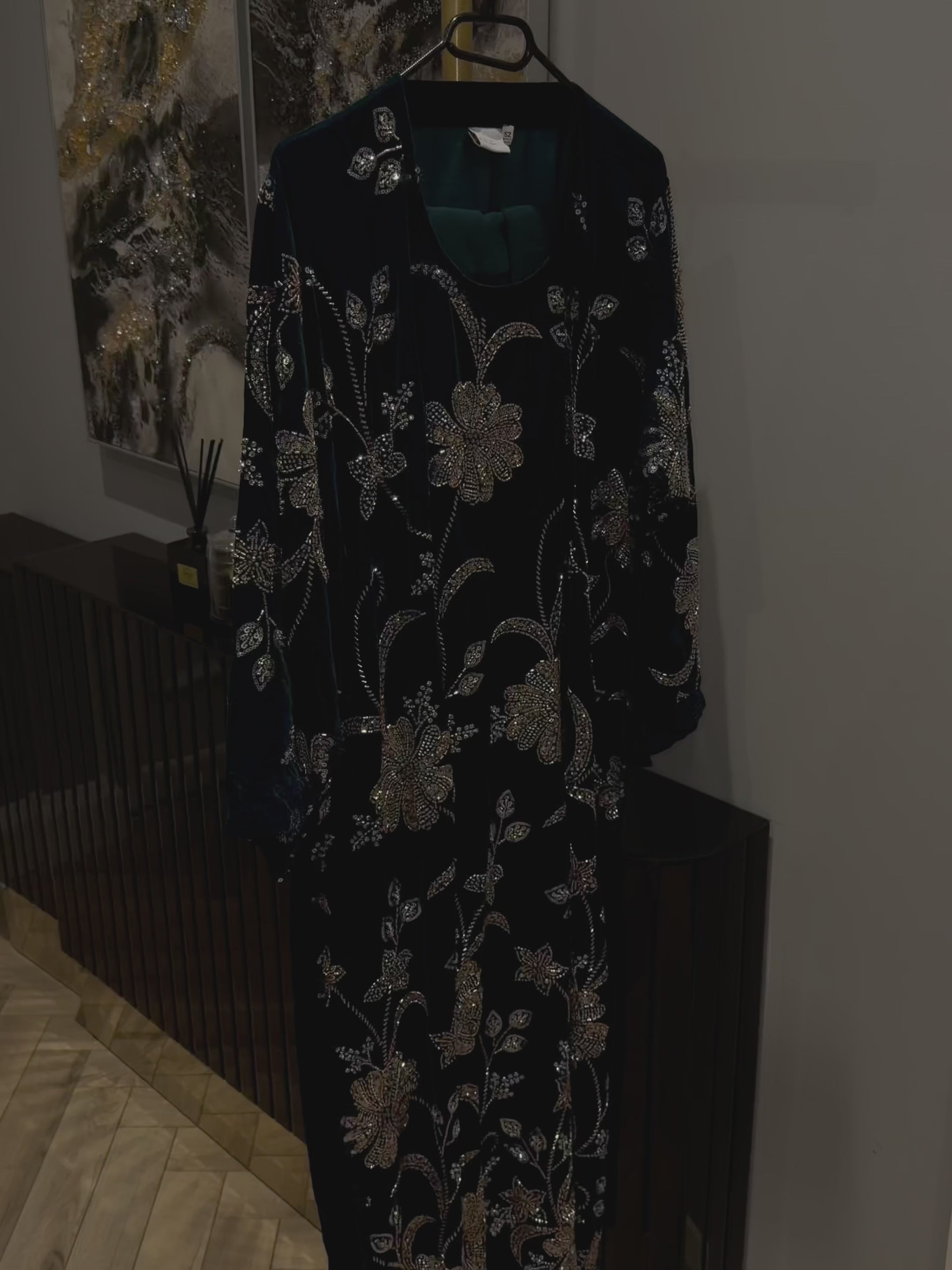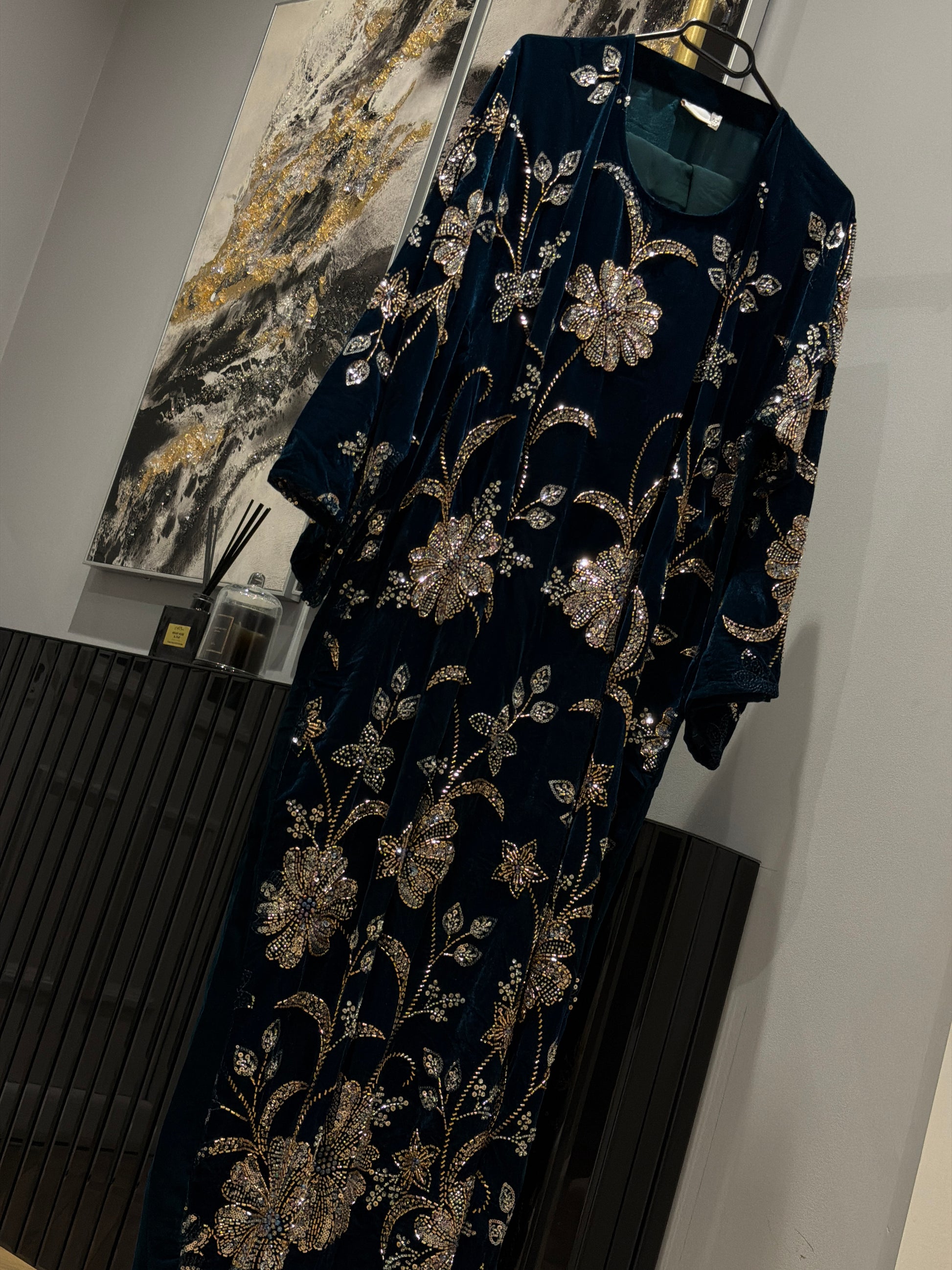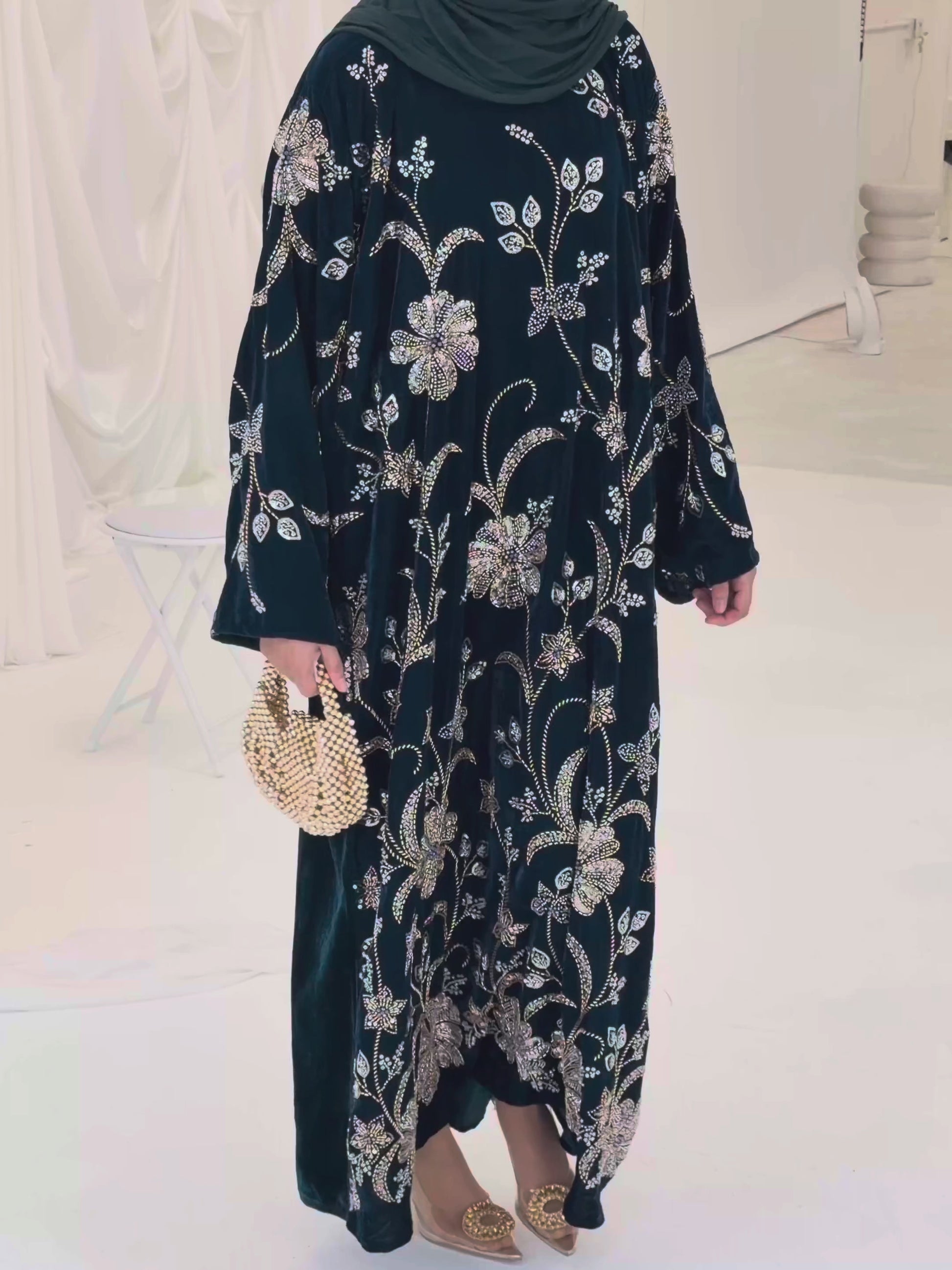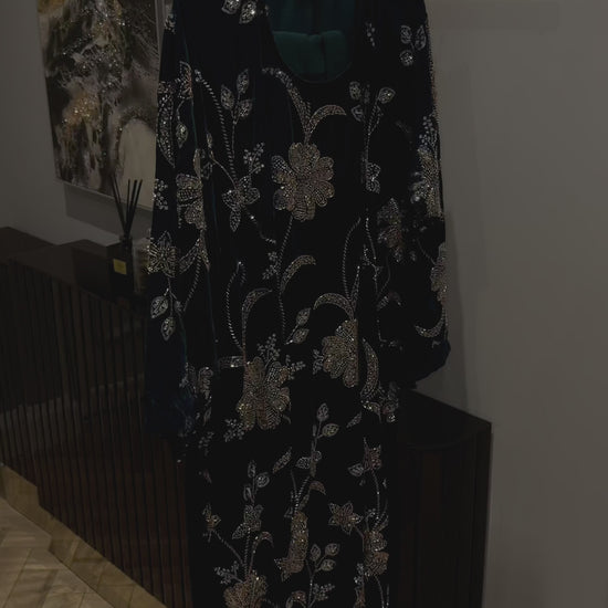 Introducing Noor, a statement abaya crafted in plush rich velvet and inspired by the timeless artistry of Pakistani design. The front is adorned with intricately arranged floral stonework, where delicate vines flow gracefully into hand finished blooms, creating an elegant silhouette.
