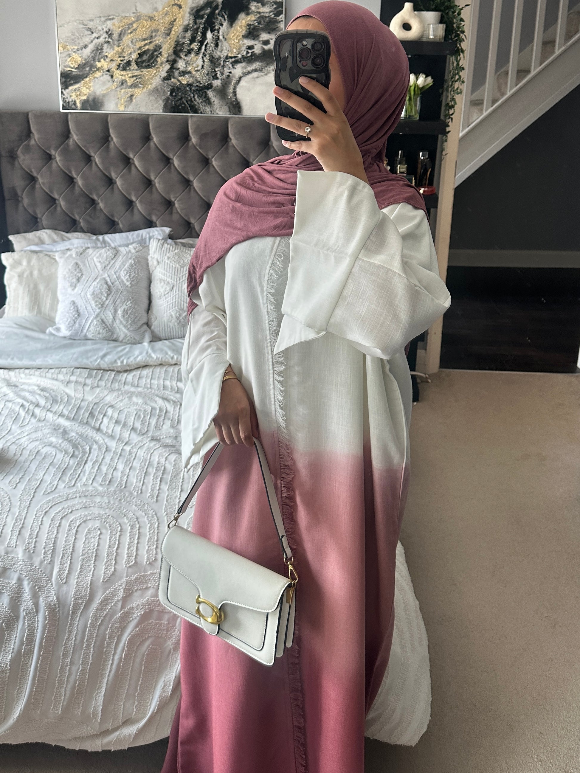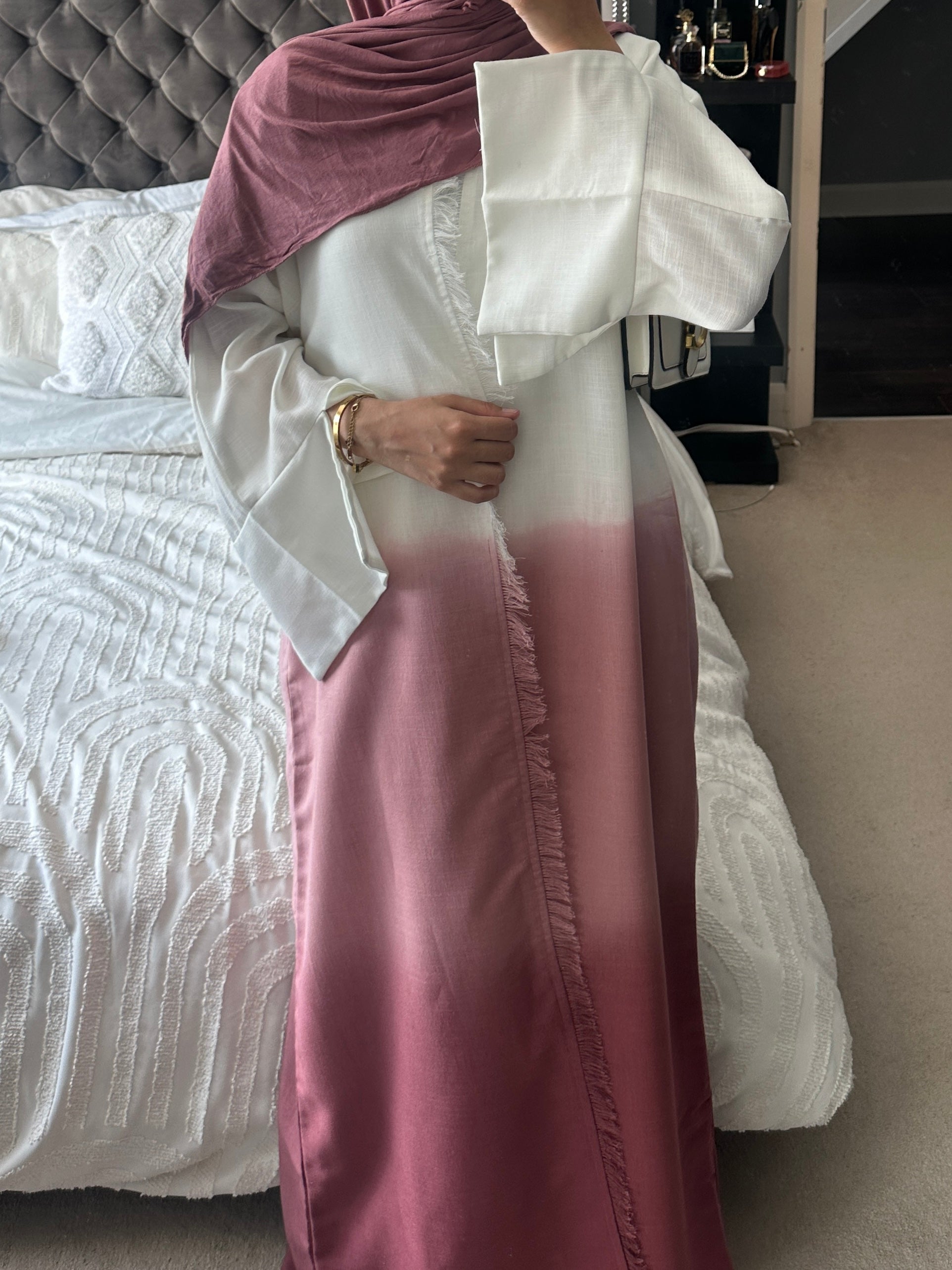 The perfect summer abaya for the upcoming heatwave! Crafted from premium soft linen - a super soft, breathable, and lightweight fabric. The ombre transition from white to a stunning raspberry hue makes it a staple piece for your modest summer wardrobe this holiday season. Featuring frayed detailing and split sleeves, it ensures you feel chic as ever!