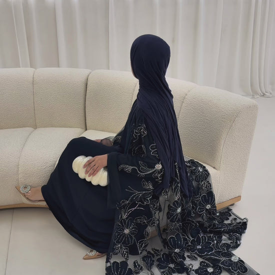 Noor Al-Ward is a vision of delicate craftsmanship and graceful layering. The open net abaya is adorned with intricate 3D ribbon satin florals, embellished with fine stone detailing throughout, creating a beautifully textured and dimensional finish. Light and ethereal, the net overlay flows effortlessly, adding depth and movement to the silhouette.