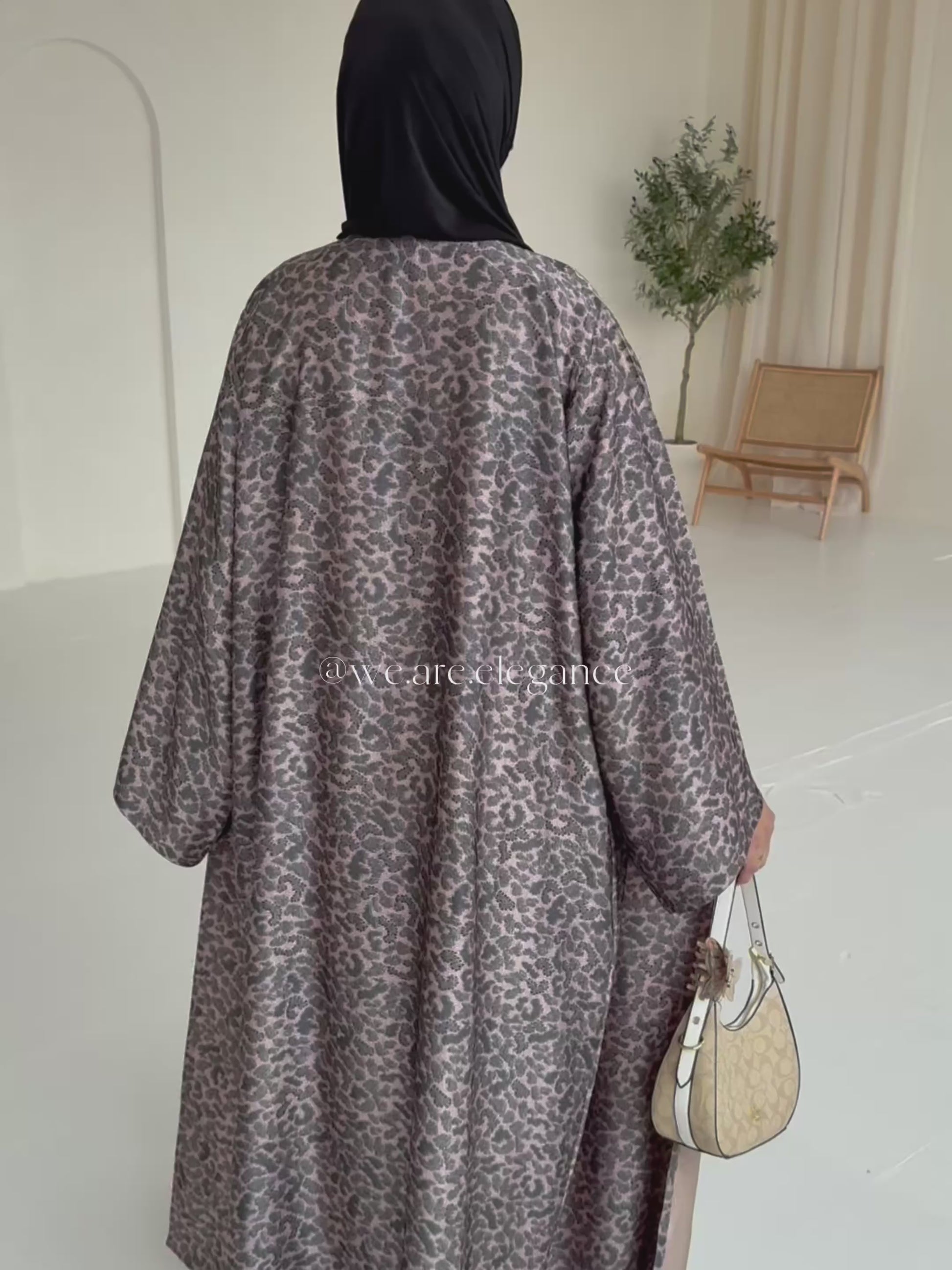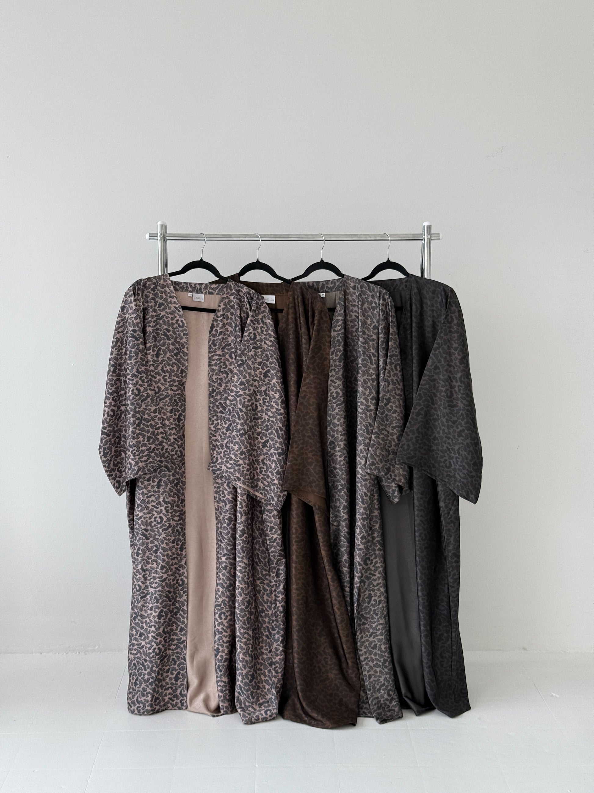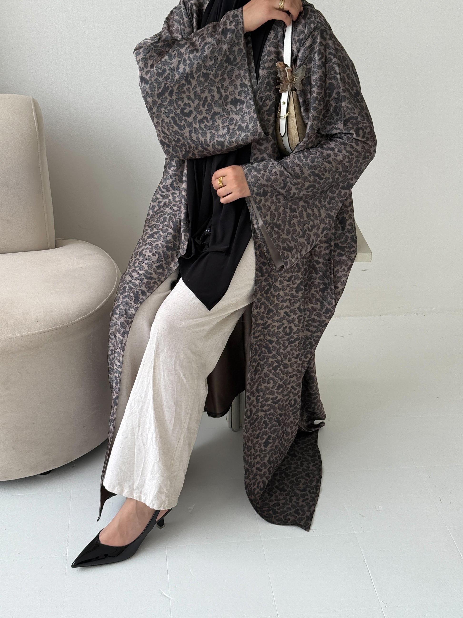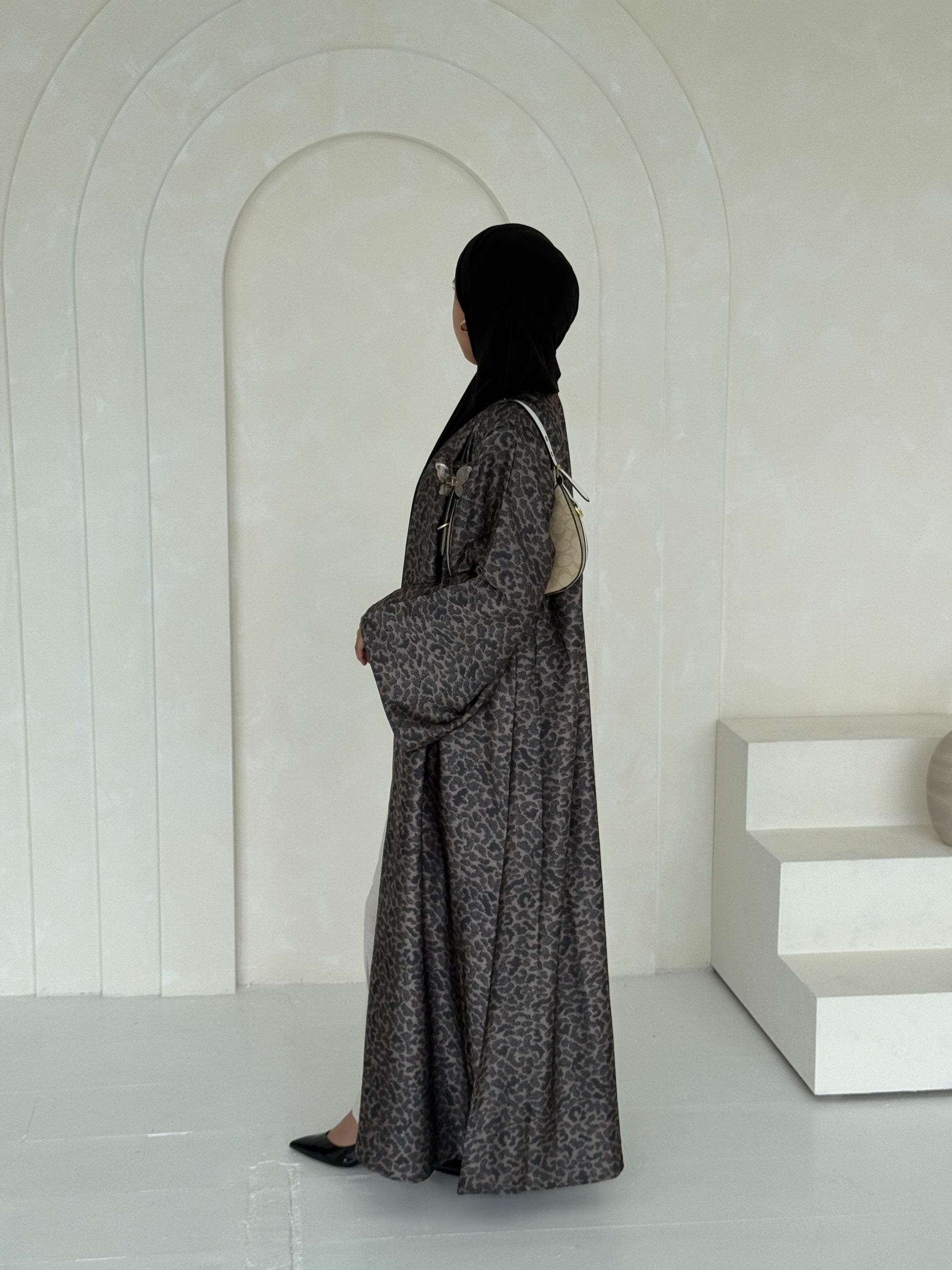 A stunning blend of fierce elegance and timeless sophistication. Crafted from luxurious satin, this abaya drapes effortlessly, offering a graceful, flowy silhouette that moves with you. The all-over leopard print adds a bold, fashion-forward flair, while the diamond-cut wide sleeves elevate the design with a touch of refinement.