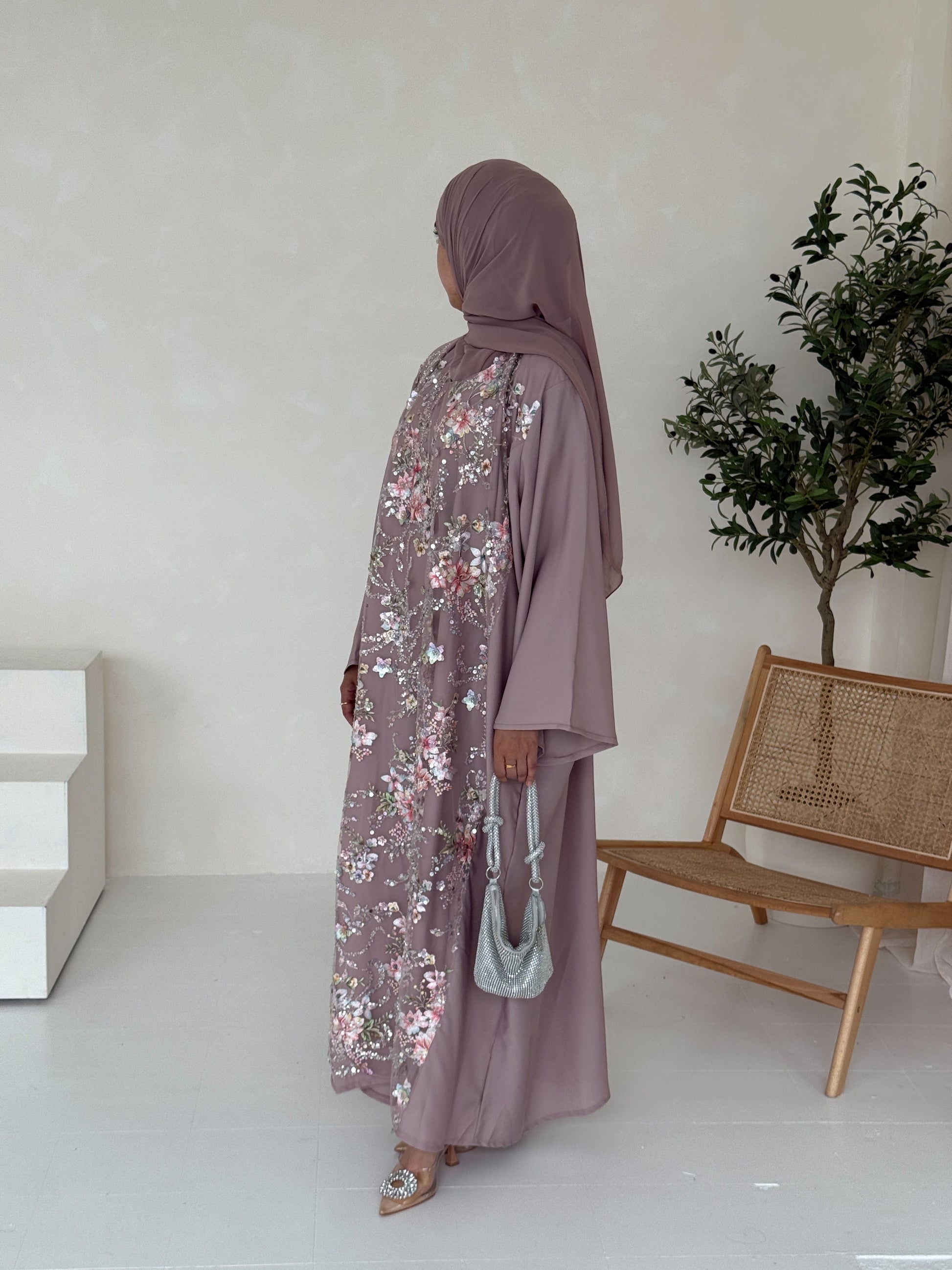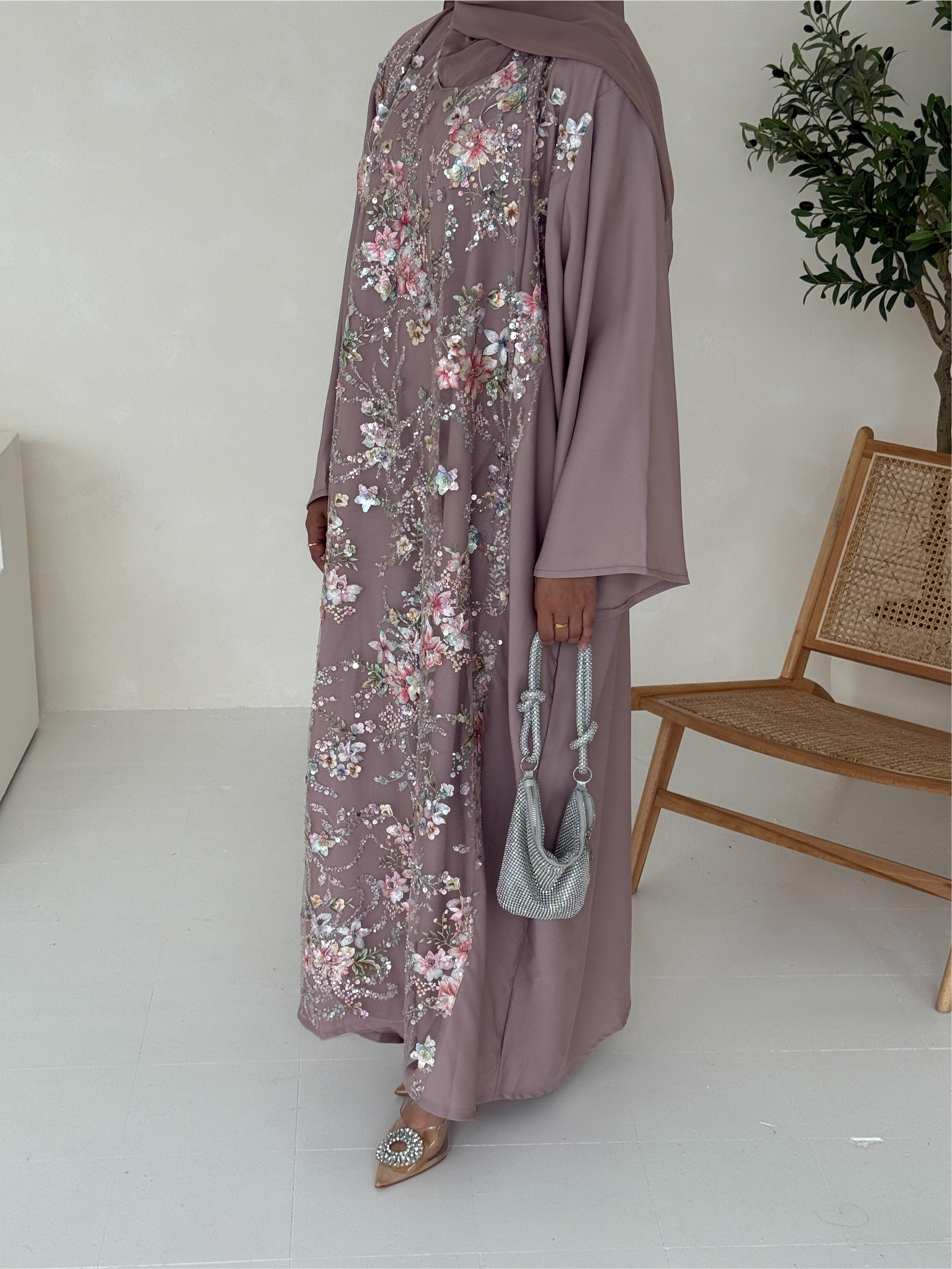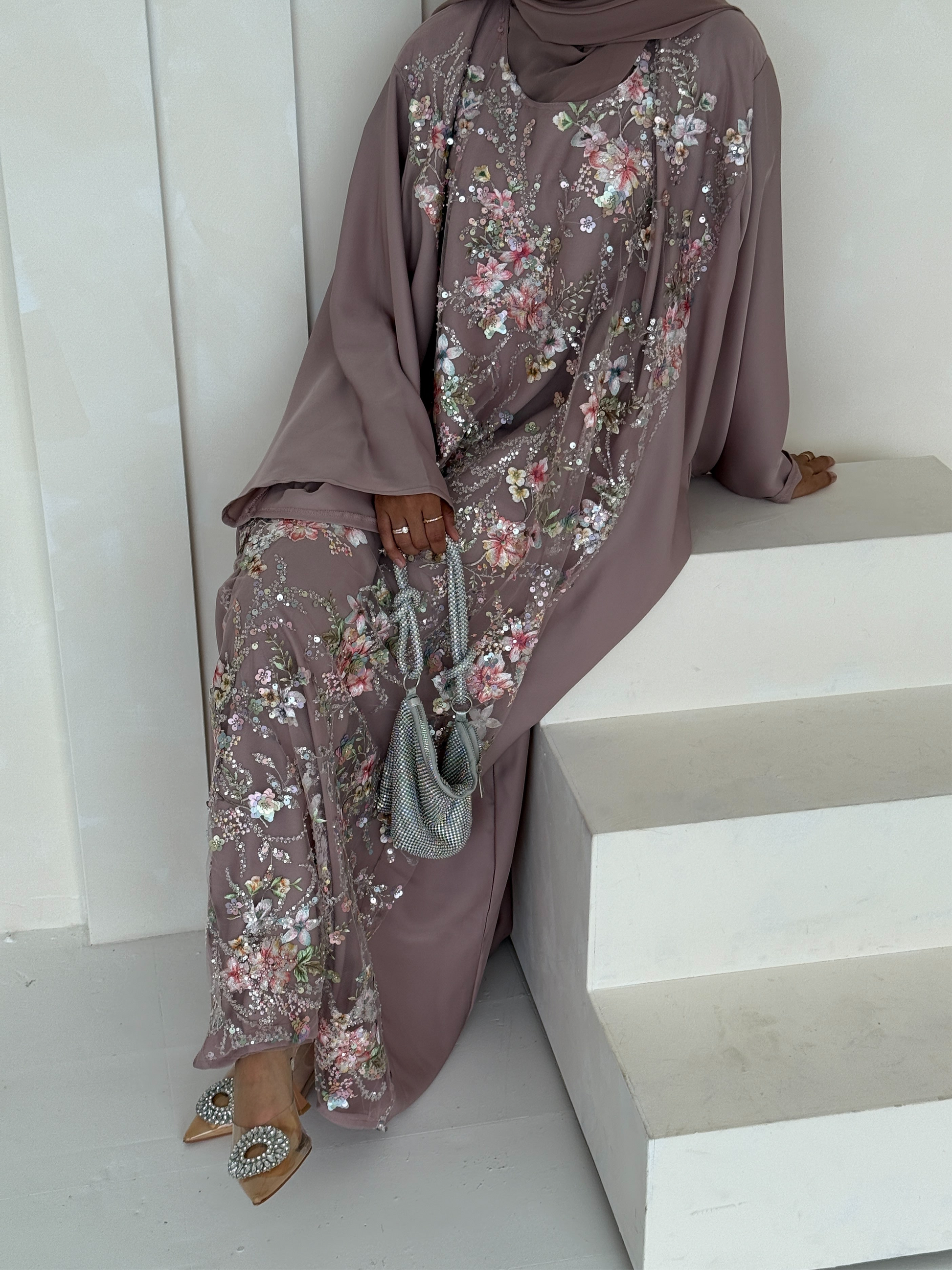 Step into a fairytale with our Botanical Gardens Abaya — a piece that beautifully captures the elegance of blooming gardens and ethereal charm. The front of the Abaya is adorned with a delicate floral sequin net, reminiscent of a tranquil botanical escape, adding a touch of shimmer and grace with every step. Lined with premium Korean Nida for a soft, breathable feel.