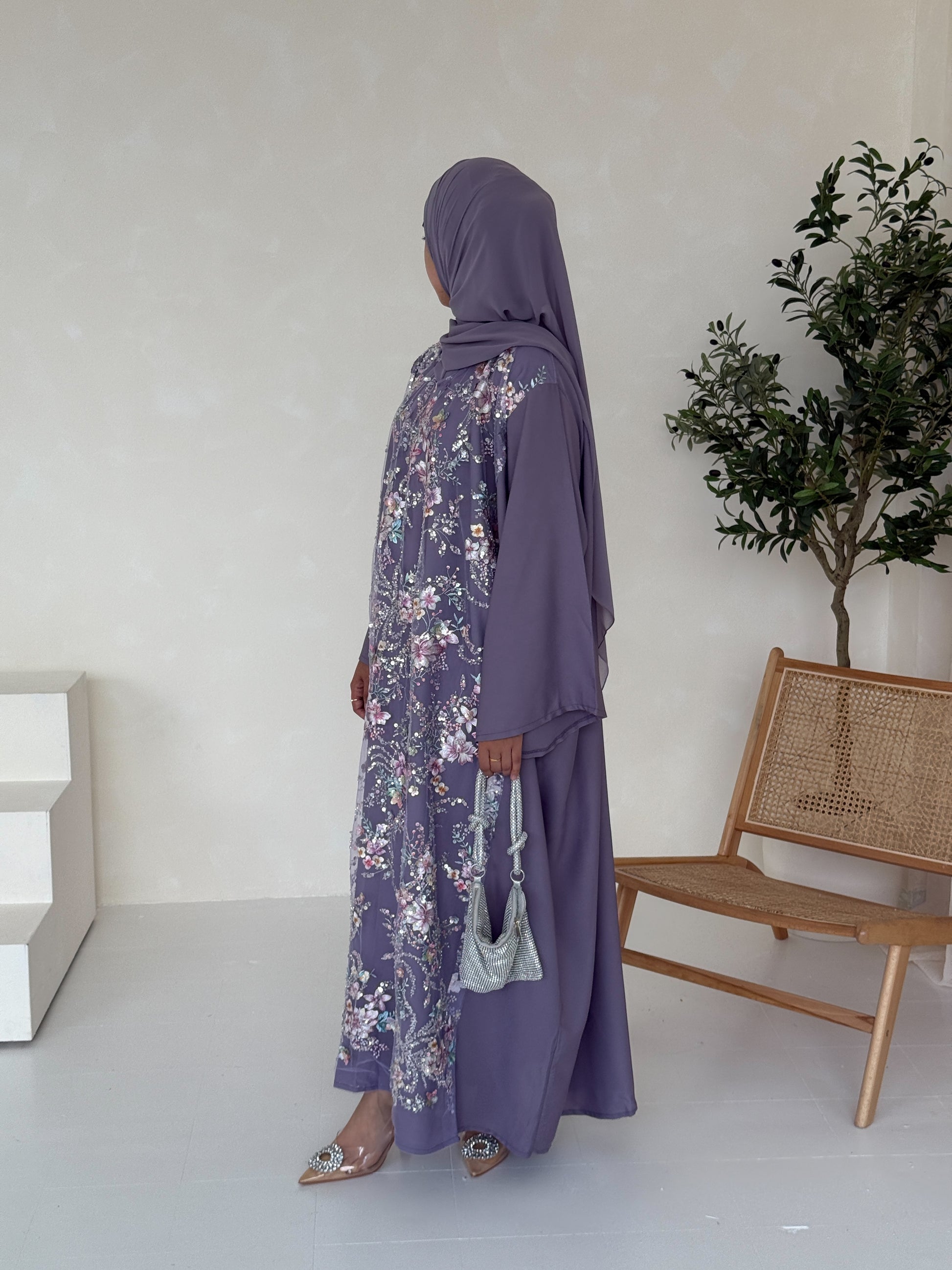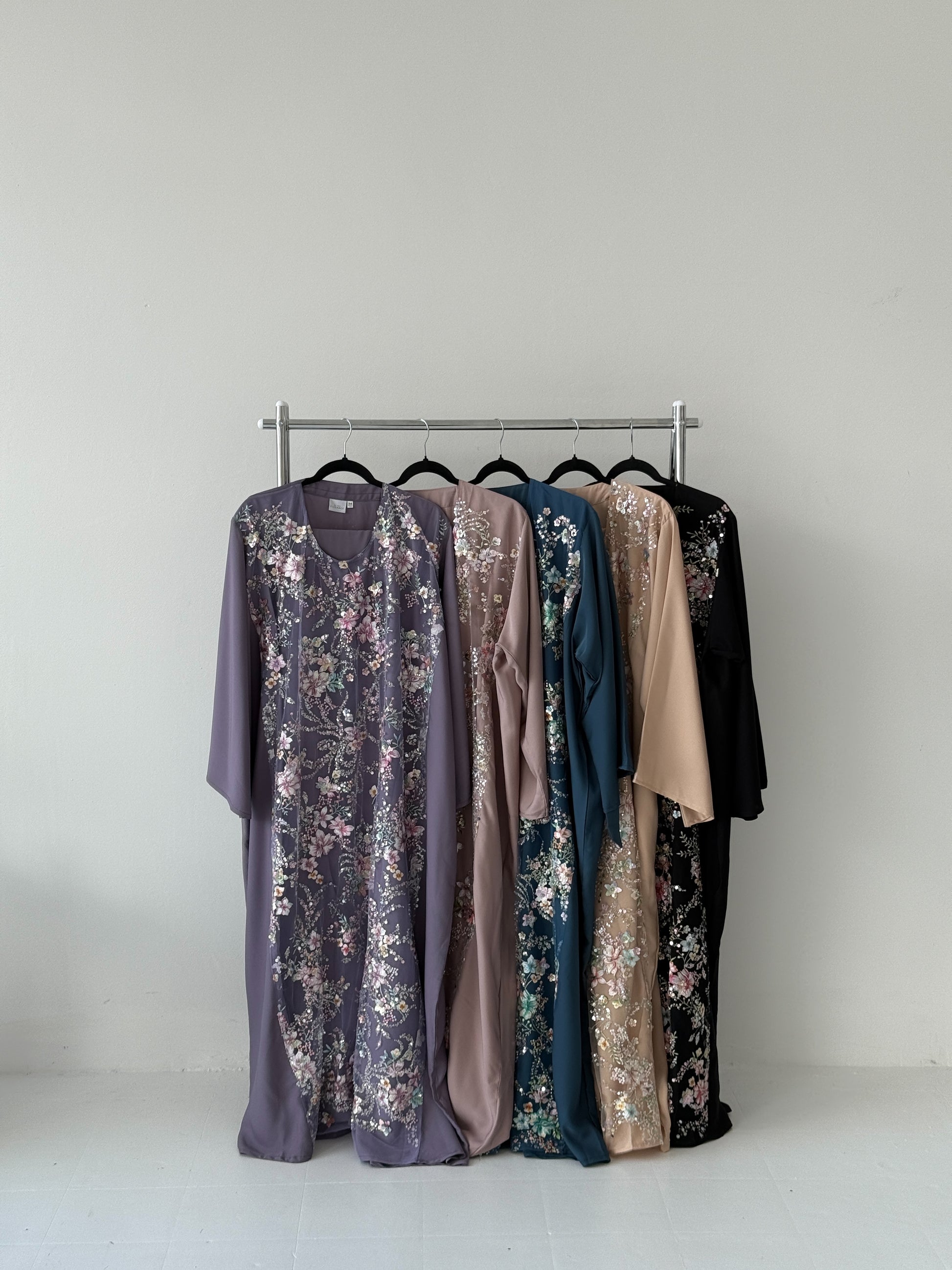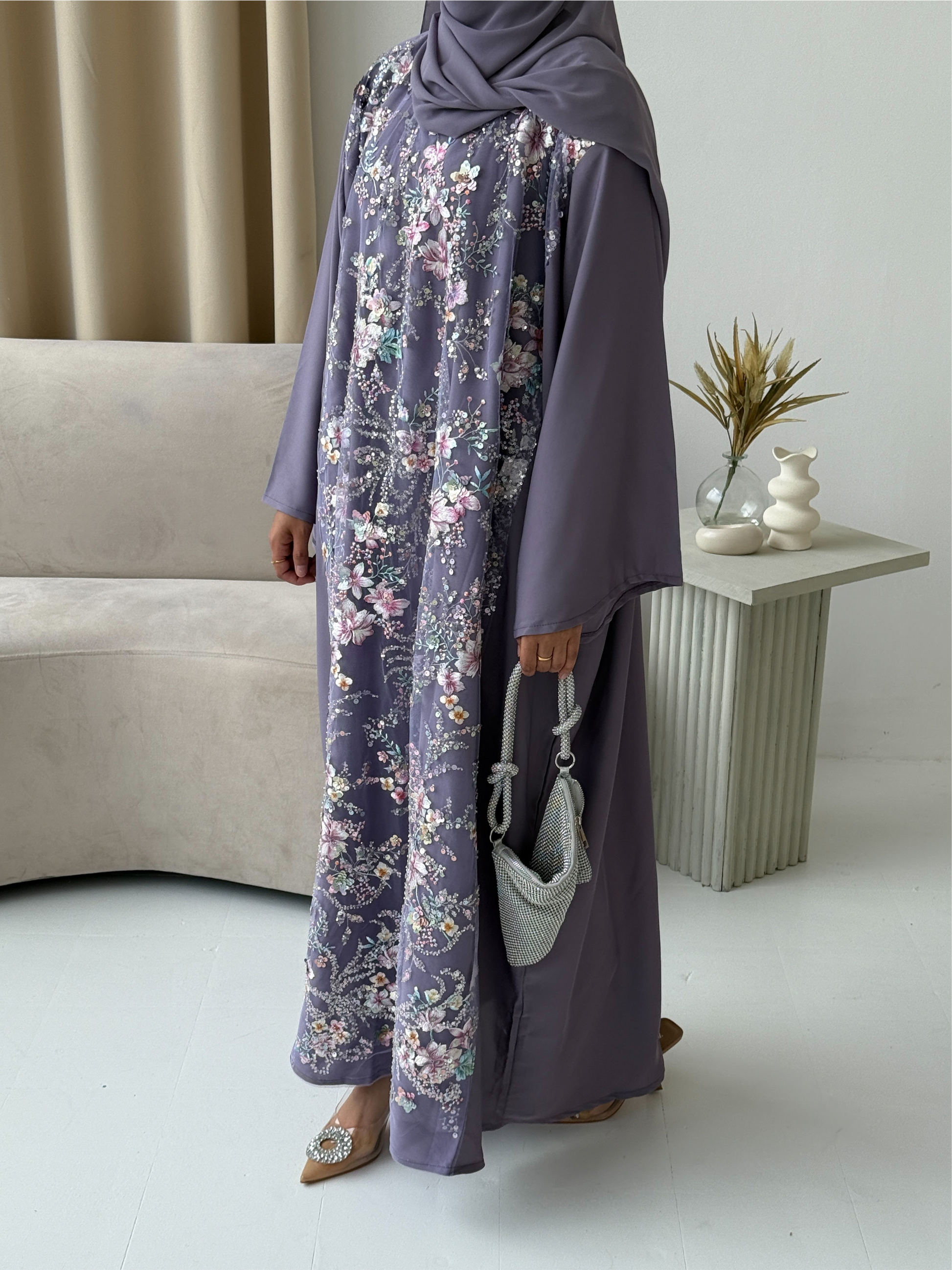 Step into a fairytale with our Botanical Gardens Abaya — a piece that beautifully captures the elegance of blooming gardens and ethereal charm. The front of the Abaya is adorned with a delicate floral sequin net, reminiscent of a tranquil botanical escape, adding a touch of shimmer and grace with every step. Lined with premium Korean Nida for a soft, breathable feel.