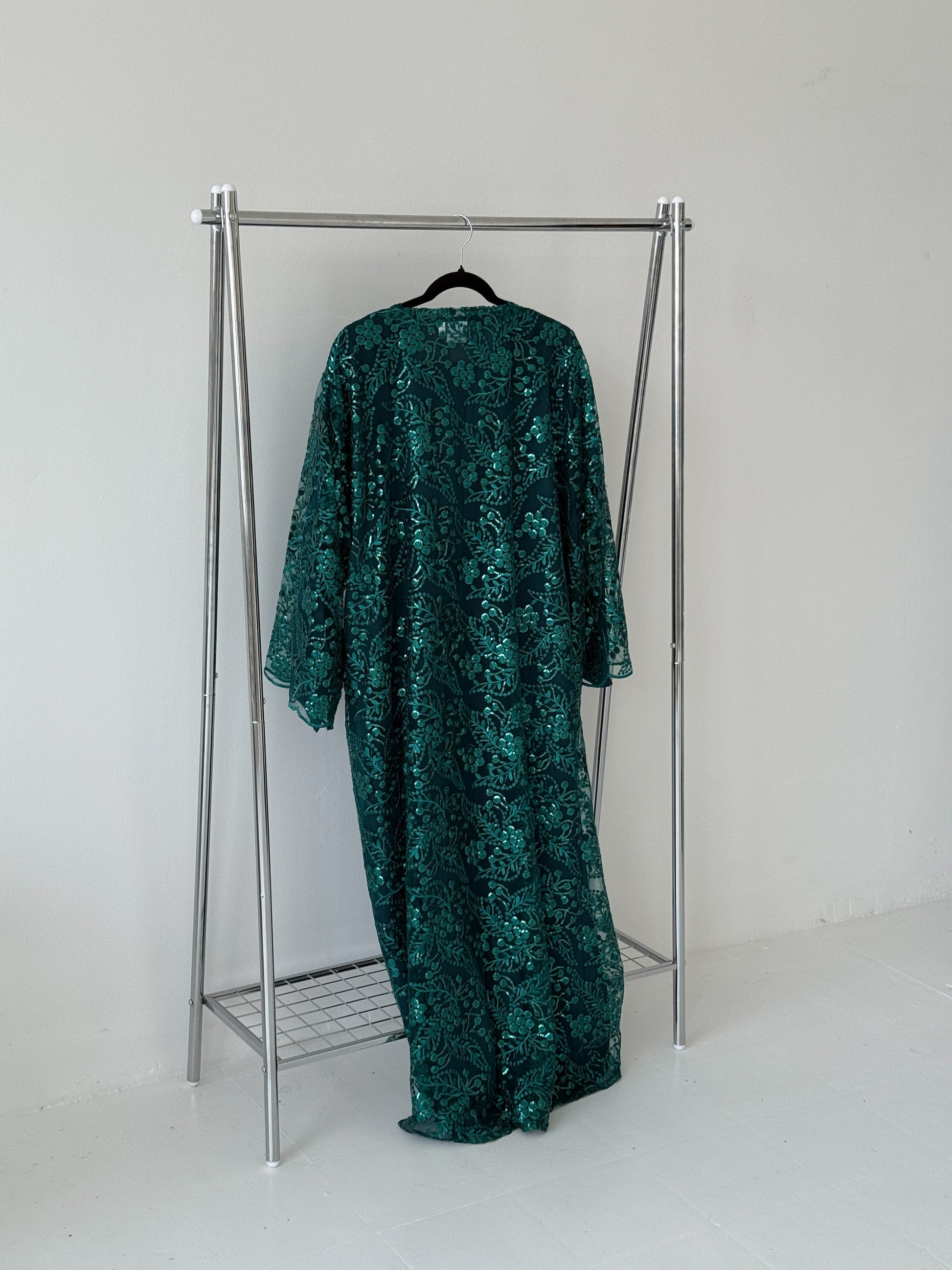 Elevate your wardrobe with this elegant three-piece set, featuring a stunning open net abaya adorned with intricate sequin embroidery that catches the light beautifully. Perfect for Eid and special occasions. The abaya showcases a delicate wave-edge finish on the sleeves, adding a graceful touch. Paired with a Korean Nida slip dress for comfort and coverage, and a complimentary chiffon hijab to complete the look, blending modesty with glamour effortlessly.