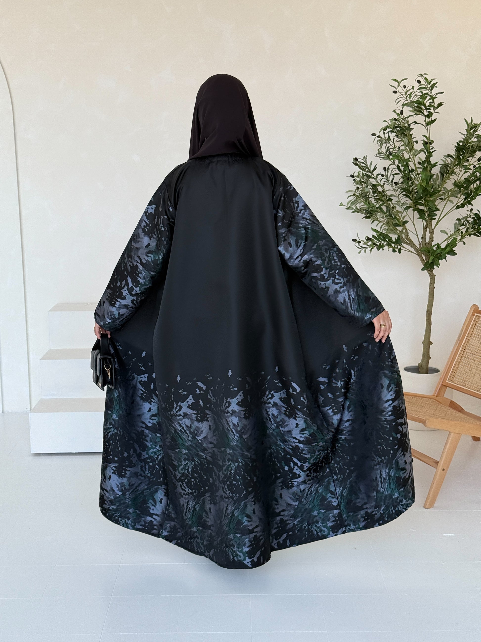 Elevate your Eid look with our stunning open abstract floral burst inspired design. Made from luxury satin jacquard to make a statement with every step. Featuring a beautifully structured silhouette, the slightly stiff fabric adds graceful volume while maintaining a refined look. Tapered sleeves lend a tailored touch. The unique pattern blends deep tones with a vibrant pop of colour from the inner lining, creating a sophisticated contrast that catches the eye.