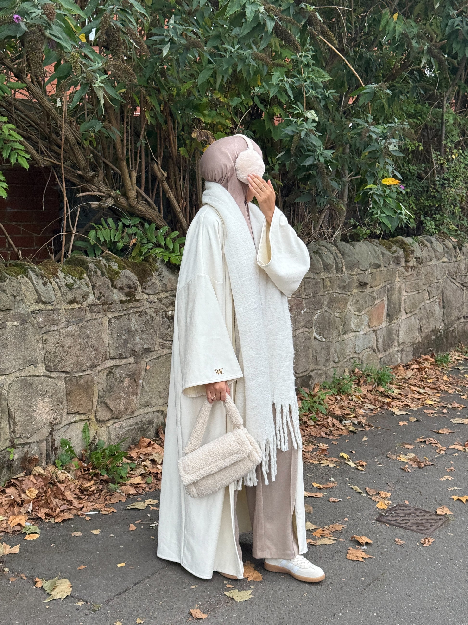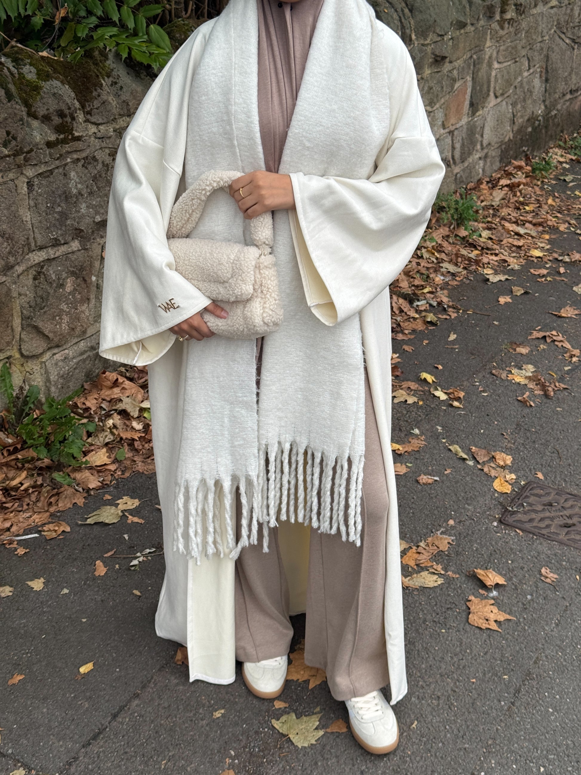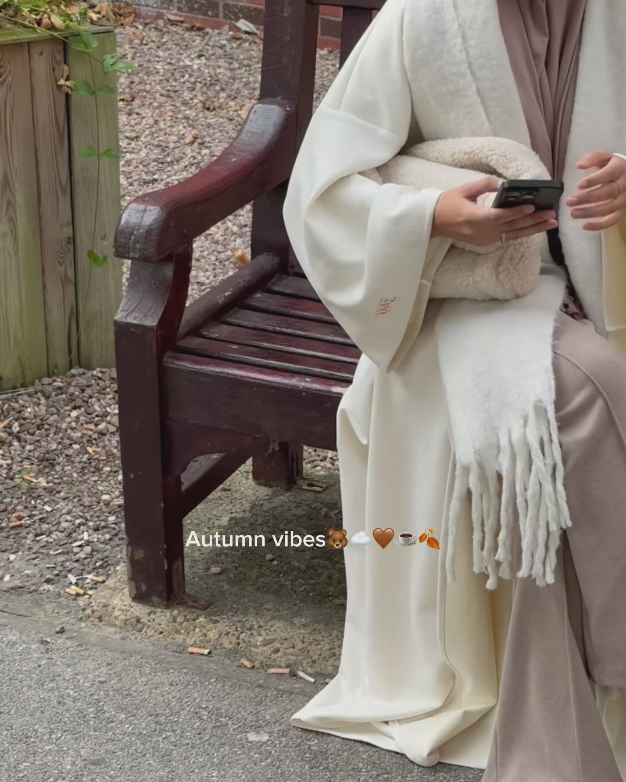 A soft suede abaya in the shade candle cream, perfect for autumn layering. Featuring a relaxed open fit with dropped shoulders, side pockets, and a flowy drape. Finished with our signature WAE metal logo on the sleeve and paired with a matching chiffon hijab.