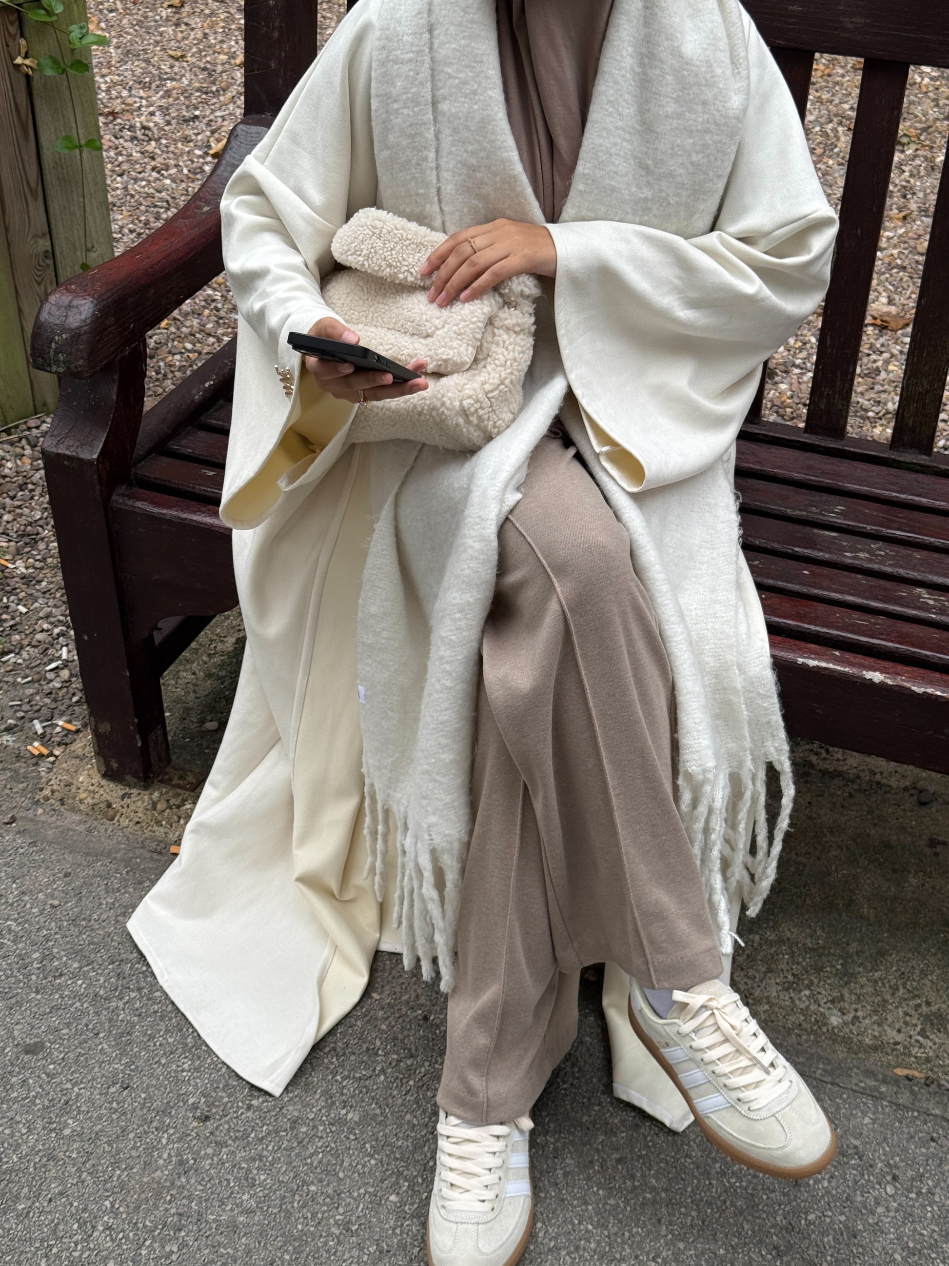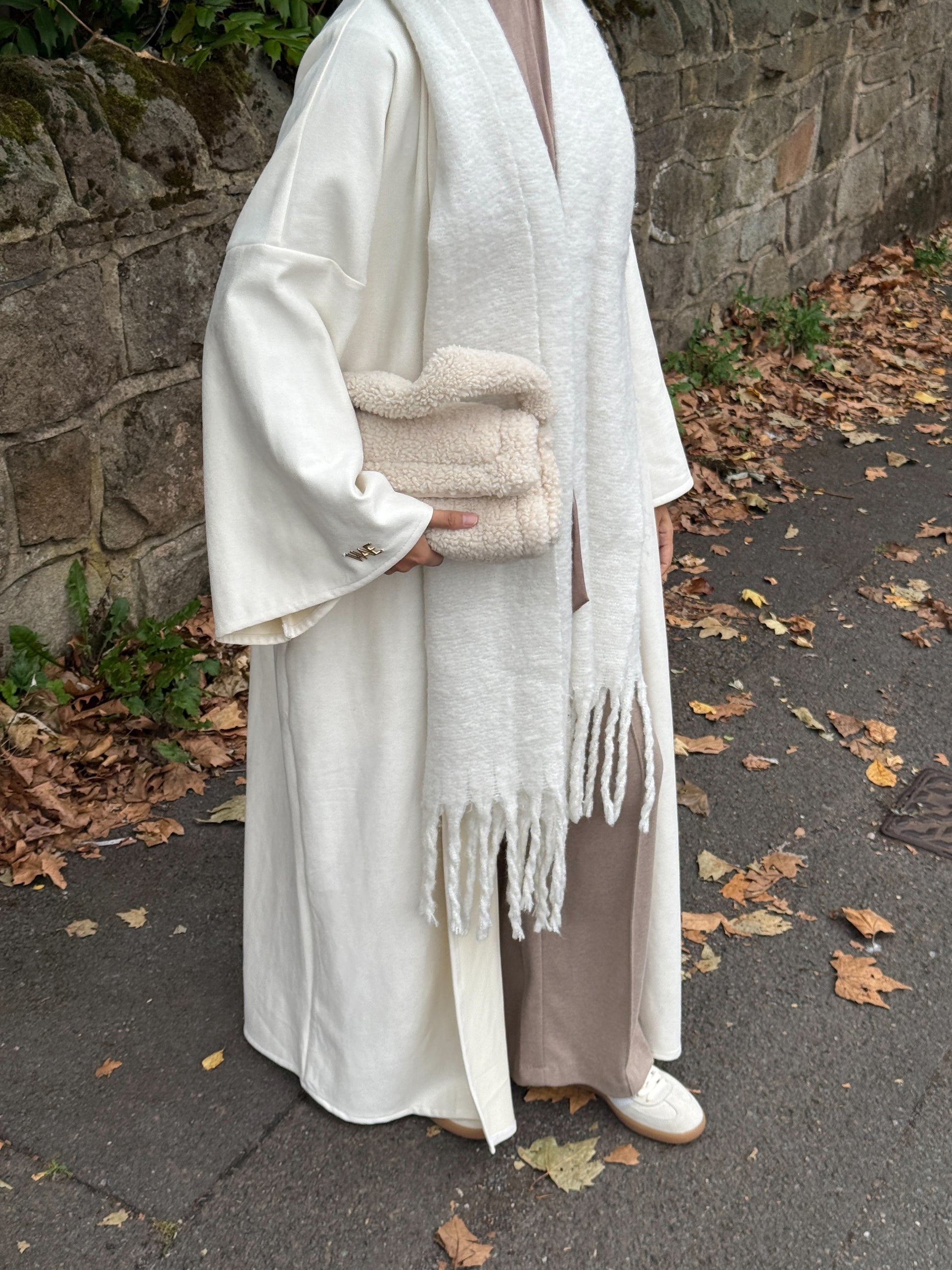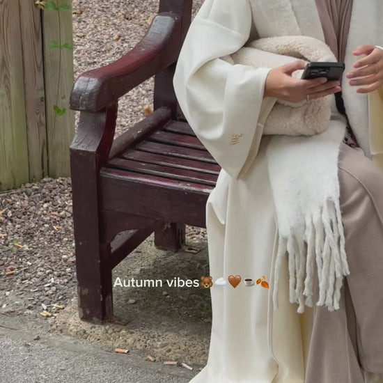A soft suede abaya in the shade candle cream, perfect for autumn layering. Featuring a relaxed open fit with dropped shoulders, side pockets, and a flowy drape. Finished with our signature WAE metal logo on the sleeve and paired with a matching chiffon hijab.