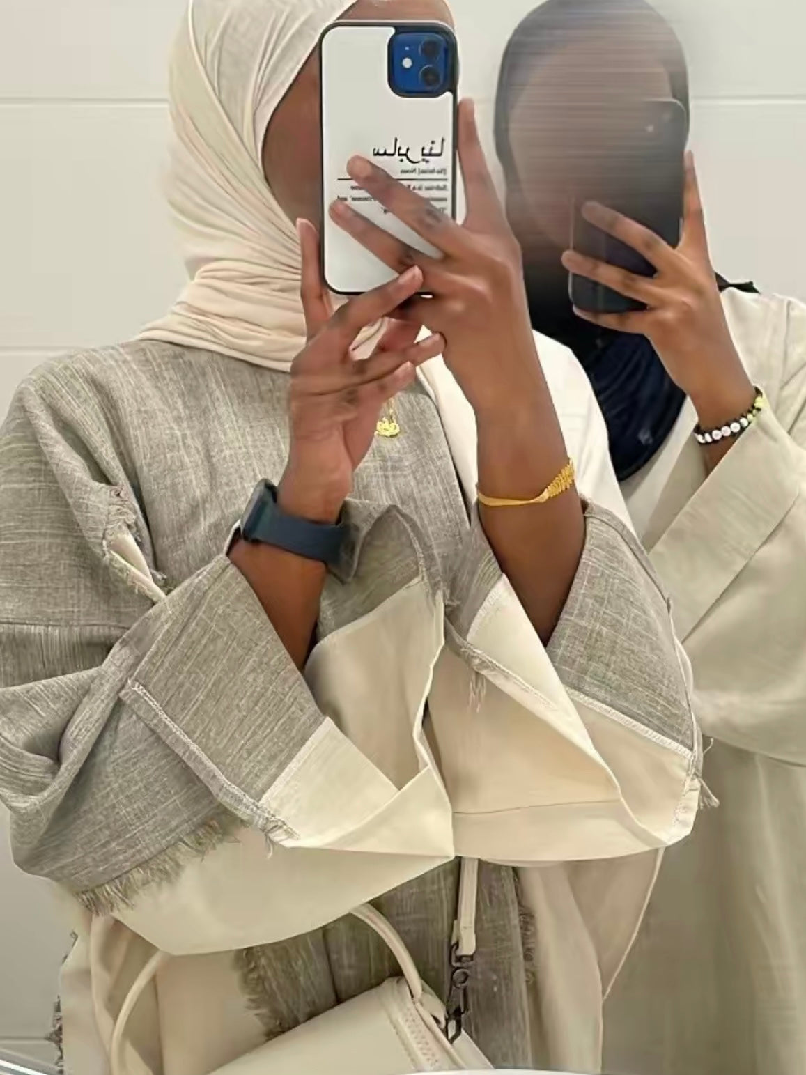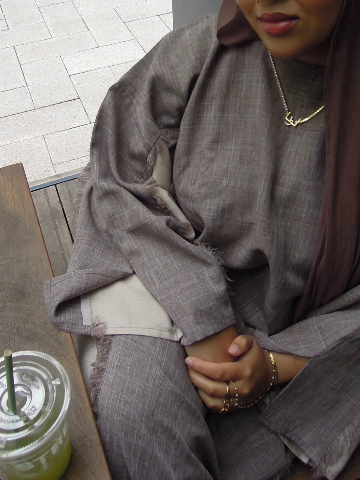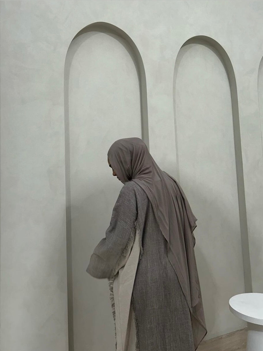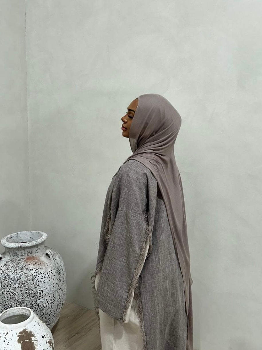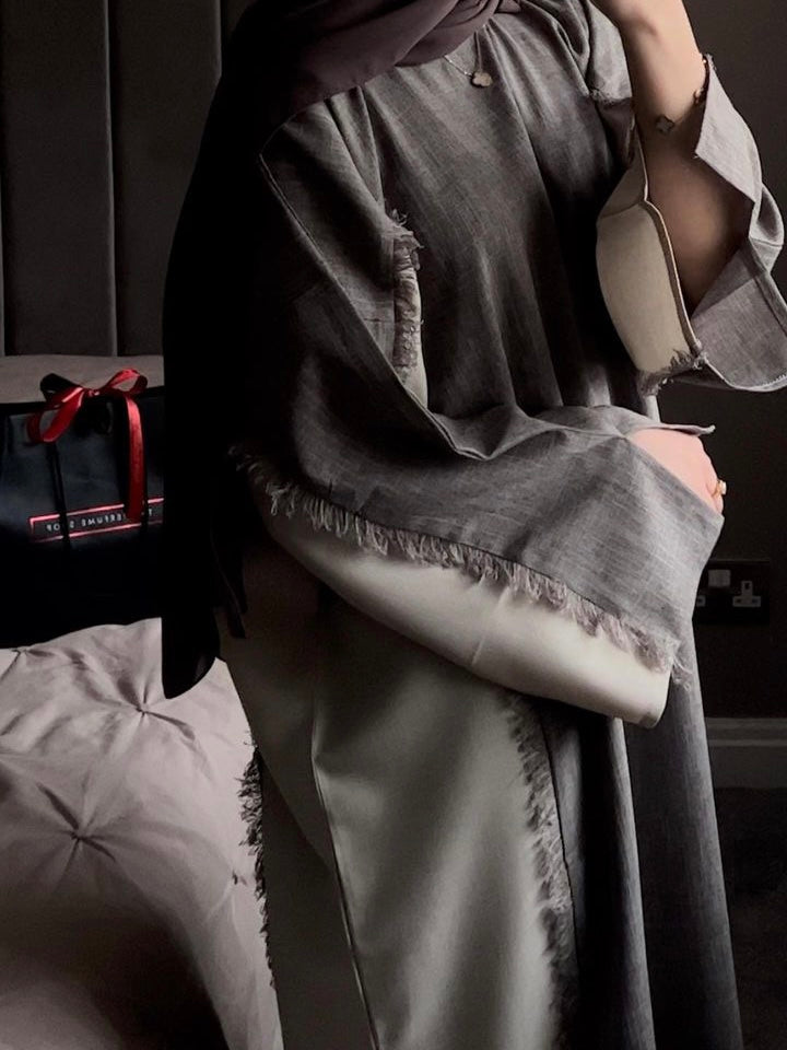 Introducing a closed version of our original ‘two toned frayed abaya’. This unique design has a frayed detail going down the front as well as the sleeves and back. It also has a split arm design giving it a chic and stylish look. Loose underarms to create a slight oversized look. Comes with a complimentary Korean chiffon hijab. Made from premium hard linen.