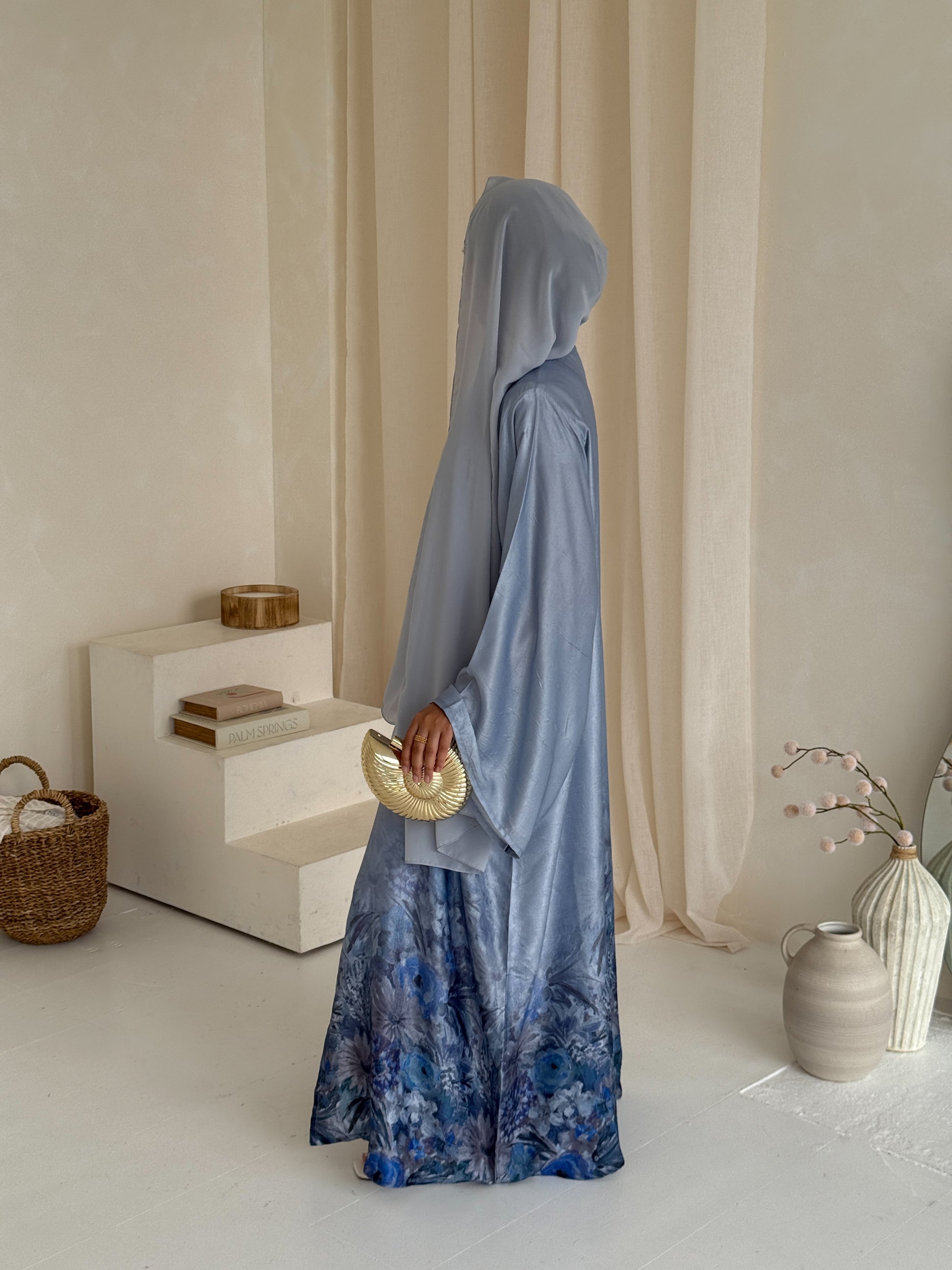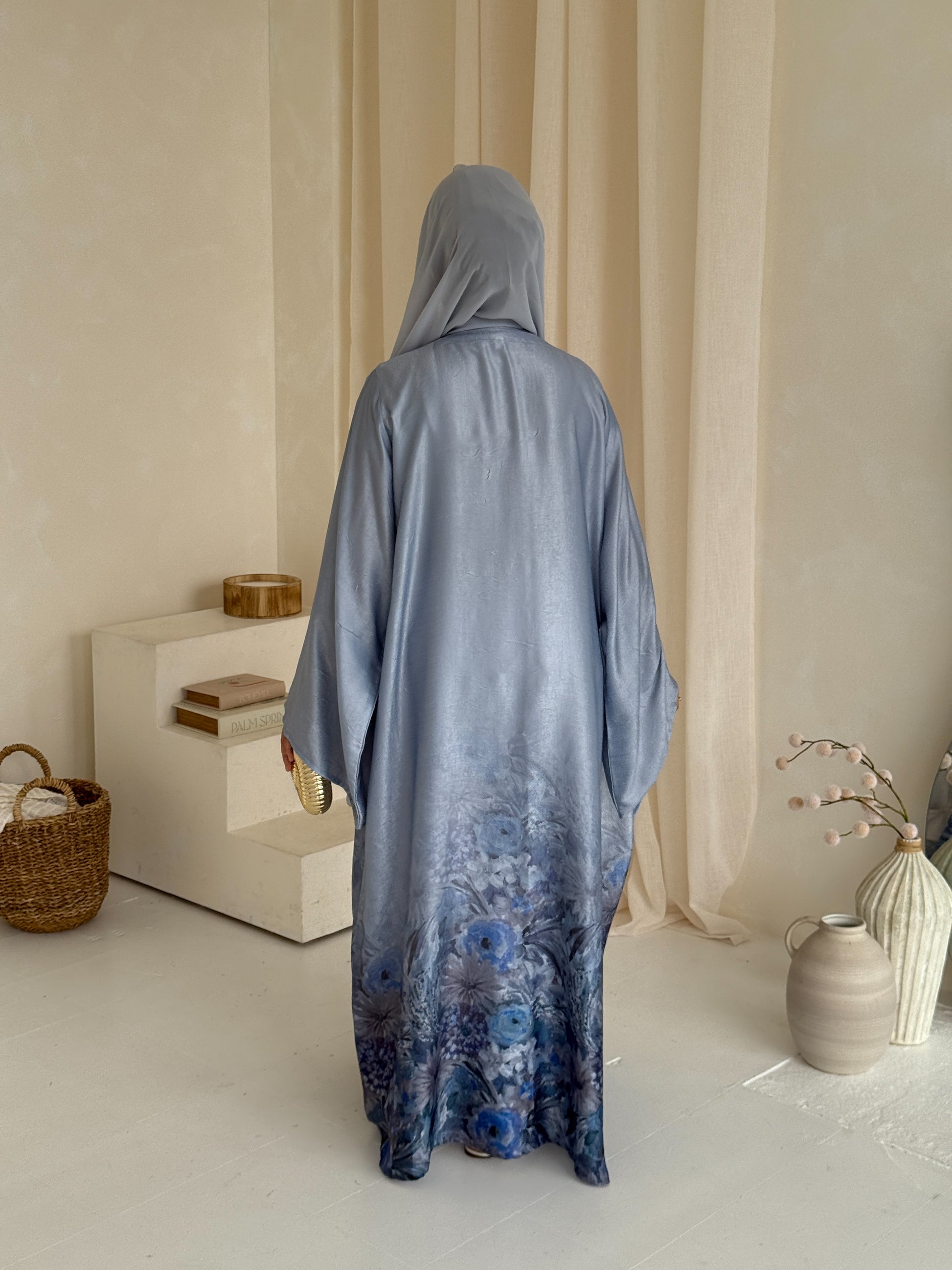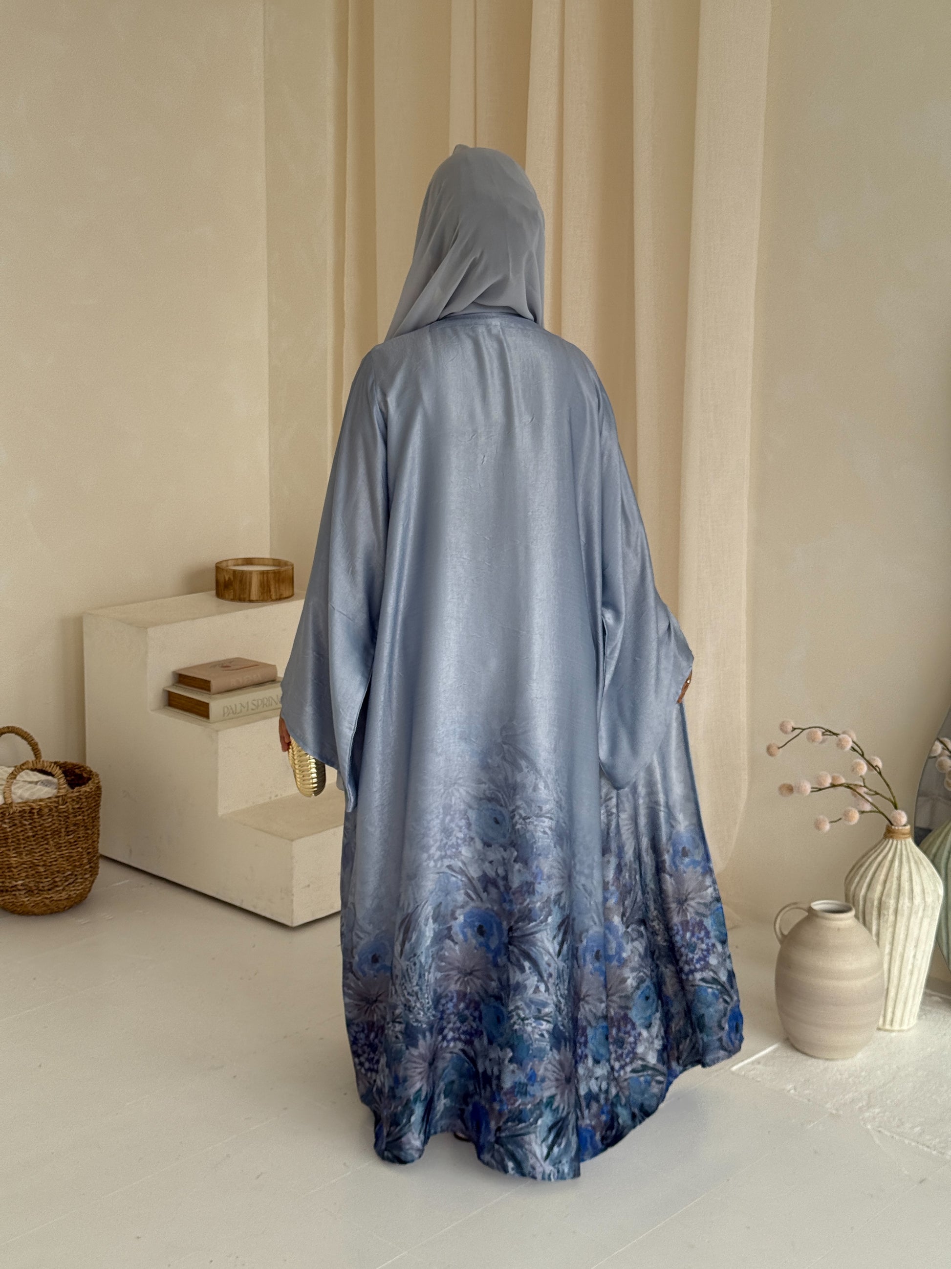 Ethereal Bloom Abaya, crafted from a luxurious velvet satin that feels buttery soft against the skin. Inspired by the delicate beauty of blooming gardens, this nature-inspired design features painterly floral details cascading gracefully along the hem, creating a dreamy, ethereal finish.