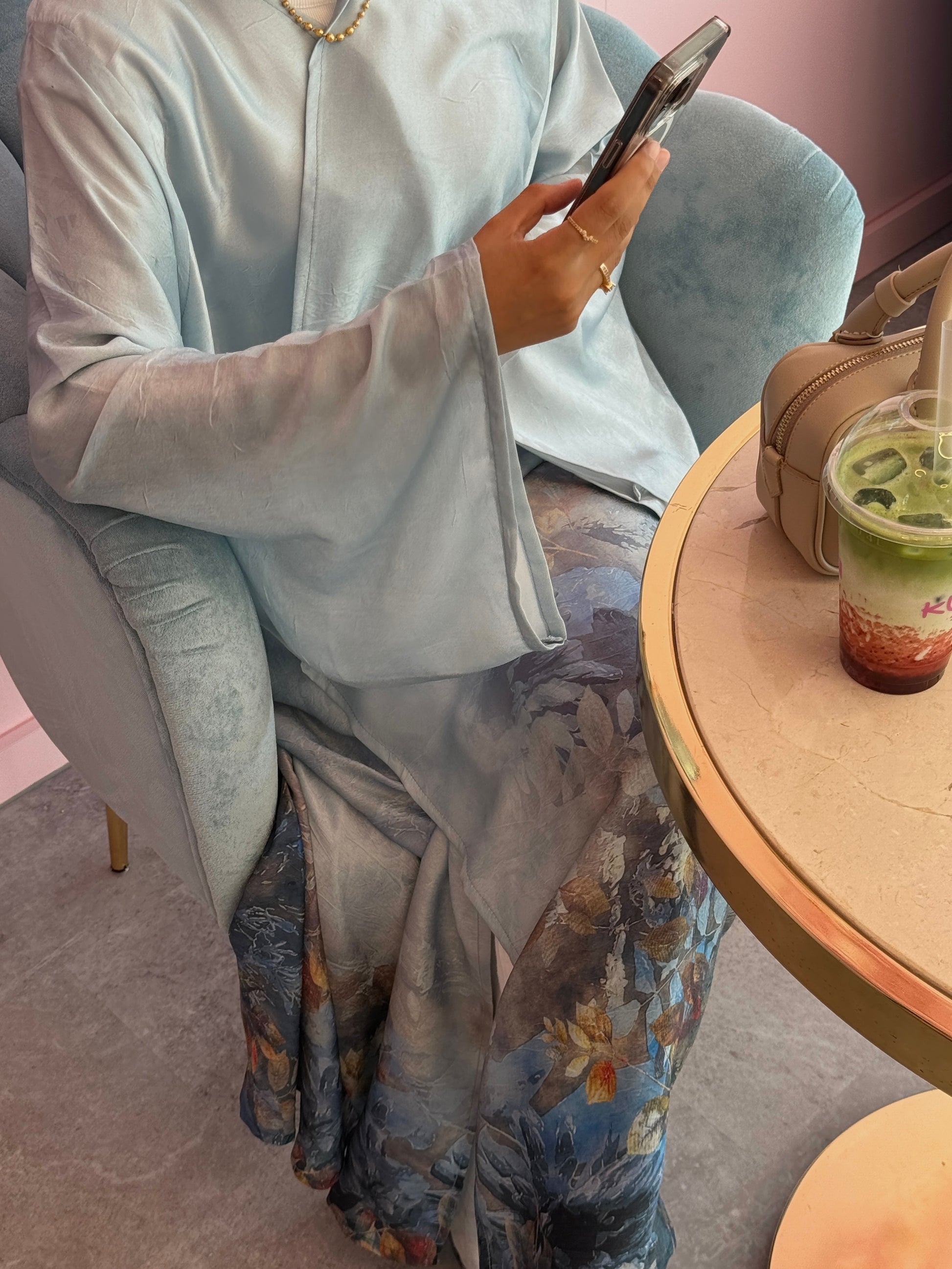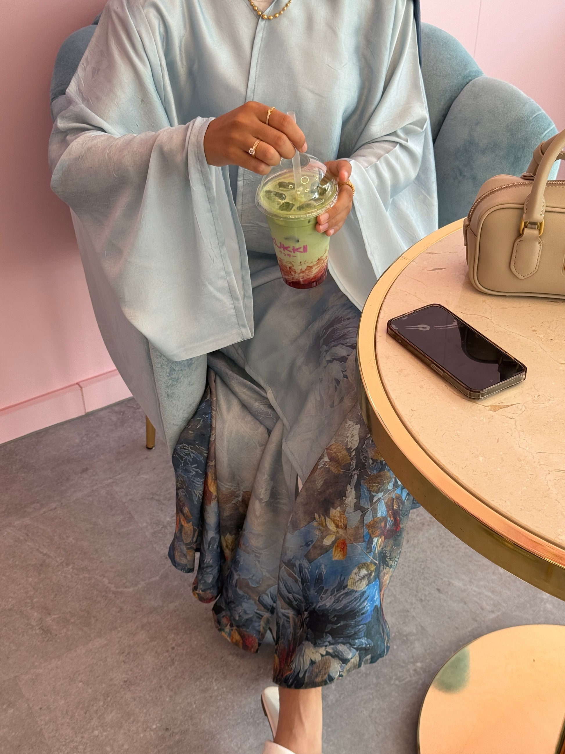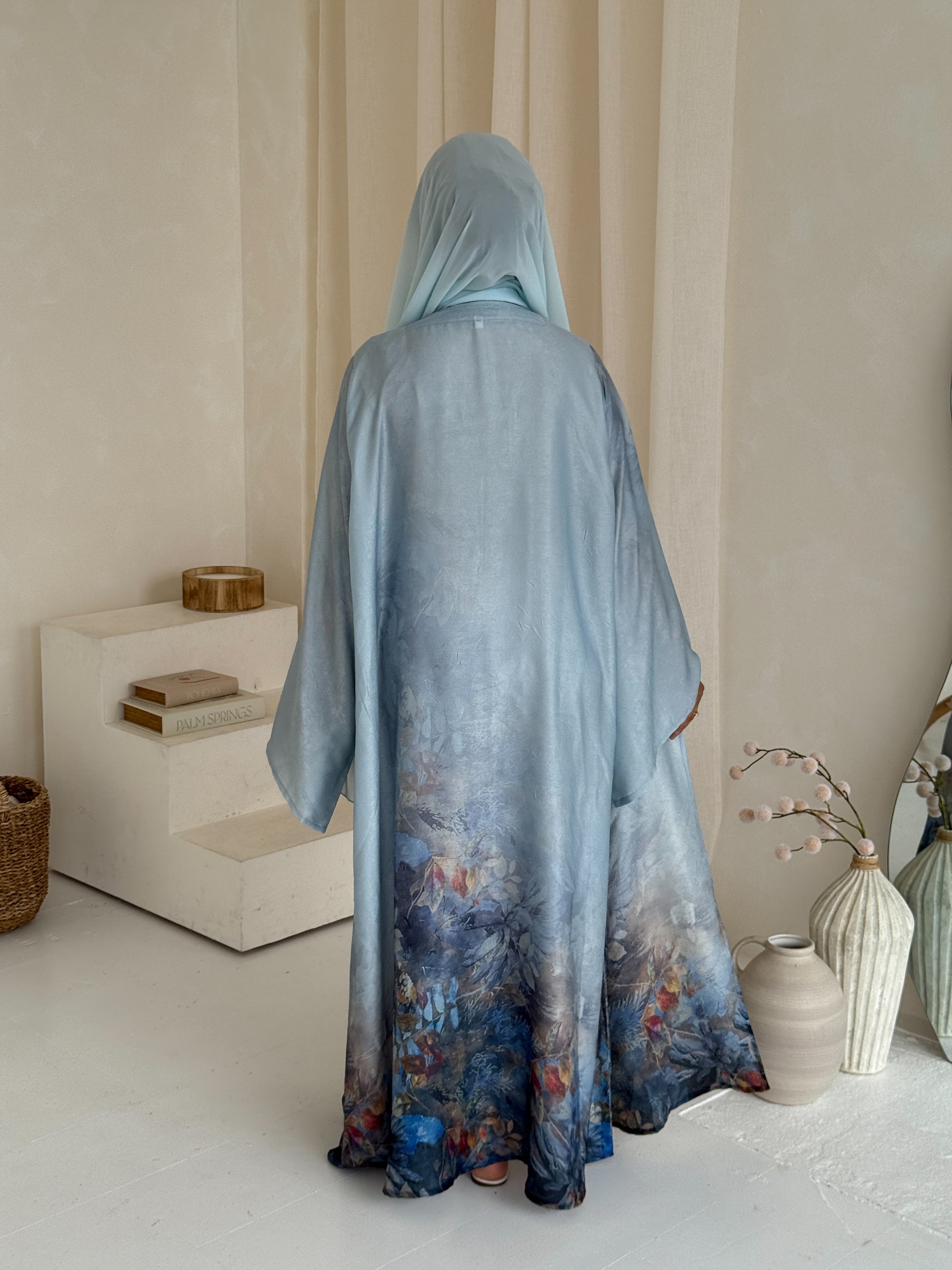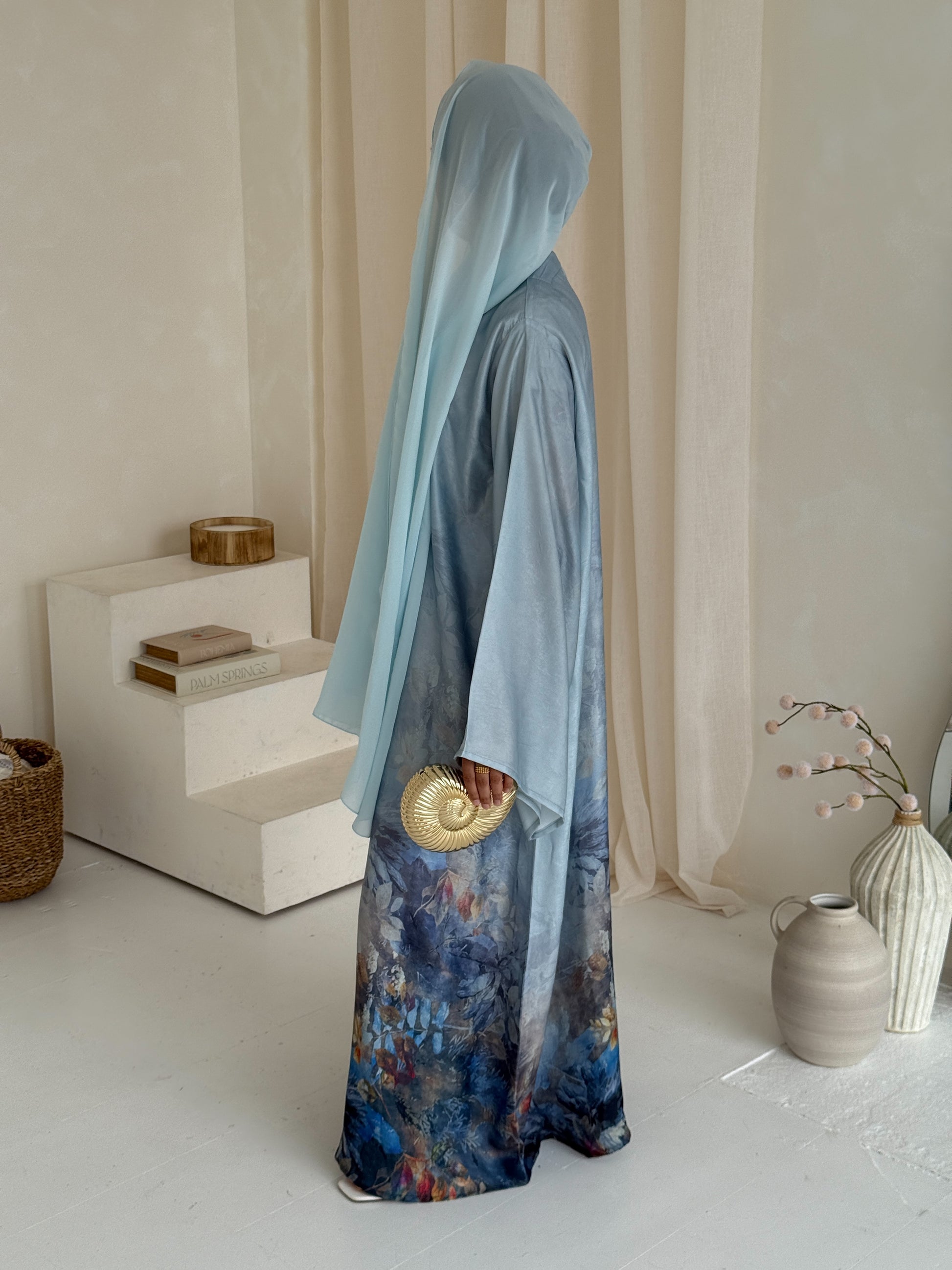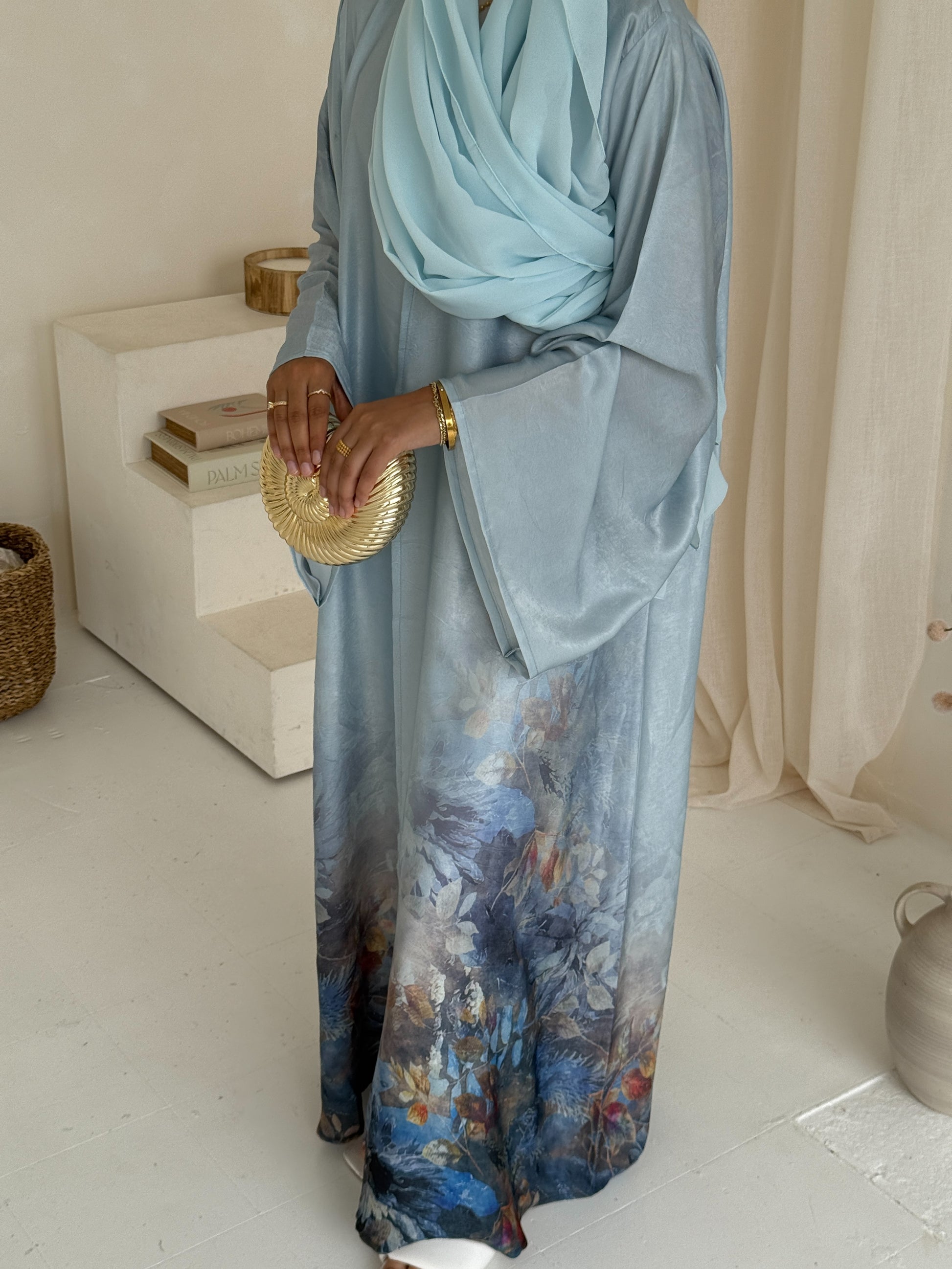 Ethereal Bloom Abaya, crafted from a luxurious velvet satin that feels buttery soft against the skin. Inspired by the delicate beauty of blooming gardens, this nature-inspired design features painterly floral details cascading gracefully along the hem, creating a dreamy, ethereal finish.
