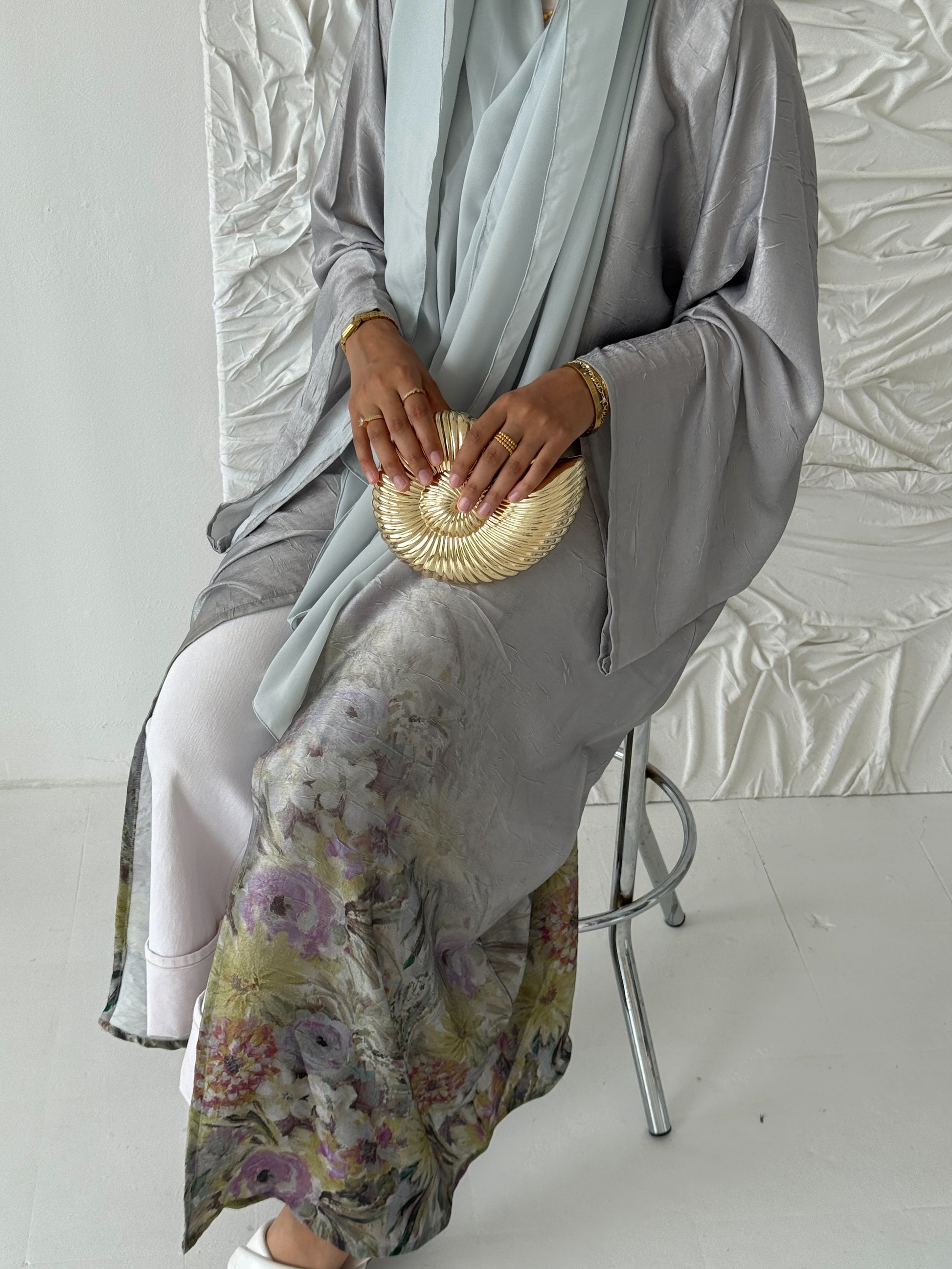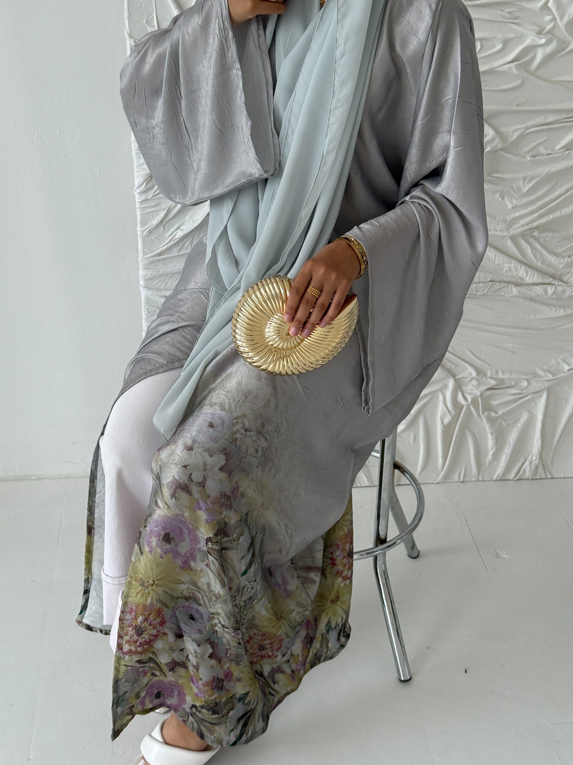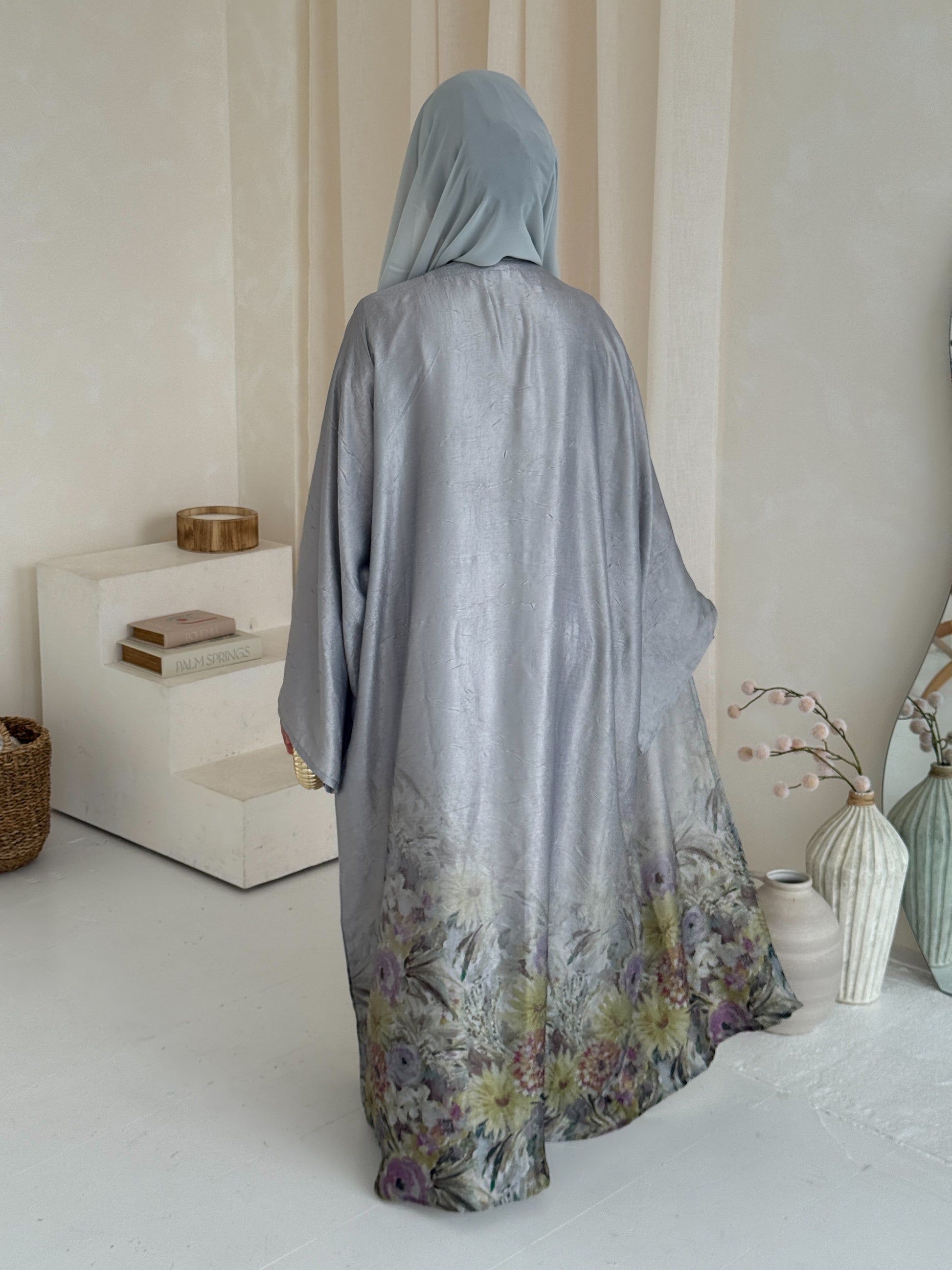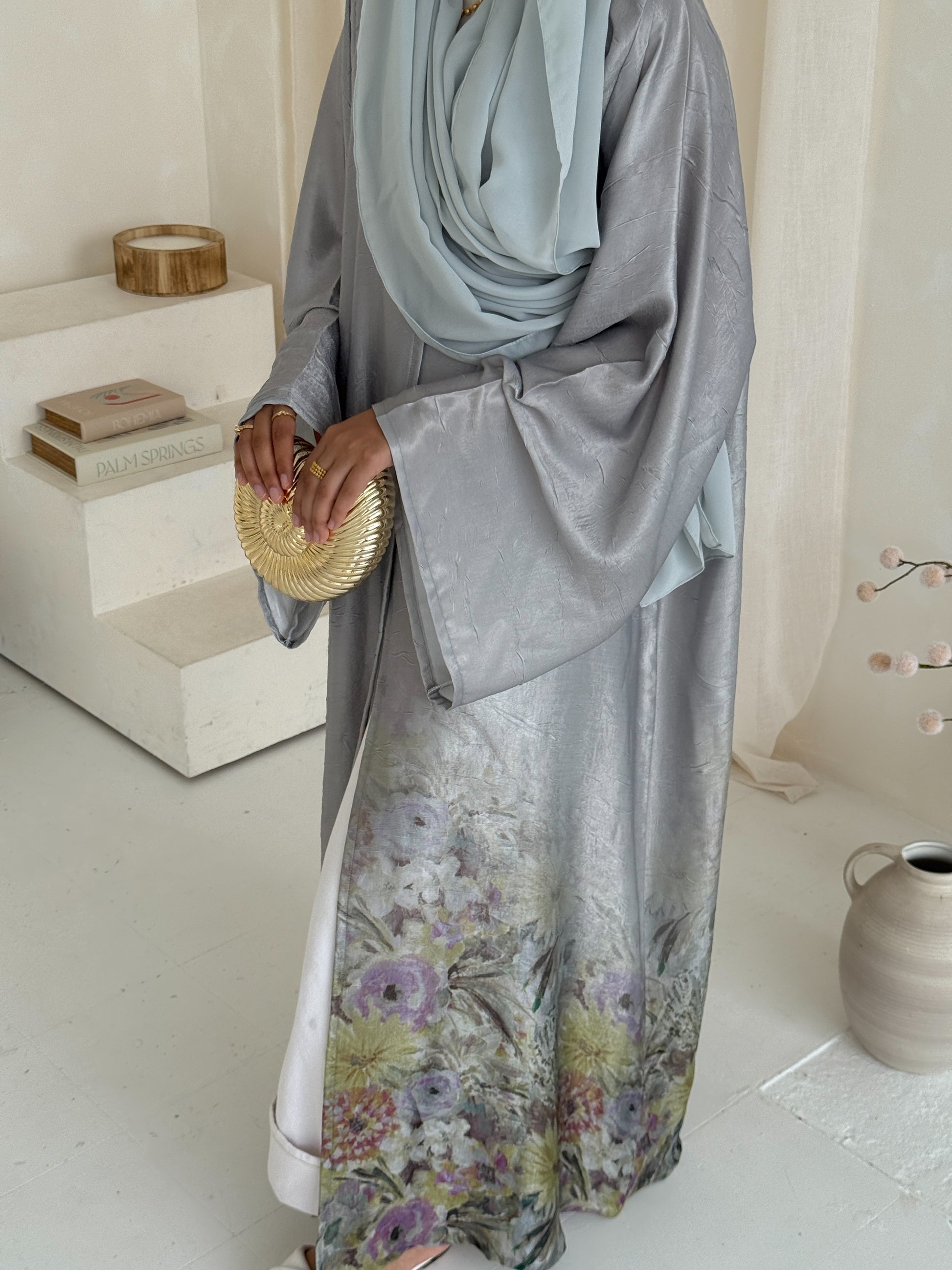 Ethereal Bloom Abaya, crafted from a luxurious velvet satin that feels buttery soft against the skin. Inspired by the delicate beauty of blooming gardens, this nature-inspired design features painterly floral details cascading gracefully along the hem, creating a dreamy, ethereal finish.