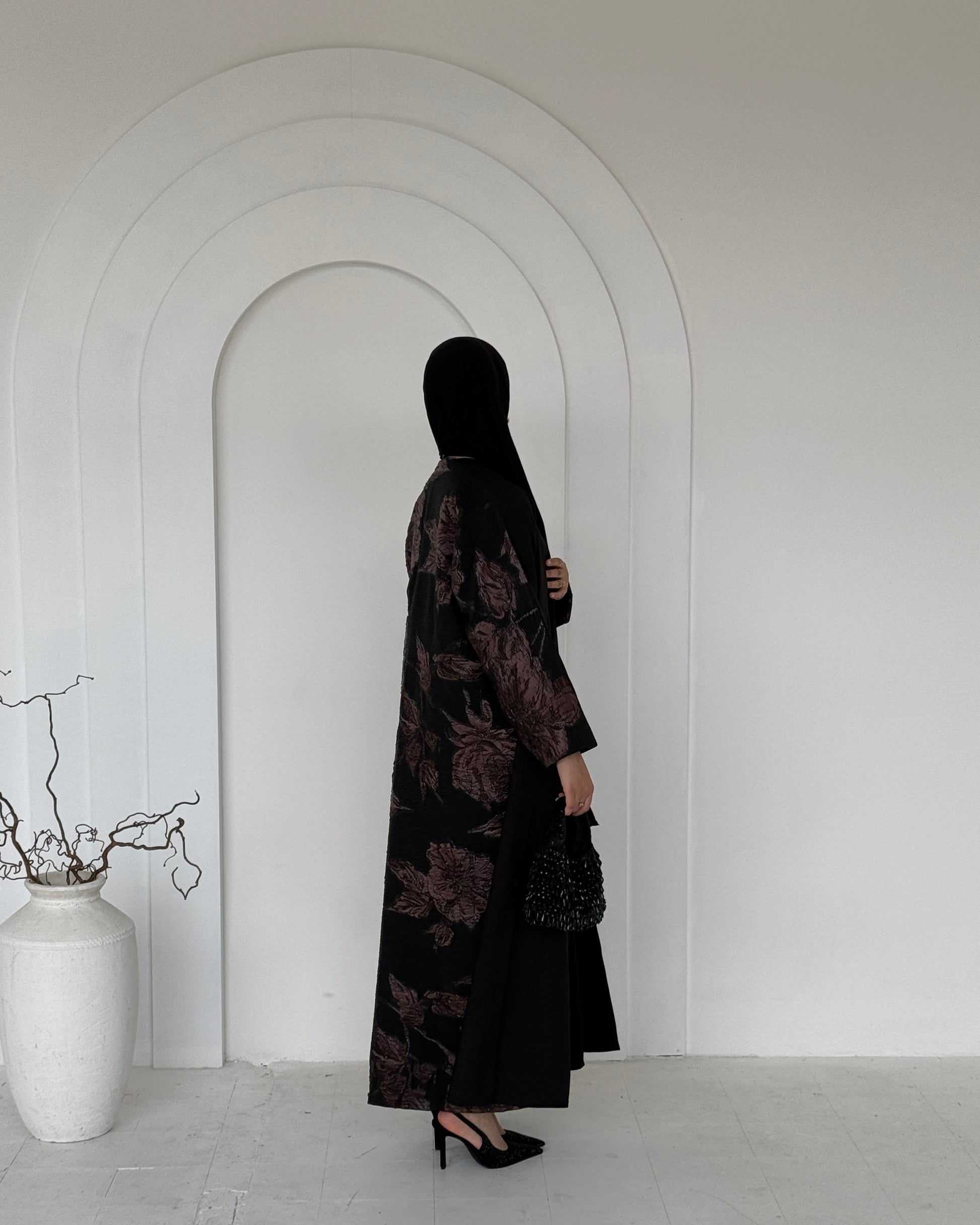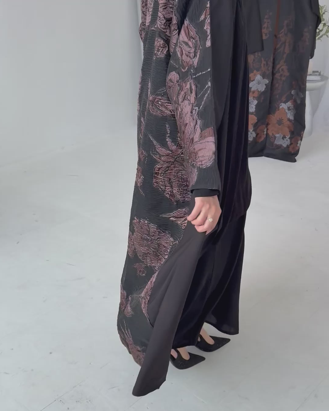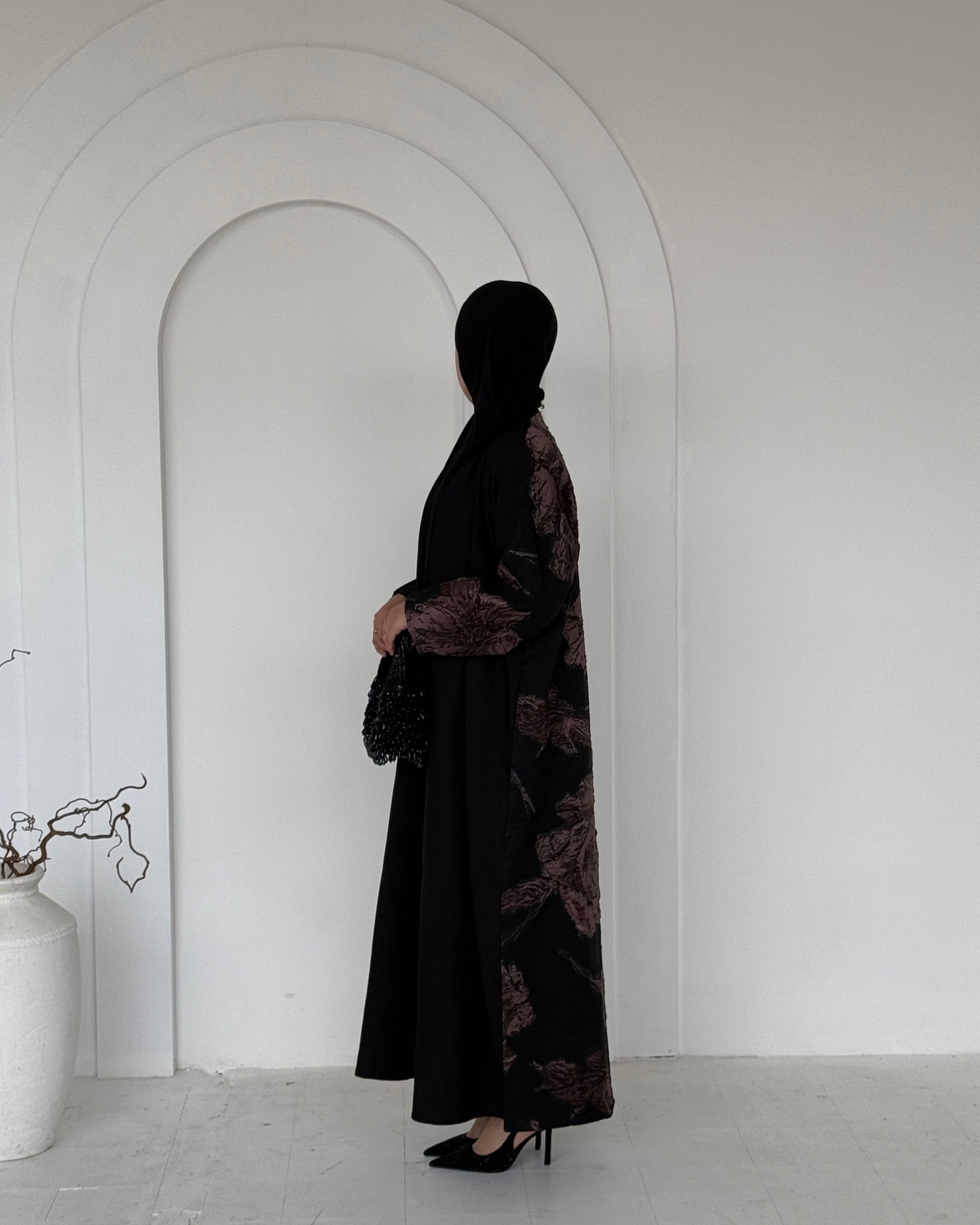 This luxurious open abaya is crafted from a gorgeous thick fabric for a smooth, comfortable and high-quality finish. Beautifully drapes to create an elegant silhouette. The back of the abaya features a striking crinkle textured rose gold organza floral design. Tapered sleeves for a smart look. Comes with a complimentary premium Korean chiffon hijab. With its buttonless, flowy silhouette, this abaya blends modern sophistication with timeless grace.