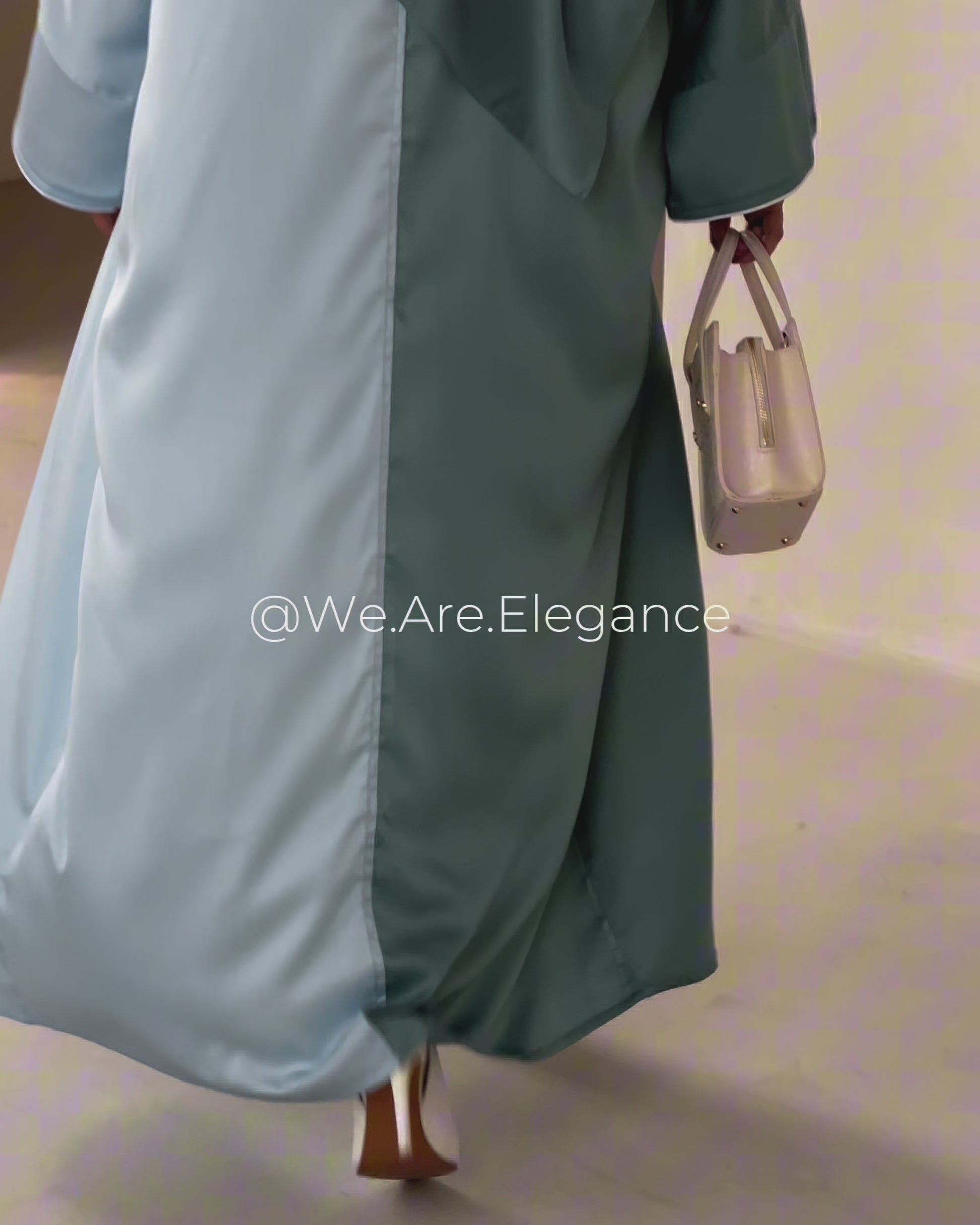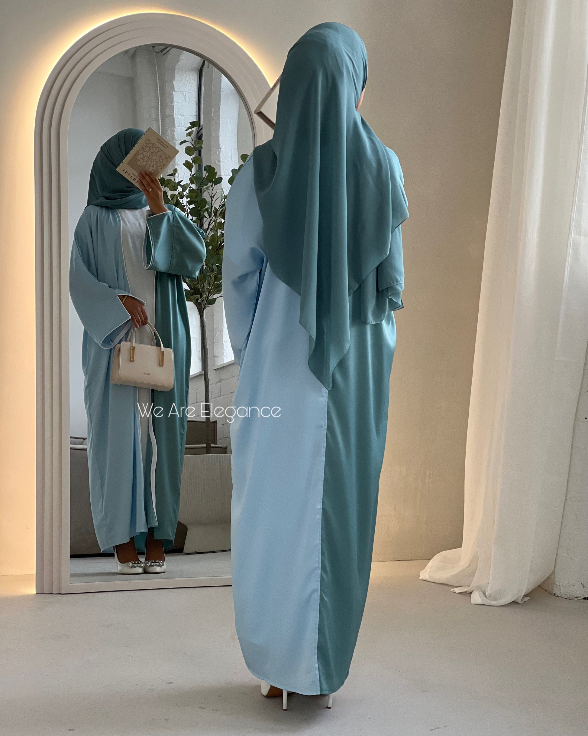 Crafted from premium candy crepe satin, this abaya offers a soft, flowing silhouette with a gorgeous satin finish. A unique half-and-half wave design with two harmonious shades of a gorgeous aqua ocean blue. The complementary shades create a stylish look perfect for any occasion. The inner sides of the abaya are a wavy cut with white piping along the edge. The split sleeves also feature white piping. This open abaya comes with a complimentary premium Korean chiffon hijab to complete your look.